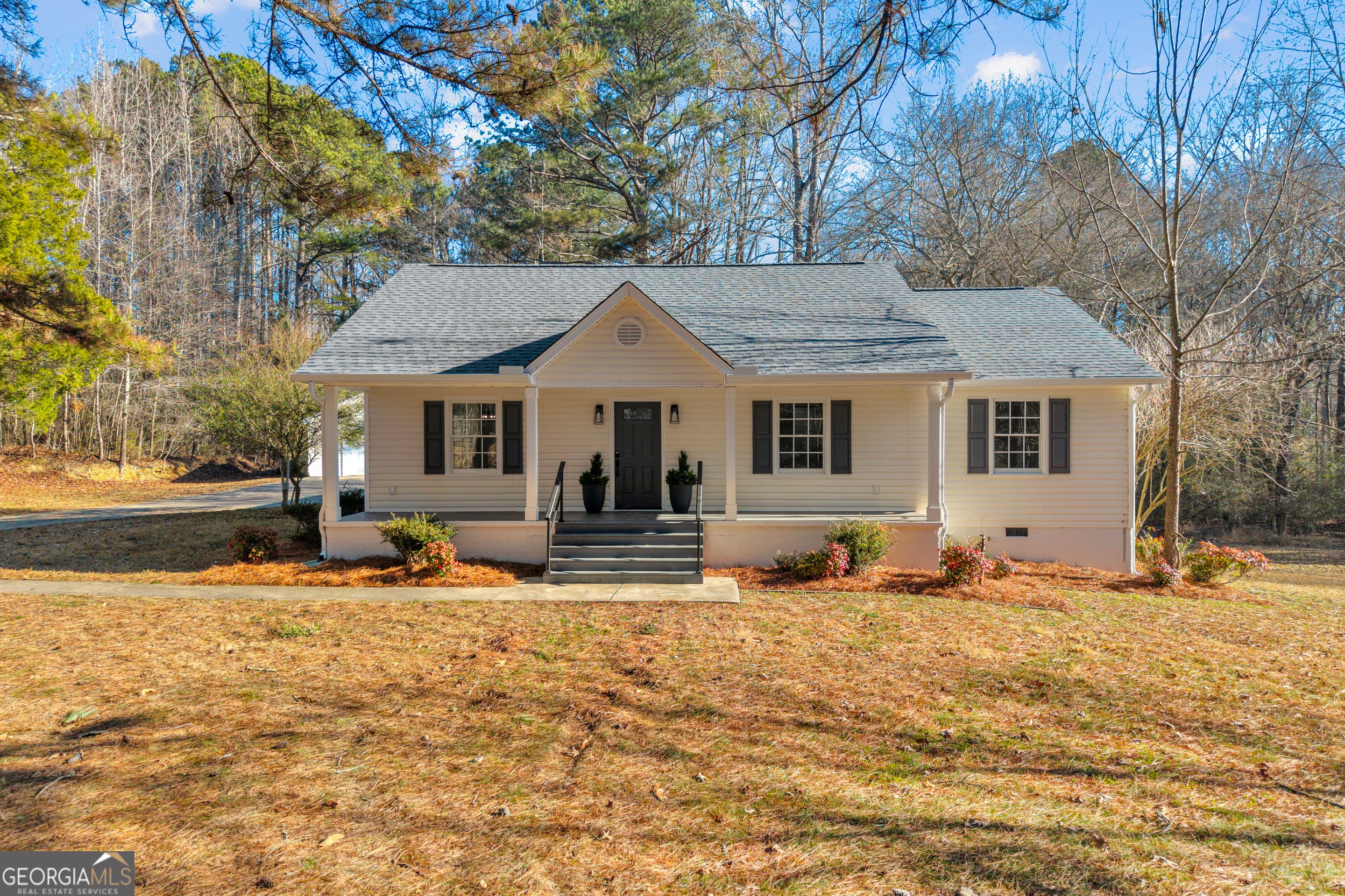Tucked away on 2.4+- level, private acres in a highly desirable pocket of Paulding County, this sprawling, completely renovated, 3BR/2BA ranch delivers the rare combo everyone wants; peaceful space to breathe and easy access to highways, shopping, and schools. Built in 1998 and beautifully renovated from top to bottom, this home feels fresh, open, and move-in ready the moment you walk in. The floor plan has been thoughtfully improved with opened walls for better flow and livability. The entire interior shines with premium Sherwin-Williams paint on walls, ceilings, and trim. Throughout the home, you'll love the clean, modern look of high-quality LVP flooring; durable, stylish, and perfect for everyday living. The heart of the home is the brand-new kitchen, featuring 42" cabinetry, quartz countertops, stainless steel appliances, and all-new lighting and plumbing fixtures. The new expansive island is a perfect workspace, ready for morning coffee, weeknight dinners, and weekend entertaining. The walk in pantry has new shelving and will hold everything that you can imagine. Both bathrooms have a crisp, modern feel with new vanities and toilets, resurfaced tubs, and new fixtures. The big-ticket updates are done too: new HVAC and thermostat, new and repaired supply lines, a new water heater, and plumbing and electrical system repairs/updates throughout. Even the small details are handled; new outlets, switches, covers, shelving, doors, and door hardware. Up top, there's a brand-new architectural roof on both the home and the detached garage, plus new 6" gutters and downspouts on the home. Outside, enjoy the setting you've been looking for; private, level land with a refreshed outdoor living space. The deck has been repaired and completely resurfaced and the home pressure washed. All exterior surfaces have been painted, including windows, trim, front porch and entry steps. The expansive two car garage is bolstered by an oversized one car garage that's a perfect workshop. It has a dedicated electrical service and additional expansion or storage space above. A covered area to the rear provides excellent protected outdoor storage. The grounds have been cleaned up and fresh pine straw installed in all flower beds. This is the place to bring all of the toys, plenty of room for everyone and everything. If you've been waiting for a renovated, affordable home on acreage with a convenient location that keeps you connected, this is the one!