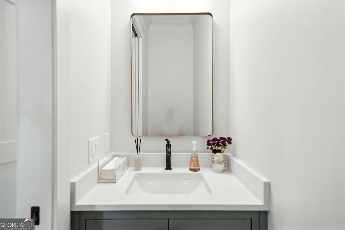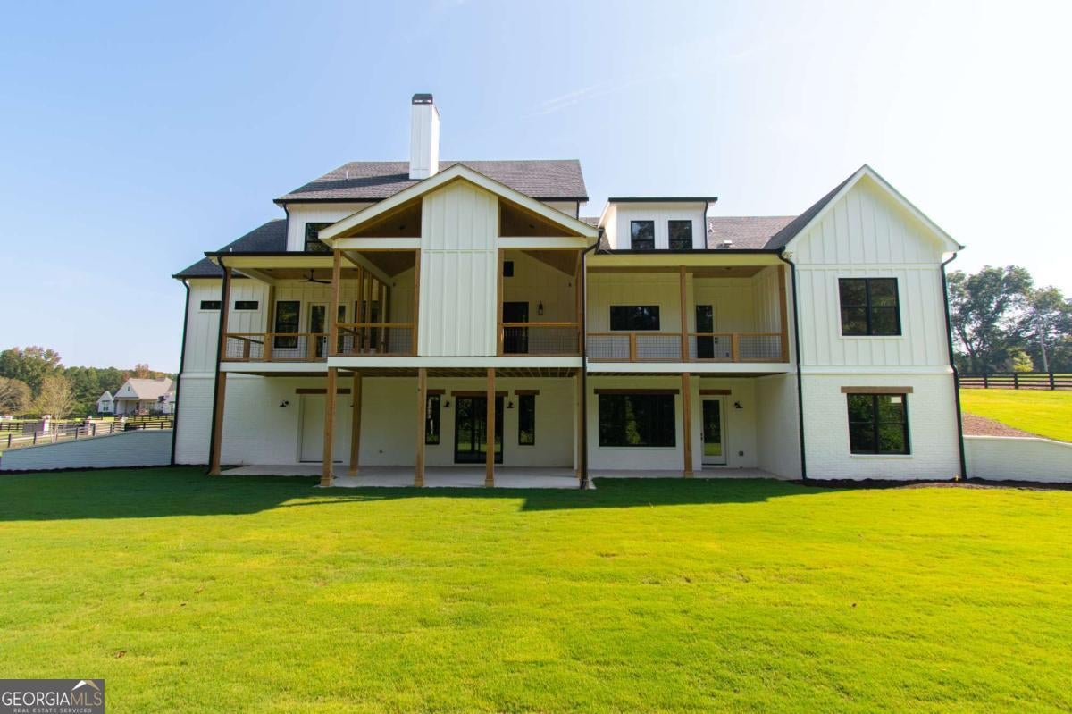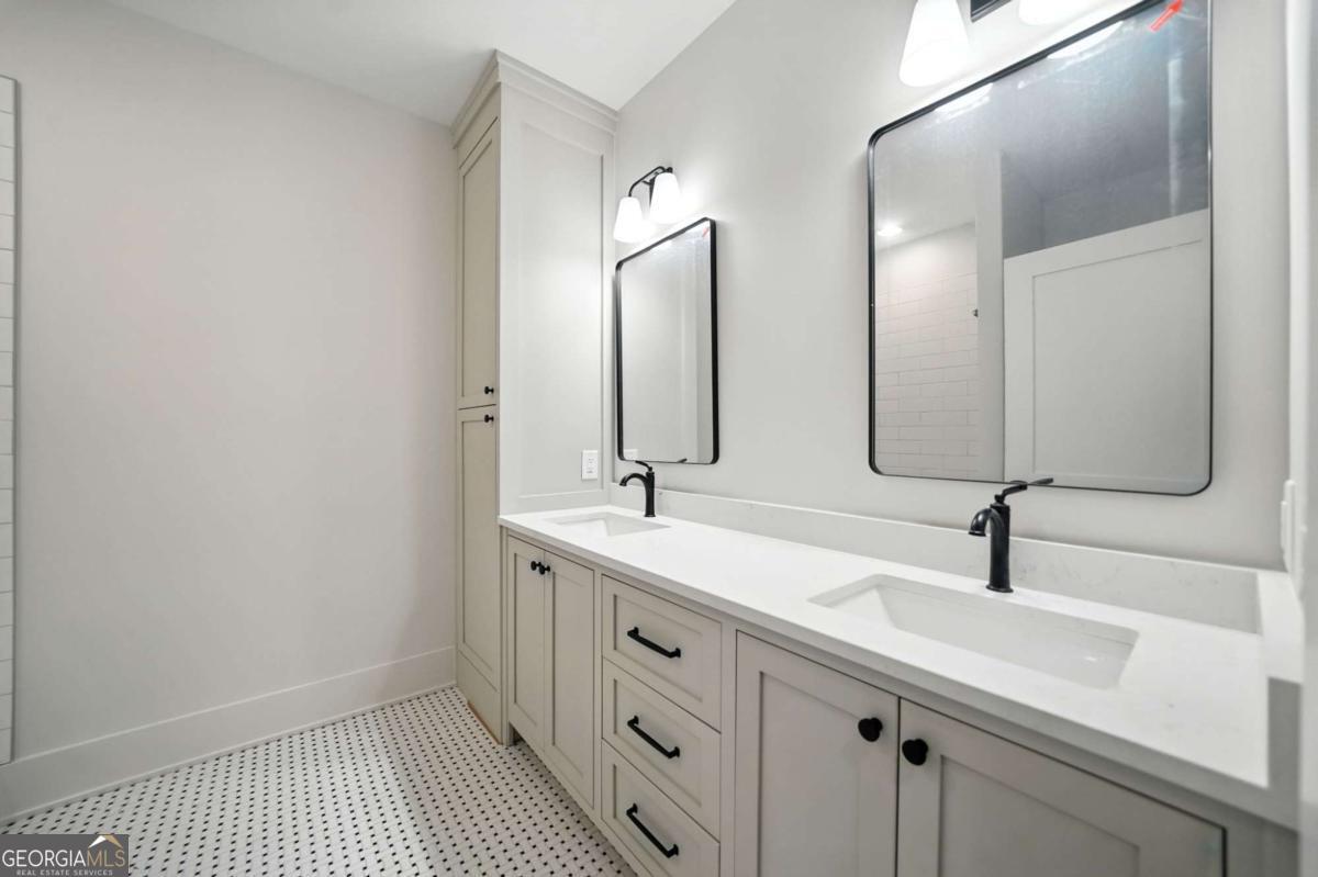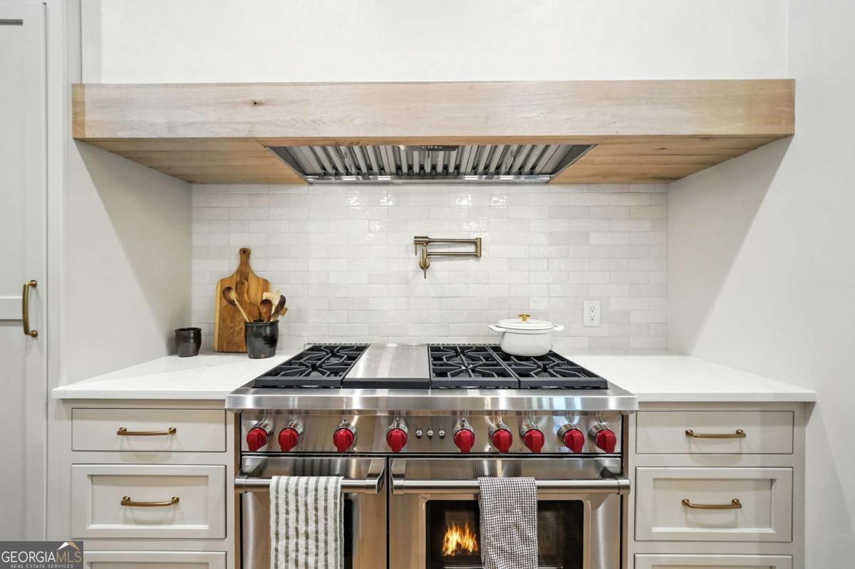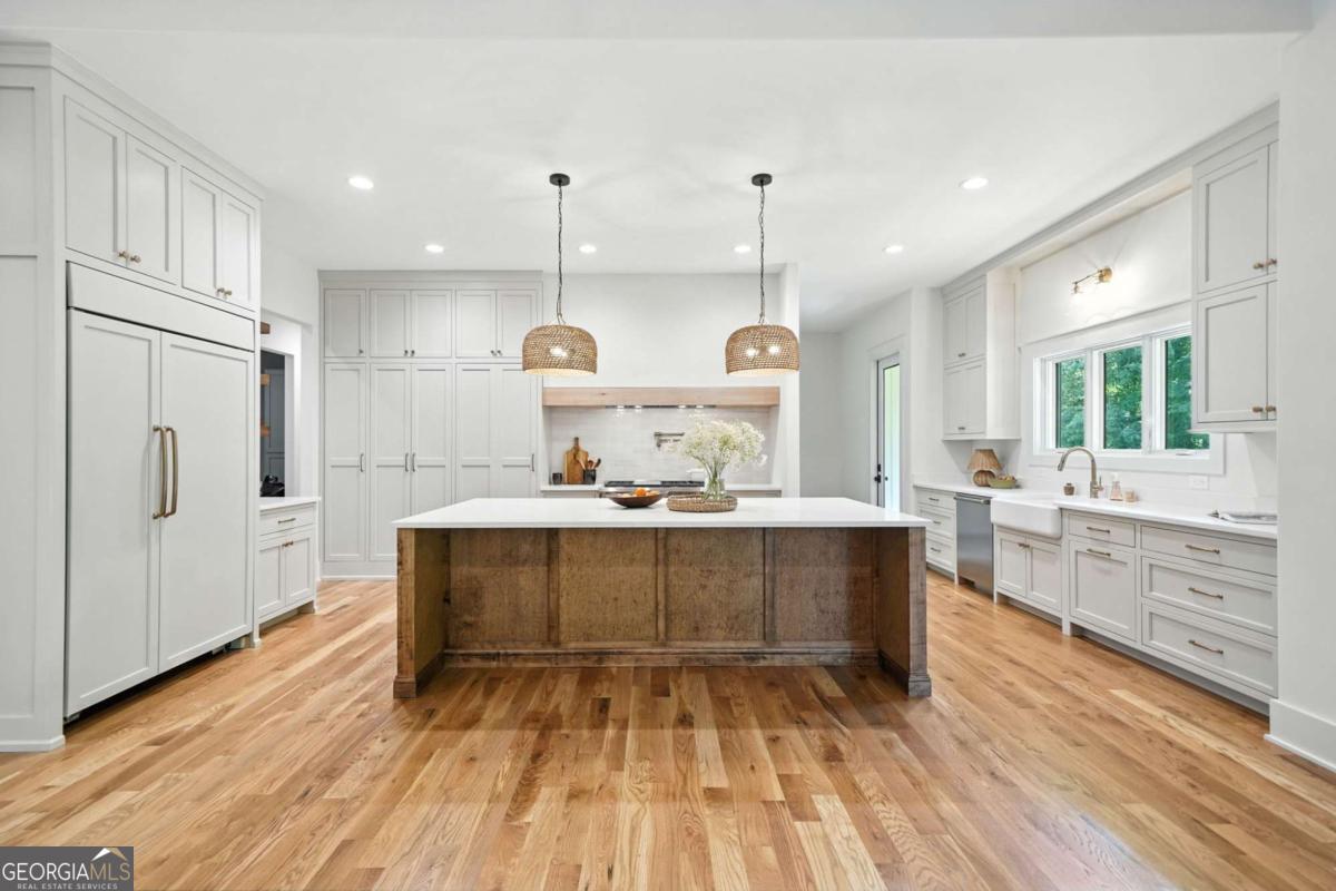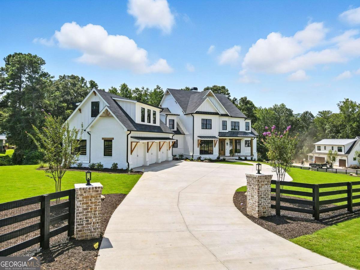 Exceptional custom-built farmhouse featuring six bedrooms, five and a half bathrooms spread across two spacious and thoughtfully designed levels. The main level includes three bedrooms, each with its own private ensuite, while the upper level offers a secondary primary suite or bonus room with an ensuite bath, a built-in kitchenette, and two dedicated computer workspaces-ideal for flexible living needs. A large, unfinished basement is stubbed for a full kitchen, a full bathroom, and a half bath, making it perfect for a future in-law suite or separate apartment. It also includes a built-in vault/panic room for added security. The chef's kitchen is a standout, featuring a Wolf 48" gas range with six burners and a griddle, a Sub-Zero 48" panel-ready refrigerator, Cove dishwasher, microwave drawer, a custom plastered hood accented with white oak, and high-end Delta plumbing fixtures. Artisan cabinetry and quartz countertops complement the space, white oak flooring flows throughout the main living areas and bedrooms. The bonus room is finished with Berber carpet. Custom touches include white oak beams with a shiplap ceiling in the great room, coffered ceilings in the dining area, white oak beam details in the office, wrought iron stair railings with oak treads, designer tile work in all bathrooms and laundry rooms, and custom built-ins in all closets. There are three laundry areas: a luxury main-level laundry room with a built-in dog wash, a secondary laundry upstairs, and a private laundry in the primary suite. A walk-in attic provides easy access to HVAC systems. The home is equipped with a Trane 17-SEER variable-speed HVAC system on the main level and a separate system for the upper level, as well as a tankless water heater. Exterior features include board and batten cement siding on the main and upper levels, painted brick on the basement level, a front porch with brick pavers, and a rear deck with fireplace, Trex-style decking, and a gas grill stub. The property is finished with Sierra Pacific aluminum-clad windows and doors, entry columns wired for lighting, four-board fencing on three sides to match the subdivision, and a fully irrigated, professionally landscaped yard. A natural gas line is stubbed for a generator, and the backyard is designed with space for a future pool. Additional features include a three-car garage and an oversized parking pad. This home offers a rare combination of luxury, flexibility, and quality craftsmanship, making it an ideal fit for growing families, multigenerational households, or buyers who appreciate elevated design and long-term versatility. Conveniently located to Kroger, Publix, Northside Cherokee, shops, restaurants and a short drive to downtown Woodstock or the Outlet Mall.