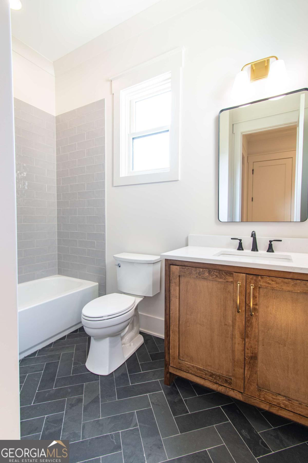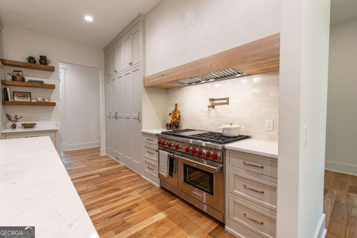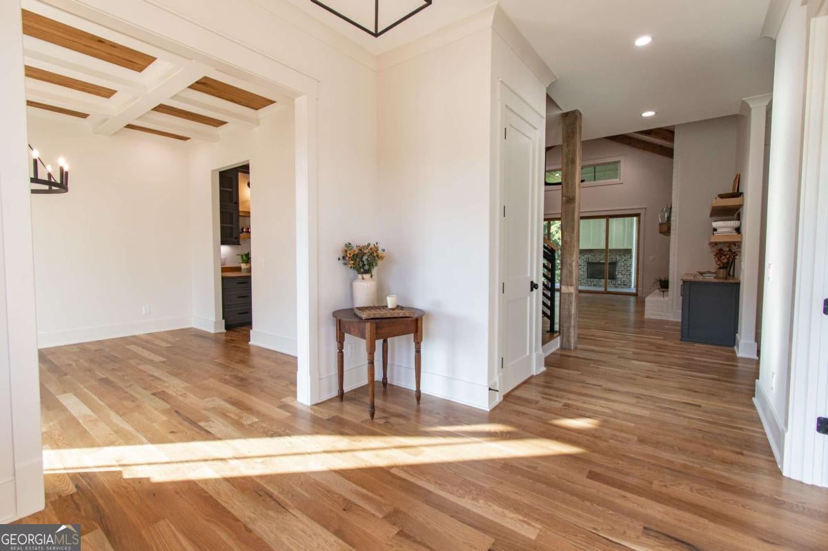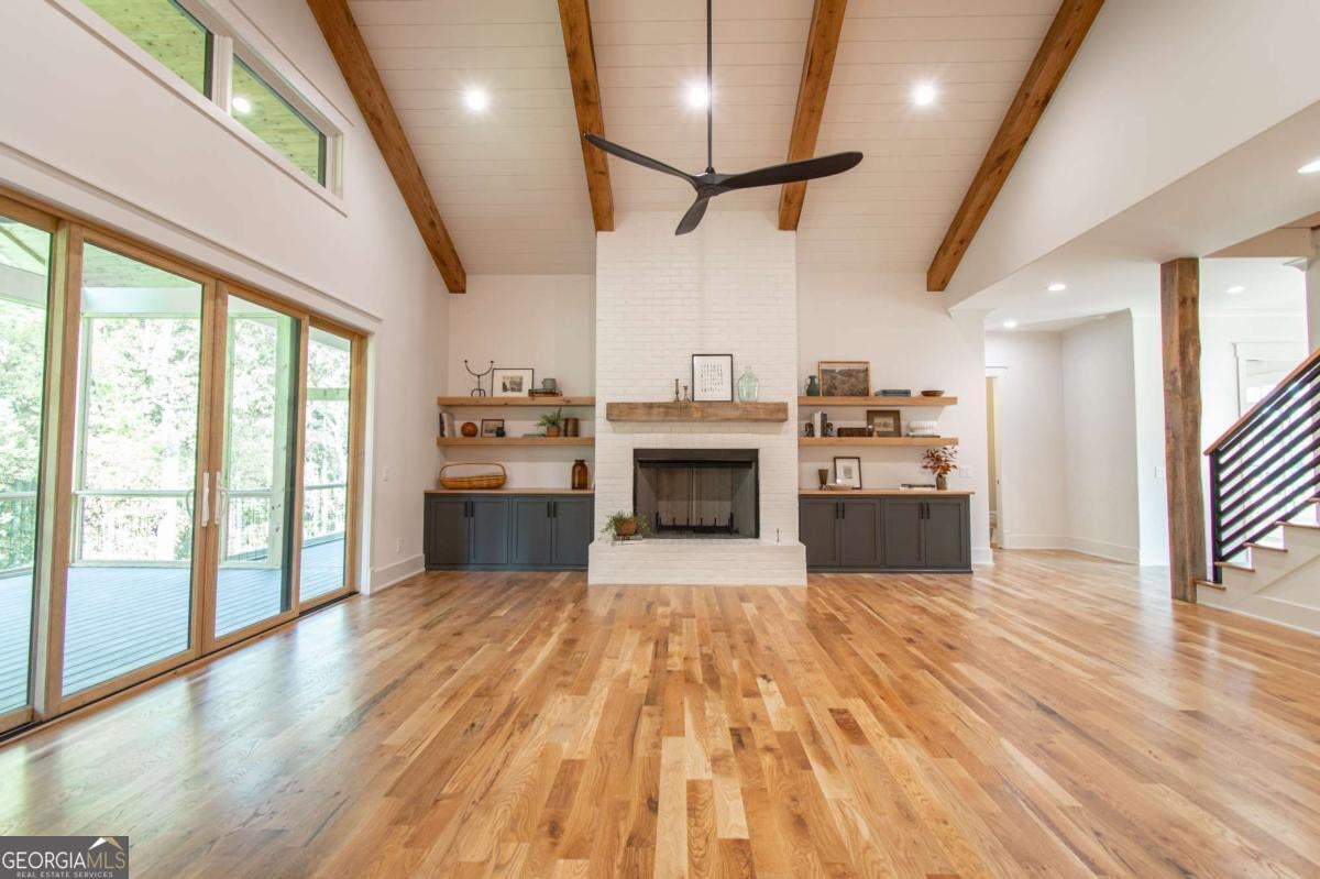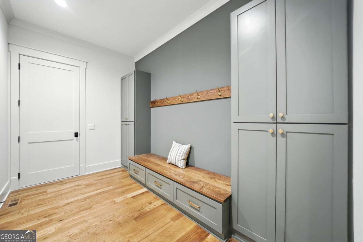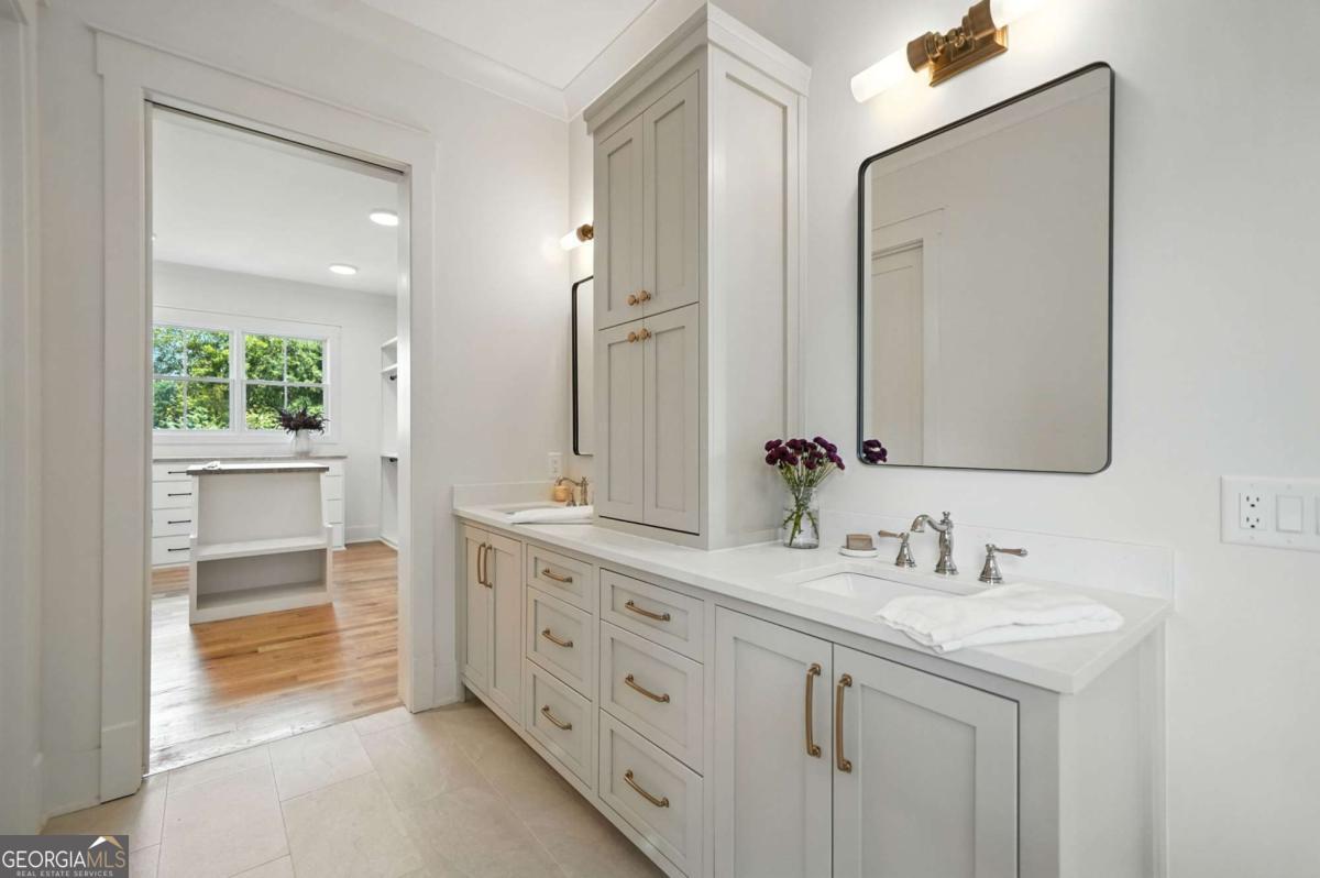 Exceptional custom-built farmhouse featuring six bedrooms, five and a half bathrooms spread across two spacious and thoughtfully designed levels. The main level includes three bedrooms, each with its own private ensuite, while the upper level offers a secondary primary suite or bonus room with an ensuite bath, a built-in kitchenette, and two dedicated computer workspaces-ideal for flexible living needs. A large, unfinished basement is stubbed for a full kitchen, a full bathroom, and a half bath, making it perfect for a future in-law suite or separate apartment. It also includes a built-in vault/panic room for added security. The chef's kitchen is a standout, featuring a Wolf 48" gas range with six burners and a griddle, a Sub-Zero 48" panel-ready refrigerator, Cove dishwasher, microwave drawer, a custom plastered hood accented with white oak, and high-end Delta plumbing fixtures. Artisan cabinetry and quartz countertops complement the space, white oak flooring flows throughout the main living areas and bedrooms. The bonus room is finished with Berber carpet. Custom touches include white oak beams with a shiplap ceiling in the great room, coffered ceilings in the dining area, white oak beam details in the office, wrought iron stair railings with oak treads, designer tile work in all bathrooms and laundry rooms, and custom built-ins in all closets. There are three laundry areas: a luxury main-level laundry room with a built-in dog wash, a secondary laundry upstairs, and a private laundry in the primary suite. A walk-in attic provides easy access to HVAC systems. The home is equipped with a Trane 17-SEER variable-speed HVAC system on the main level and a separate system for the upper level, as well as a tankless water heater. Exterior features include board and batten cement siding on the main and upper levels, painted brick on the basement level, a front porch with brick pavers, and a rear deck with fireplace, Trex-style decking, and a gas grill stub. The property is finished with Sierra Pacific aluminum-clad windows and doors, entry columns wired for lighting, four-board fencing on three sides to match the subdivision, and a fully irrigated, professionally landscaped yard. A natural gas line is stubbed for a generator, and the backyard is designed with space for a future pool. Additional features include a three-car garage and an oversized parking pad. This home offers a rare combination of luxury, flexibility, and quality craftsmanship, making it an ideal fit for growing families, multigenerational households, or buyers who appreciate elevated design and long-term versatility. Conveniently located to Kroger, Publix, Northside Cherokee, shops, restaurants and a short drive to downtown Woodstock or the Outlet Mall.