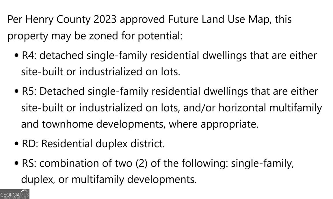 Property is located 1.5 miles from I-75 at exit 218. Perfect opportunity for residential development, this land is situated on 8.2 mostly flat acres with 300 ft. of road frontage just outside the city limits of quickly growing McDonough, GA. Possibility of up to 48 units with comps in the high 300s - low 400s. Henry County Future Land Use Map designates this property for "high-density suburban" development at up to 8 units per acre. Per Henry County 2023 approved Future Land Use Map, this property may be zoned for potential: R4: detached single-family residential dwellings that are either site-built or industrialized on lots. R5: Detached single-family residential dwellings that are either site-built or industrialized on lots, and/or horizontal multifamily and townhome developments, where appropriate. RD: Residential duplex district. RS: combination of two (2) of the following: single-family, duplex, or multifamily developments. County sewer accessible and on property completed in 2024. Nail Dr. roadway widened and repaved in May 2025. County Water, Cable, Electricity, Natural Gas, Phone, Sewer, Internet Fiber all available. Conveniently located 1/4 mile to South Pointe Mall shops, restaurants, and easy access to Hwy 20 / I-75. Bring your builders and developers and don't miss the opportunity on a prime residential development in this growing area!