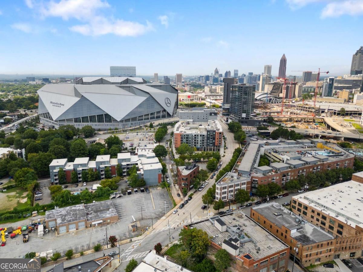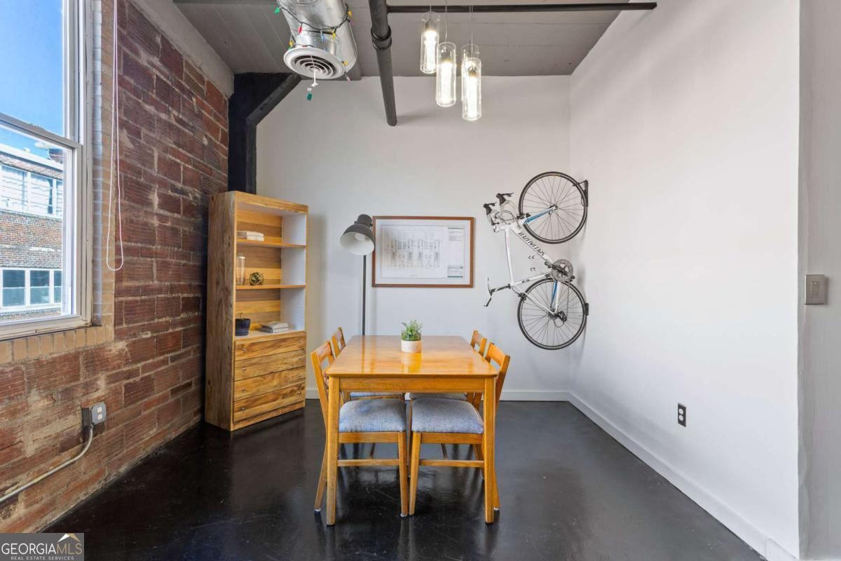 Experience authentic loft living in the heart of vibrant and artistic Castleberry Hill. This top-floor 1 bedroom, 1 bath residence in the coveted GE Lofts showcases true industrial character with exposed brick, concrete floors, soaring ceilings, and exposed ductwork-flooded with natural light and set quietly above the street. The open-concept layout offers defined space for living, dedicated dining, and a home office, providing flexibility for both everyday living and entertaining. The bedroom features modern sliding panel doors that preserve the loft aesthetic while offering privacy. GE Lofts is known for its rare and thoughtfully designed outdoor amenities, including a landscaped garden courtyard with fire pit, built-in seating, and inviting gathering areas-plus a true standout for intown living: a pool! Residents also enjoy gated, secure parking with guest parking tucked away in a quiet alley, along with covered bicycle storage. Located moments from Atlanta's premier sports, entertainment, and cultural destinations, this home places you close to Centennial Olympic Park, Centennial Yards (formerly The Gulch), Mercedes-Benz Stadium, State Farm Arena, Wild Leap Brewing, the Georgia Aquarium, and the World of Coca-Cola. No Mas! Cantina sits just across the street, with neighborhood art galleries and restaurants nearby. With billions of dollars in new investment flowing into downtown Atlanta, this property offers not only an exciting city lifestyle, but also a compelling opportunity for long-term value. Whether you're looking for a stylish primary residence or a smart investment in a landmark location, this loft delivers on location, character, and lifestyle.
