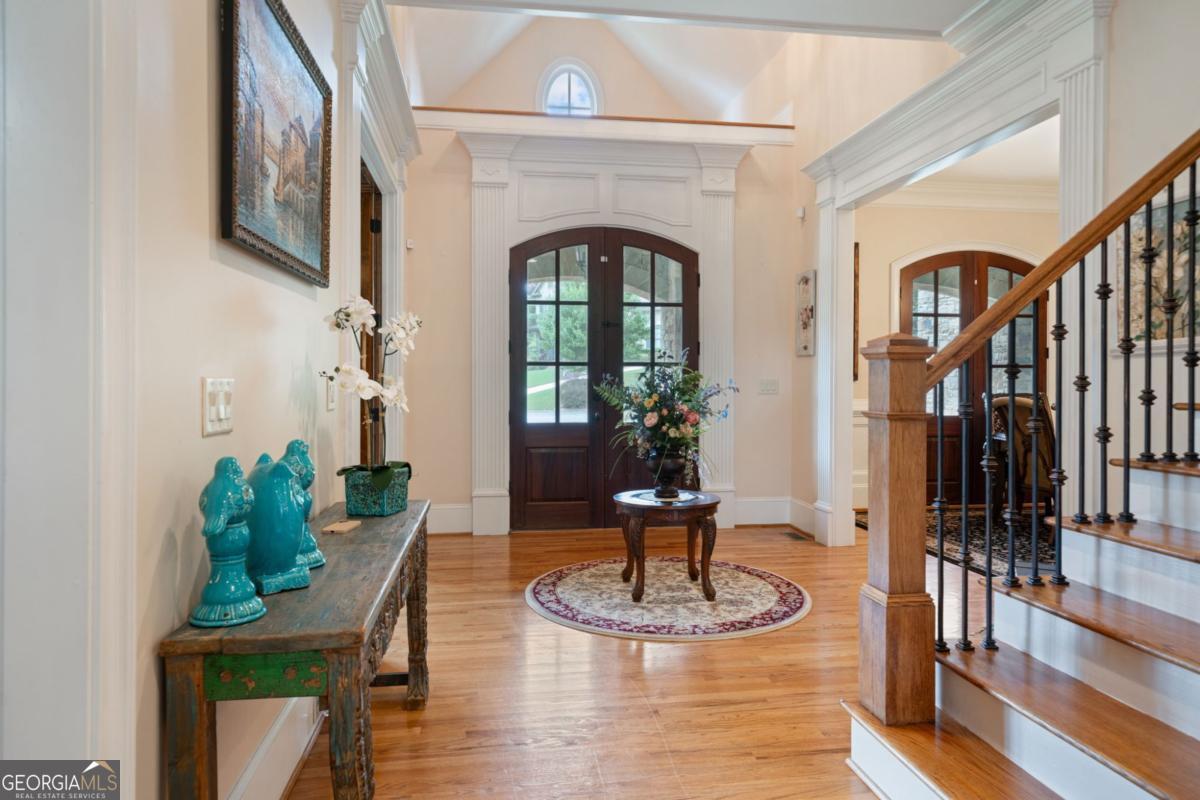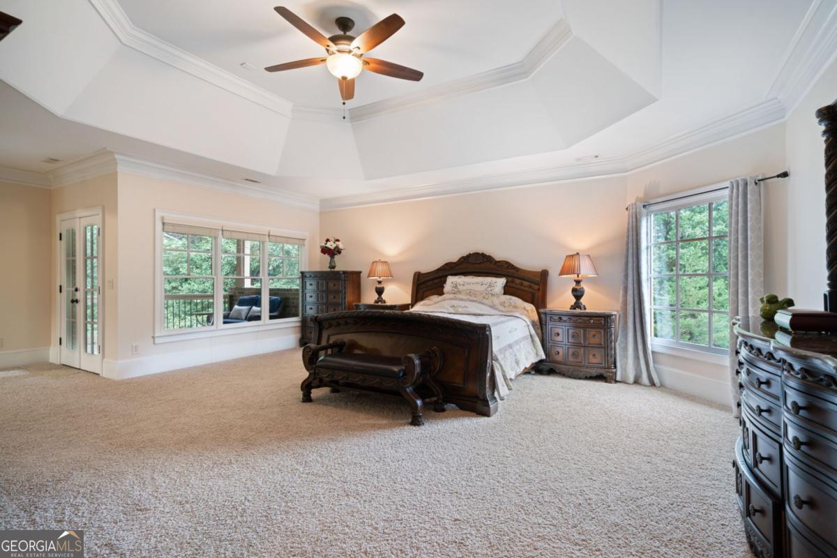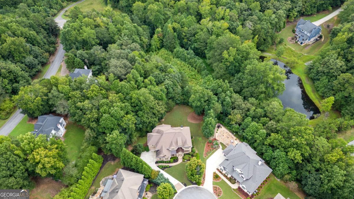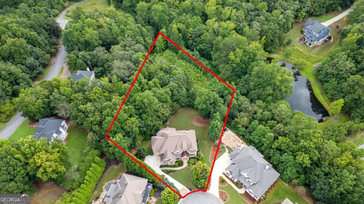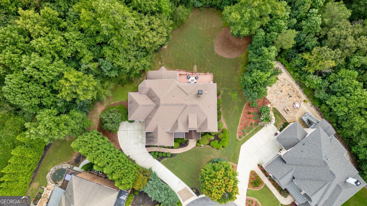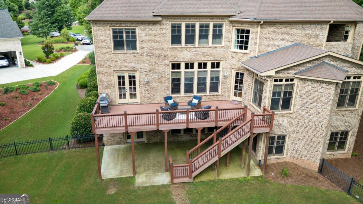 Welcome to this breathtaking FOUR-SIDED BRICK, covered natural stone entryway residence where timeless luxury and elegant design greet you from the moment you arrive. Located on a cul-de-sac in the prestigious gated TURNBERRY community, with the most HIGHLY RATED SCHOOLS and LOW TAX Forsyth Co. Walking into a wide foyer to be greeted with the full natural light that this home has to offer. The main floor showcases rich hardwood flooring, private home office with wood paneling and coffered ceiling , the family room impresses with its dramatic coffered ceiling, built-in custom cabinetry and the primary fireplace offering a warm and inviting space for relaxation, open to the great room with its own fireplace and the views of the massive backyard. Soaring 11- to 12-foot ceilings, and exquisite CROWN MOLDING throughout. The GOURMET KITCHEN is a showpiece, featuring ceiling-height cabinetry that blends style and function, while adjacent to formal dining room comfortably seats 12+ guests-perfect for hosting unforgettable gatherings. The main level is complete with a beautifully appointed in-law suite with its own private ensuite bathroom. Step outside to an extra-large Trex deck overlooking a fully leveled, professionally landscaped 100% PRIVATE almost 1 acre backyard-an ideal setting for outdoor entertaining or peaceful retreat. Beneath it all lies a massive unfinished basement with high ceilings and open space, ready to be transformed into your dream gym, theater, game room, or additional living suite. Upstairs, the home continues its theme of grandeur with 10- to 11-foot ceilings, detailed crown molding, and a BONUS ROOM , MASSIVE MASTER SUITE , and three more bedrooms, each with its OWN FULL ENSUITE BATHROOM, ensuring comfort and privacy for all. The master suite is a true sanctuary, generously sized with a cozy seating area anchored by a FIREPLACE, a PRIVATE BALCONY for morning coffee or evening stargazing, and a spa-inspired bathroom adorned with NATURAL STONE finishes that evoke tranquility and indulgence. HIS AND HERS closets offer boutique-style storage, completing a retreat that redefines luxury living. Completing this exceptional home are 3 covered garage spaces Every inch of this residence has been thoughtfully crafted to deliver refined elegance, and timeless comfort.
