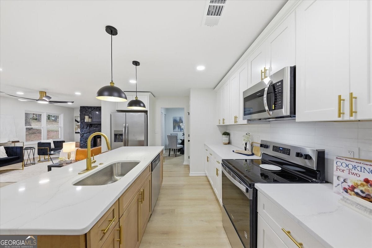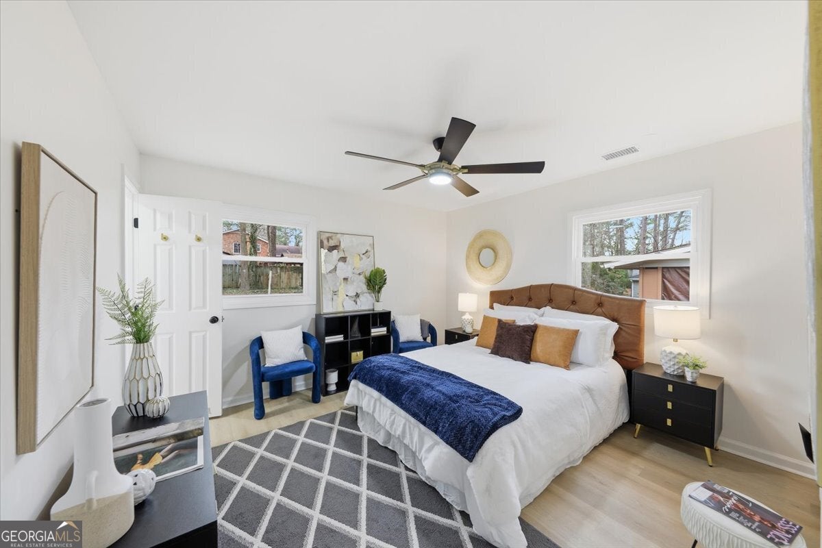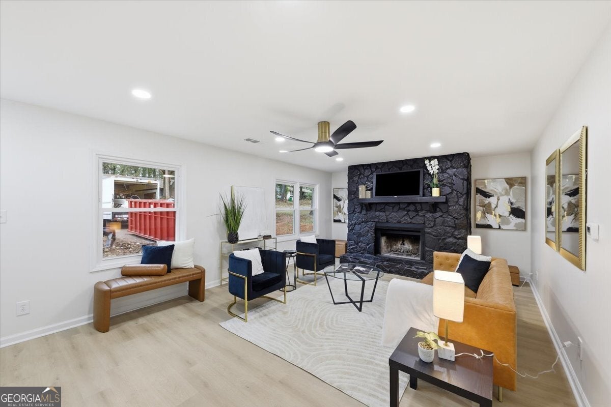 Welcome home to this thoughtfully updated brick ranch where timeless charm meets modern comfort. Step into a light-filled living space that flows effortlessly into the dining area and a sleek, contemporary kitchen, perfect for everyday living and effortless entertaining. The kitchen is appointed with stainless steel appliances, quartz countertops, soft-close white shaker cabinetry and a walk-in pantry. The primary suite is a true retreat, offering a private ensuite bath with a beautifully tiled walk-in shower and dual vanities. Two additional bedrooms are generously sized and share a stylish guest bath featuring a tiled tub/shower combination. This home offers peace of mind with extensive upgrades throughout, including a new roof, new windows, durable luxury vinyl plank flooring, updated lighting and ceiling fans, new HVAC System, New Water Heater and fresh interior and exterior paint. Step outside to a fully fenced backyard, ideal for hosting gatherings, enjoying quiet evenings, or creating your own outdoor oasis. Perfectly situated just minutes from Stone Mountain Park, Atlanta, and major highways including Hwy 78, I-285, and I-20, this move-in-ready home delivers both comfort and convenience.
