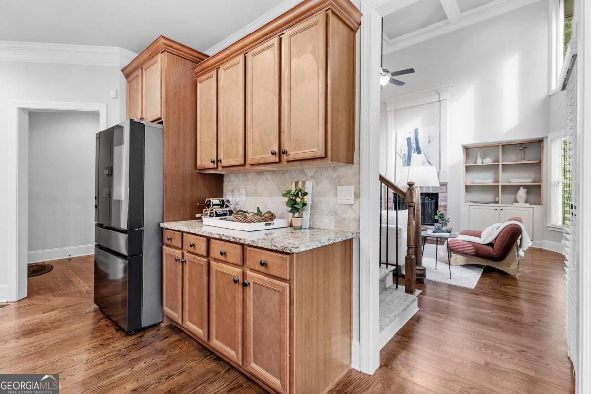 - Interior FeaturesBeamed Ceilings, Bookcases, Double Vanity, Pulldown Attic Stairs, Walk-In Closet(s), Rear Stairs, Wet Bar