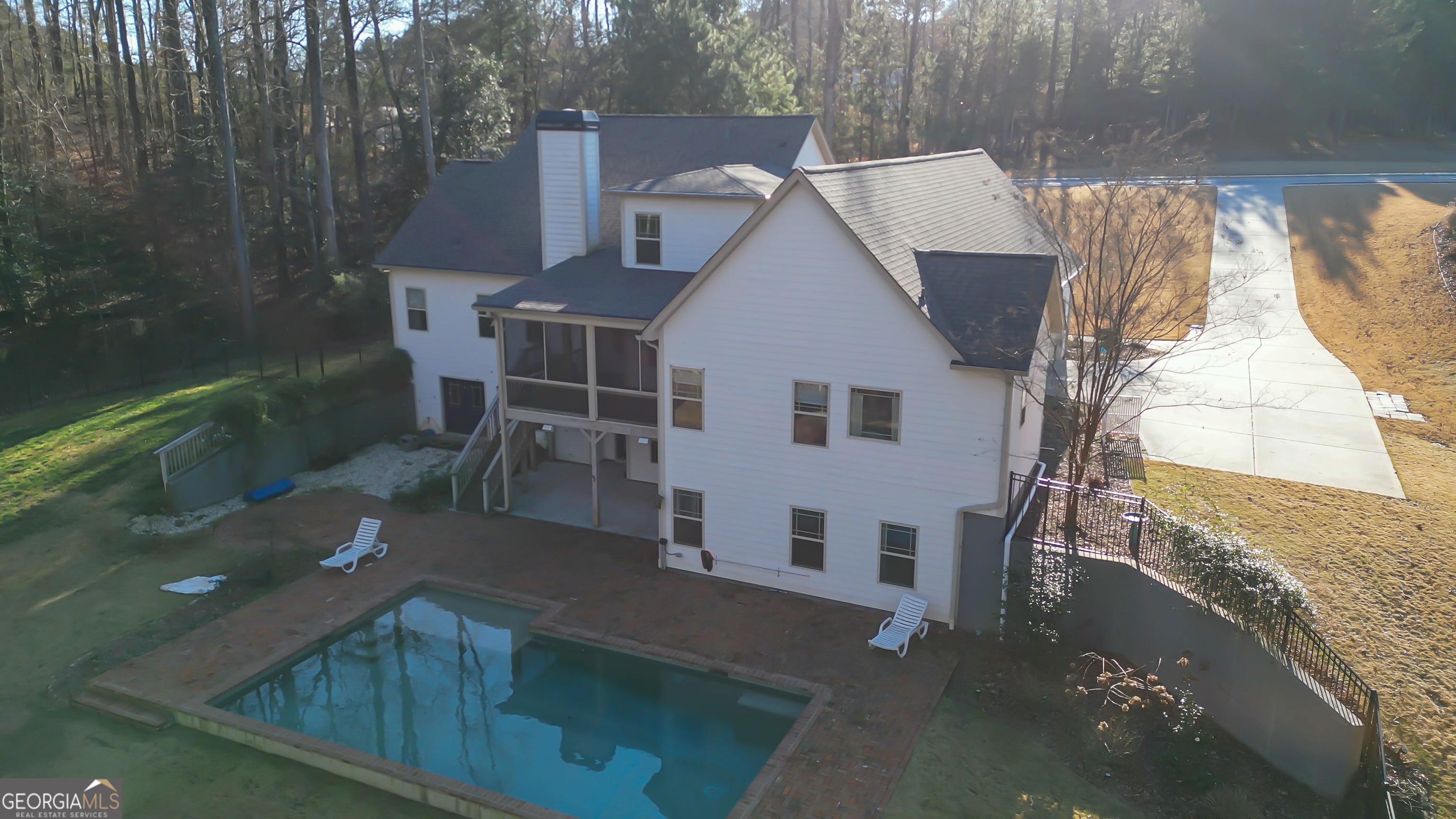 Move-in ready and offering approximately 4,900+ sq ft, this stunning home is nestled on nearly 3 PRIVATE ACRES in a quiet neighborhood, blending elegance with everyday comfort. A long driveway leads to a side-entry garage, enhancing both curb appeal and convenience. The main level features soaring 10-foot ceilings and a light-filled great room with a fireplace, seamlessly connected to the chef's kitchen with stainless steel appliances, an oversized island, quartz countertops, and a cozy corner breakfast nook. A versatile dining room adds charm and flexibility. The main-level owner's suite is a true retreat, showcasing a spa-like bath with dual vanities, a soaking tub, a separate shower, and a walk-in closet. Two additional bedrooms, a full hall bath, and a laundry room complete this level. Upstairs, you'll find a spacious bonus room or office, an additional bedroom, and a full bath. The finished terrace level expands your living space with a bonus room, bath, playroom, and a family room with kitchenette, plus generous storage-ideal for guests or multi-generational living. Step out to the screened porch for year-round enjoyment. Outdoor living shines with a fabulous IN - GROUND POOL, while the expansive backyard still offers plenty of room for play. A NEWER ROOF (less than 3 years old) adds peace of mind. Located on a lovely, quiet street yet convenient to area amenities, this home truly has it all.