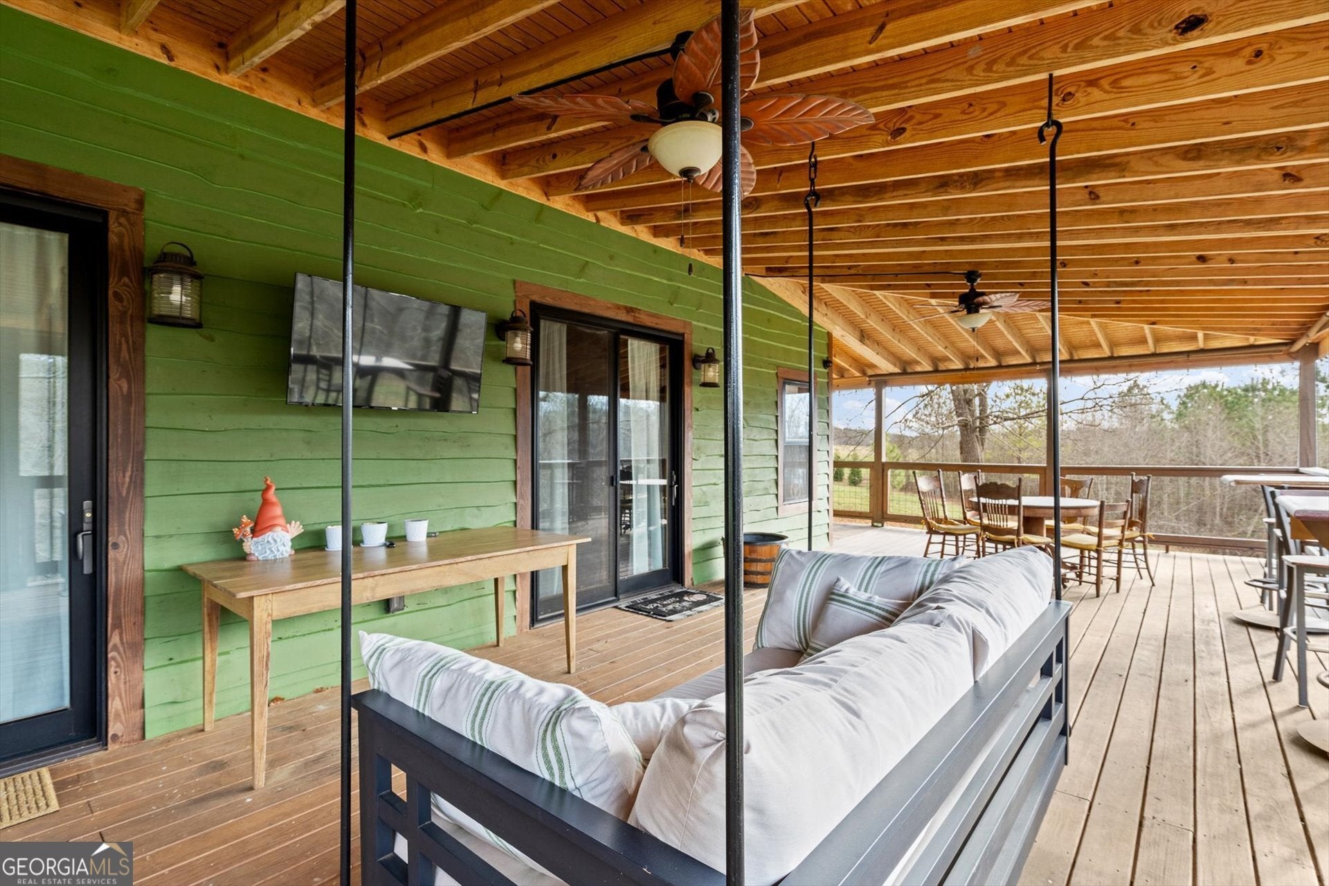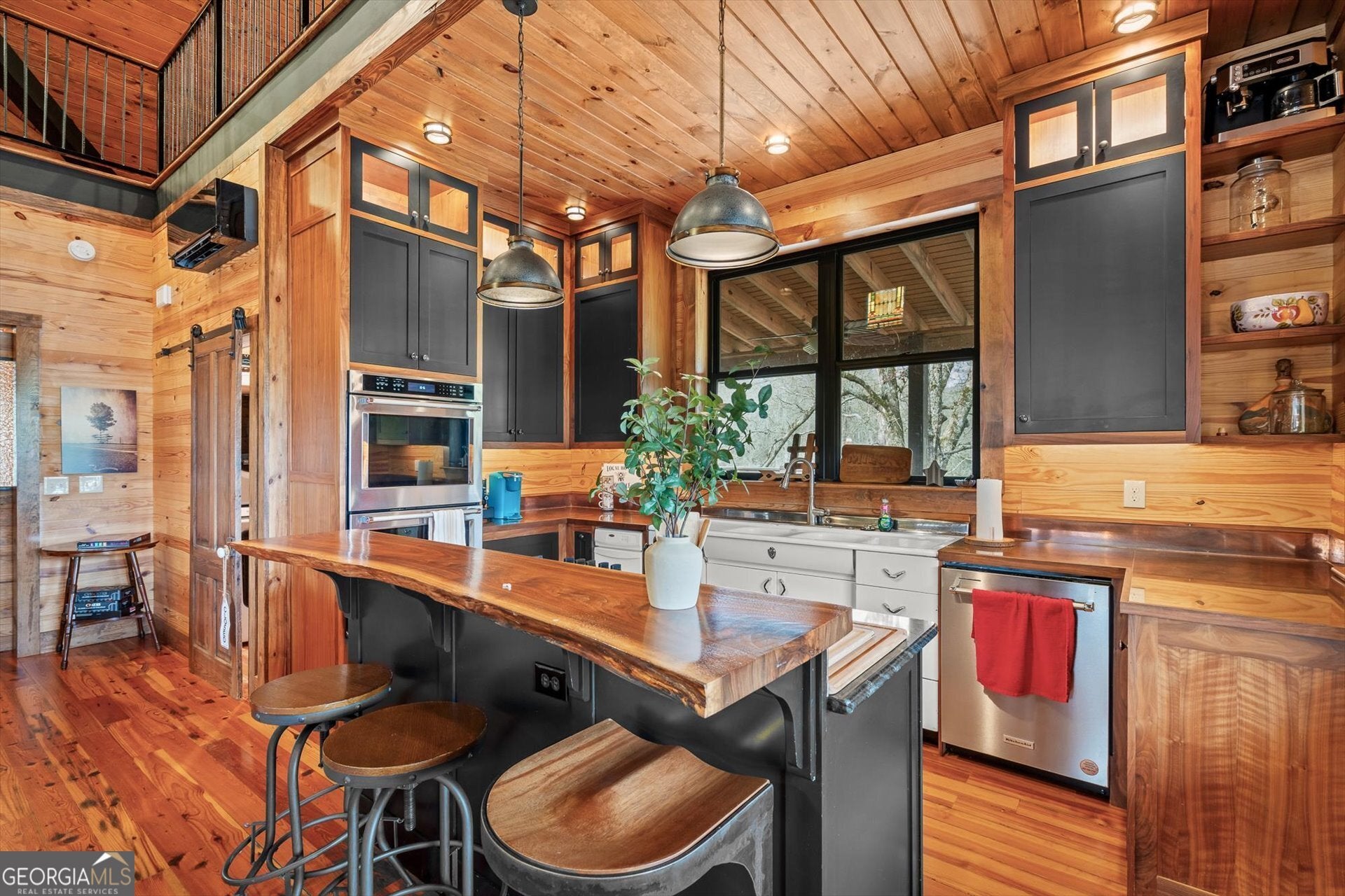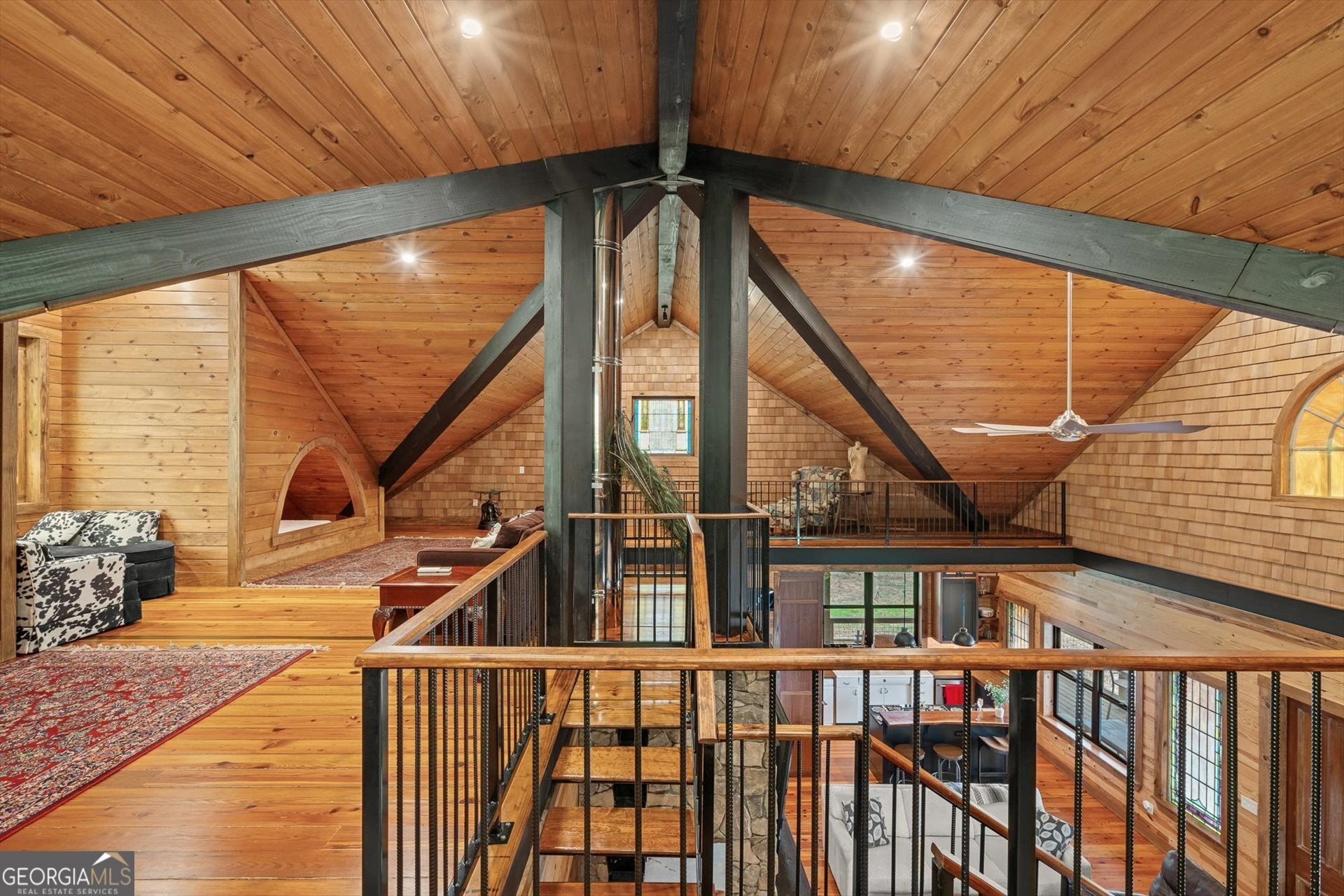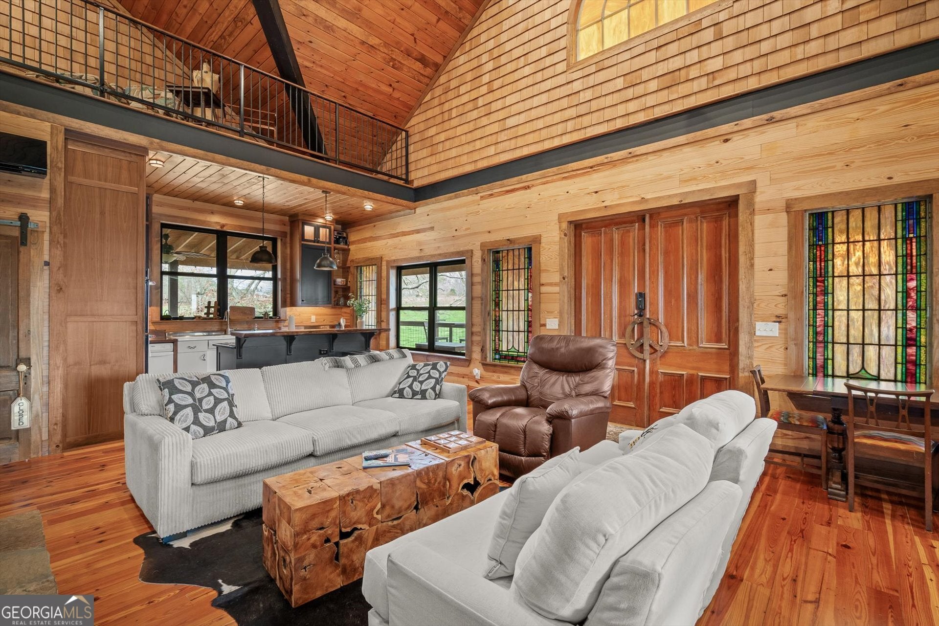 Built in 2019, this one-of-a-kind custom "treehouse" blends historic character with modern comfort. Featuring reclaimed heart pine floors throughout, pine walls and ceilings, and red oak accents including the fireplace mantle and sliding bedroom closet doors, the home is rich in craftsmanship and story. Architectural details include stained glass from an Alabama church built in the 1800s, additional stained glass and exterior elements from historic Vinings properties, and front doors reclaimed from a plantation home in Selma, Alabama. The kitchen showcases an original restored sink, walnut bar and island tops, and striking 1/4-inch reclaimed copper countertops. Refinished reclaimed tubs, an upstairs sink from the Jack Daniel's distillery, and reclaimed doors throughout add unmatched character. The porches are 56 x 16 and 24 x 40 wrap around porch and deck for a total of 1856 ft. for grand outdoor living and entertainment! Heated and cooled by four Mitsubishi zoned ductless units, the home also offers a drilled well producing approx. 17 GPM, a propane whole-house generator, prewiring for security, insulated pipes with heat tape, and a piano that conveys. A rare opportunity to own a thoughtfully curated, truly unique property.