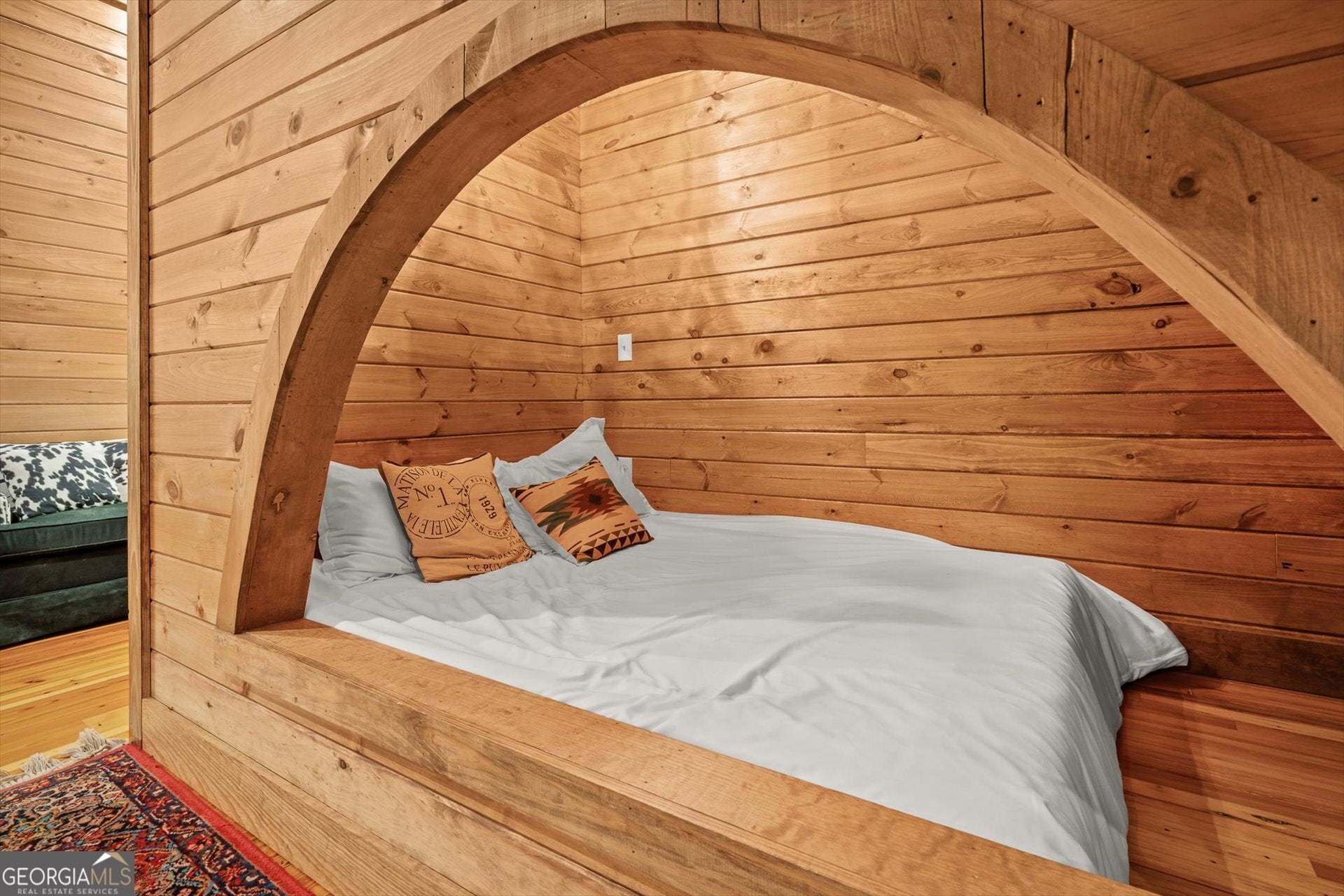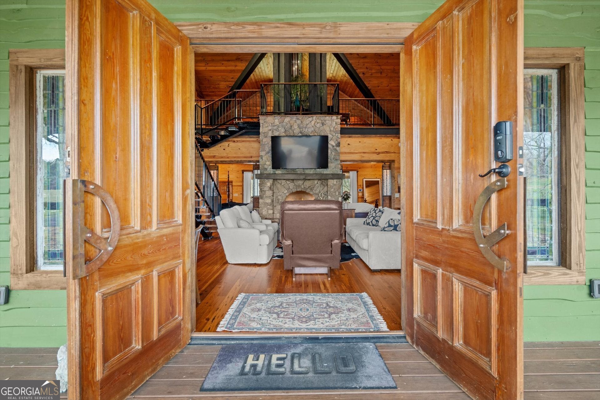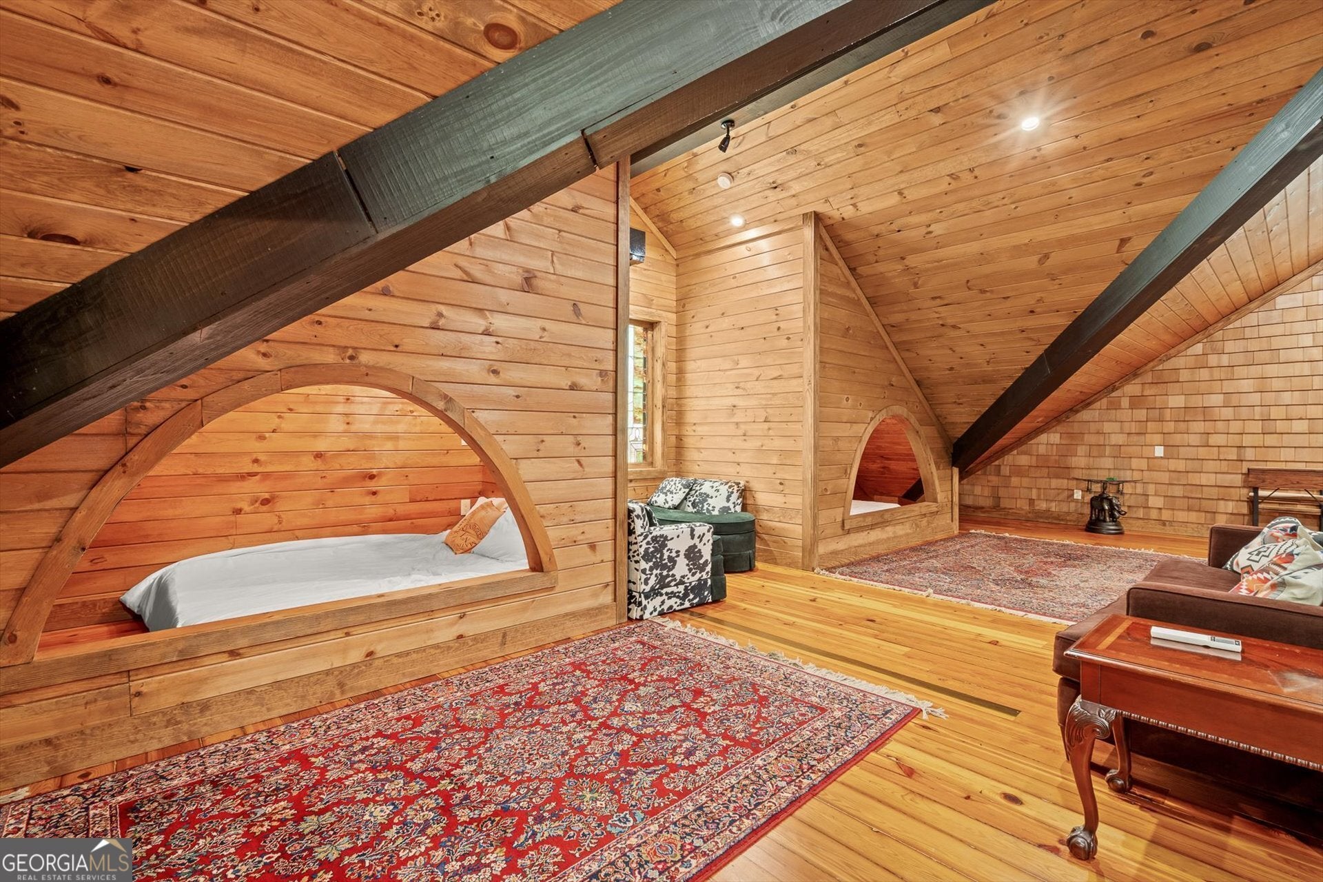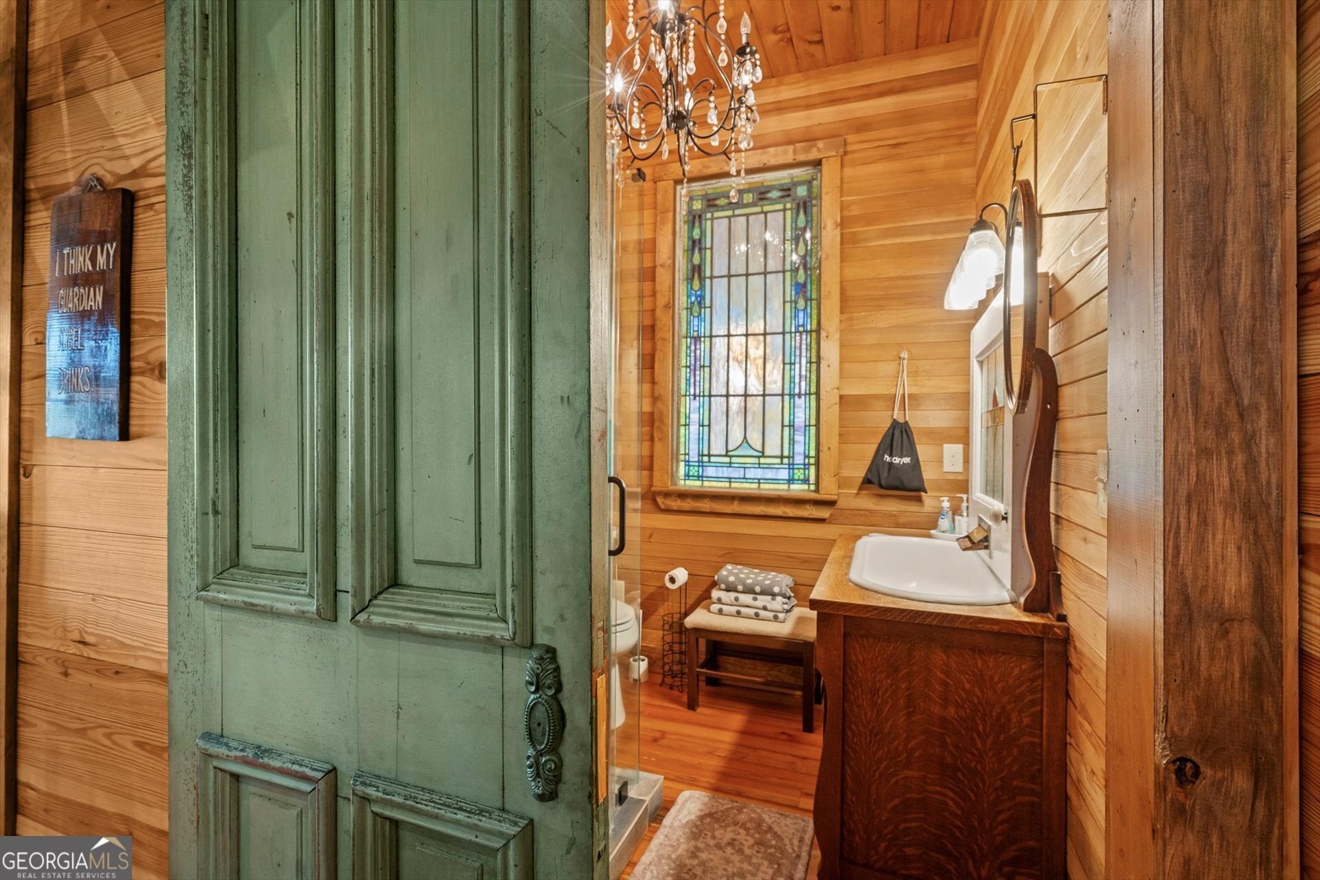 Built in 2019, this one-of-a-kind custom "treehouse" blends historic character with modern comfort. Featuring reclaimed heart pine floors throughout, pine walls and ceilings, and red oak accents including the fireplace mantle and sliding bedroom closet doors, the home is rich in craftsmanship and story. Architectural details include stained glass from an Alabama church built in the 1800s, additional stained glass and exterior elements from historic Vinings properties, and front doors reclaimed from a plantation home in Selma, Alabama. The kitchen showcases an original restored sink, walnut bar and island tops, and striking 1/4-inch reclaimed copper countertops. Refinished reclaimed tubs, an upstairs sink from the Jack Daniel's distillery, and reclaimed doors throughout add unmatched character. The porches are 56 x 16 and 24 x 40 wrap around porch and deck for a total of 1856 ft. for grand outdoor living and entertainment! Heated and cooled by four Mitsubishi zoned ductless units, the home also offers a drilled well producing approx. 17 GPM, a propane whole-house generator, prewiring for security, insulated pipes with heat tape, and a piano that conveys. A rare opportunity to own a thoughtfully curated, truly unique property.