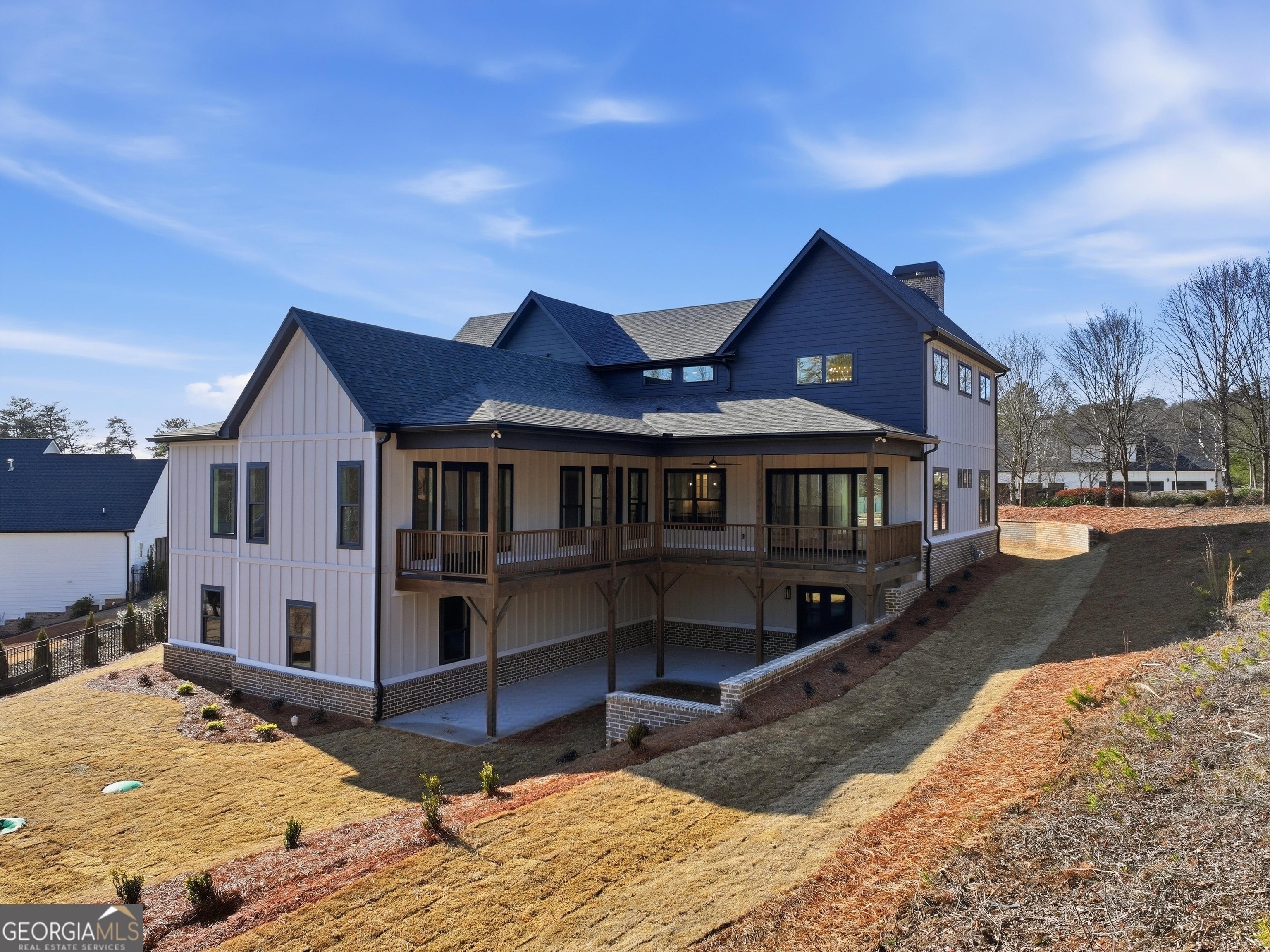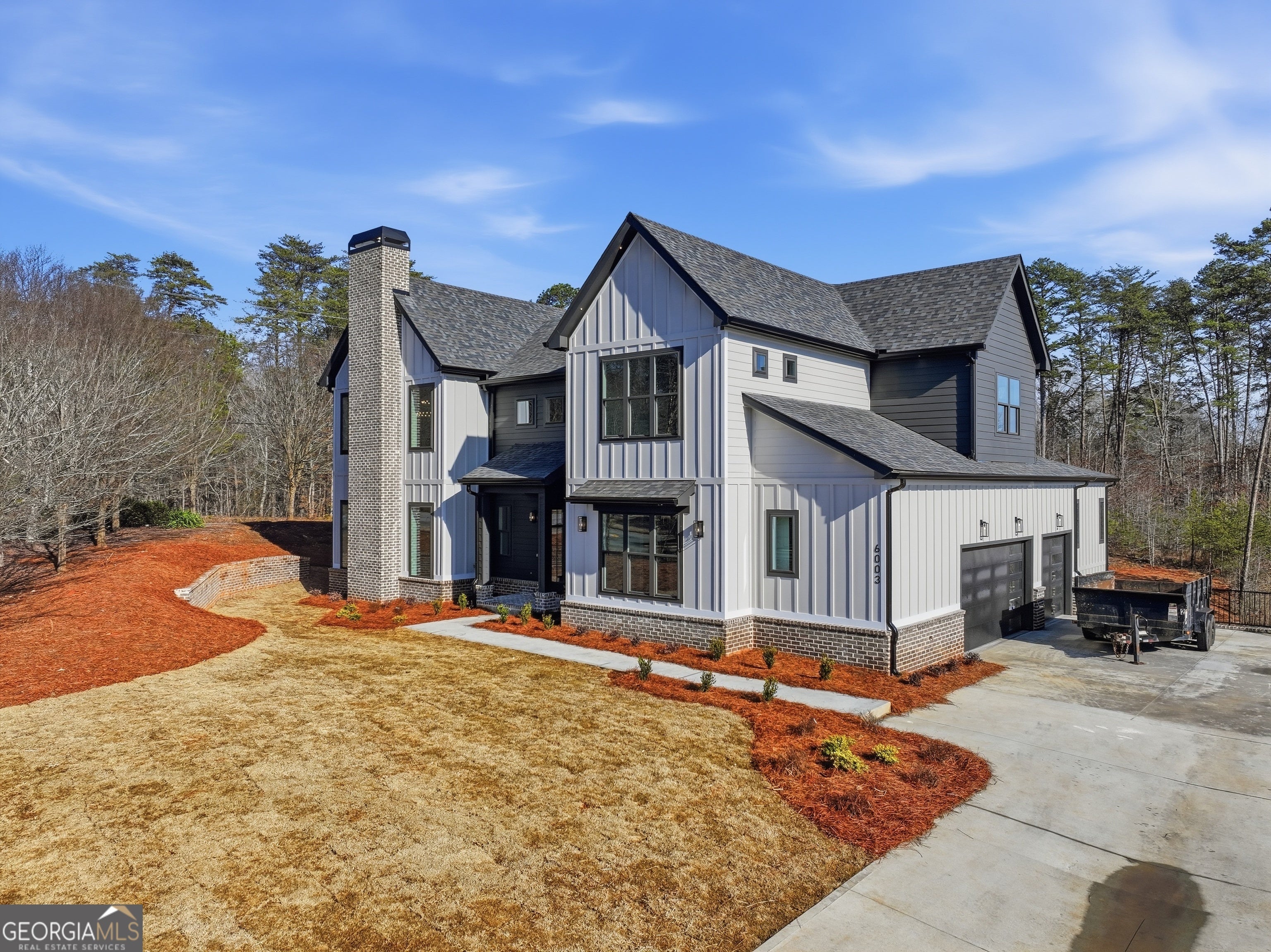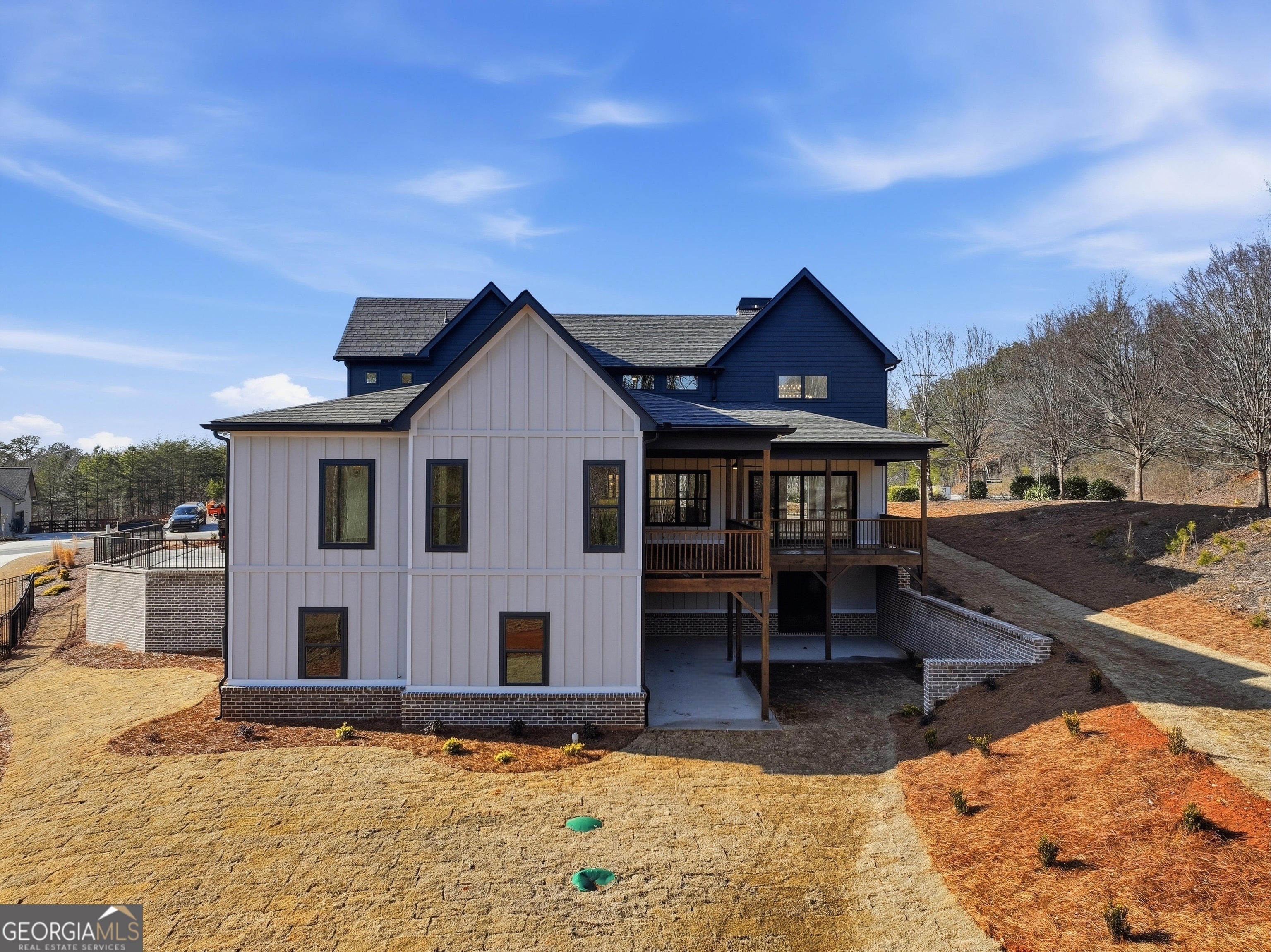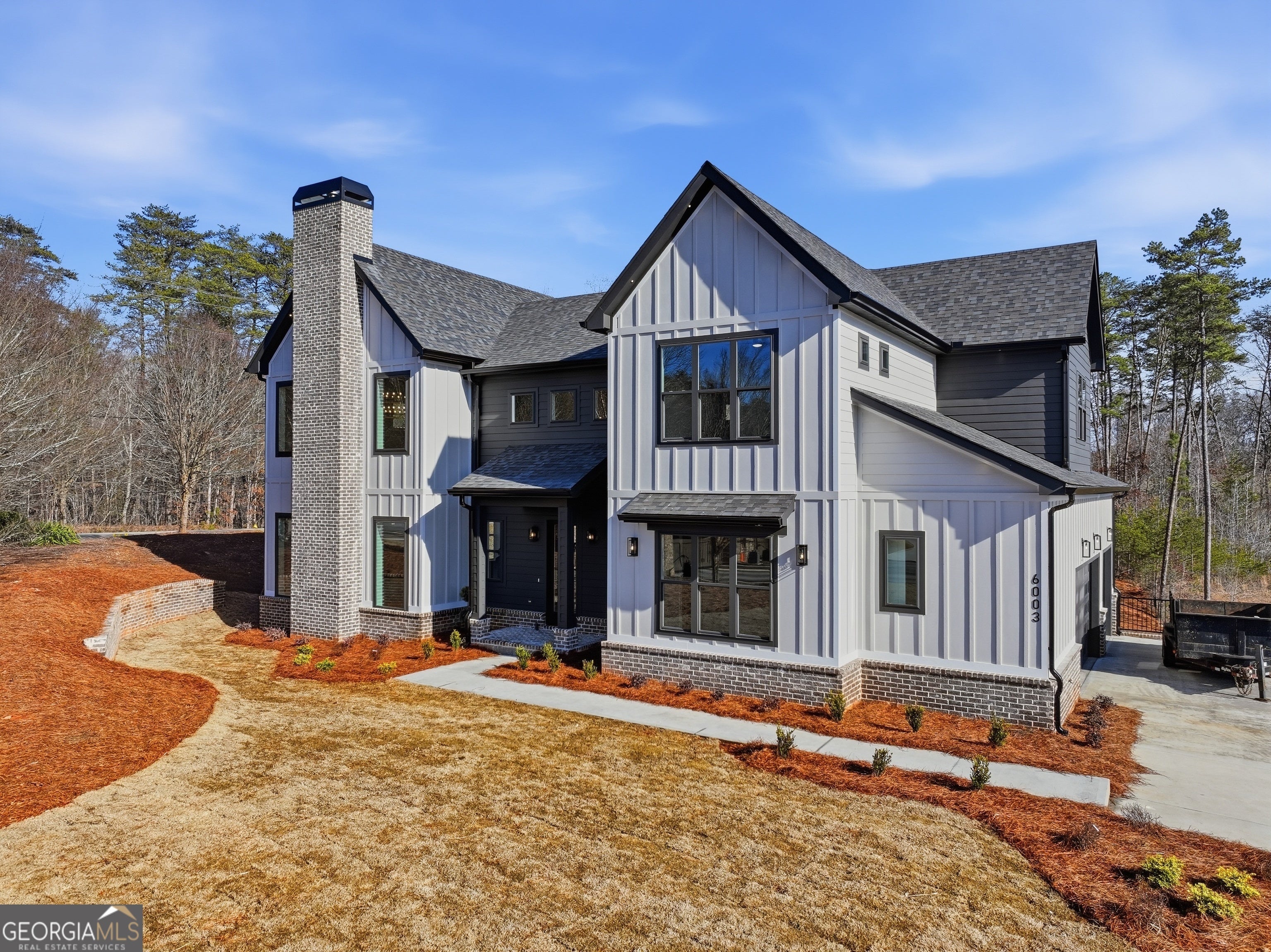 Welcome to 6003 Bluewater Blvd, Gainesville, GA, a stunning new construction home that blends modern farmhouse style with thoughtful craftsmanship. This beautifully designed residence features eye-catching curb appeal with board-and-batten siding, brick accents, and architectural rooflines that make a lasting first impression. Inside, the home opens to a bright, airy living space with soaring ceilings, expansive windows, and elegant trim details that adds warmth and character. Natural light floods the interior, highlighting the hardwood floors and upscale finishes throughout. Statement chandeliers and exposed wood beam create a perfect focal point for entertaining or relaxing. The exterior living space is equally impressive, offering a spacious covered back deck ideal for outdoor dining, gatherings, or enjoying peaceful views of the surrounding landscape. The walk-out lower level provides additional flexibility and potential for future living or recreational space. Thoughtfully designed with quality materials and modern style, this home offers the perfect balance of comfort, function, and timeless appeal-all nestled in a desirable Gainesville location. A must-see property that truly stands out.