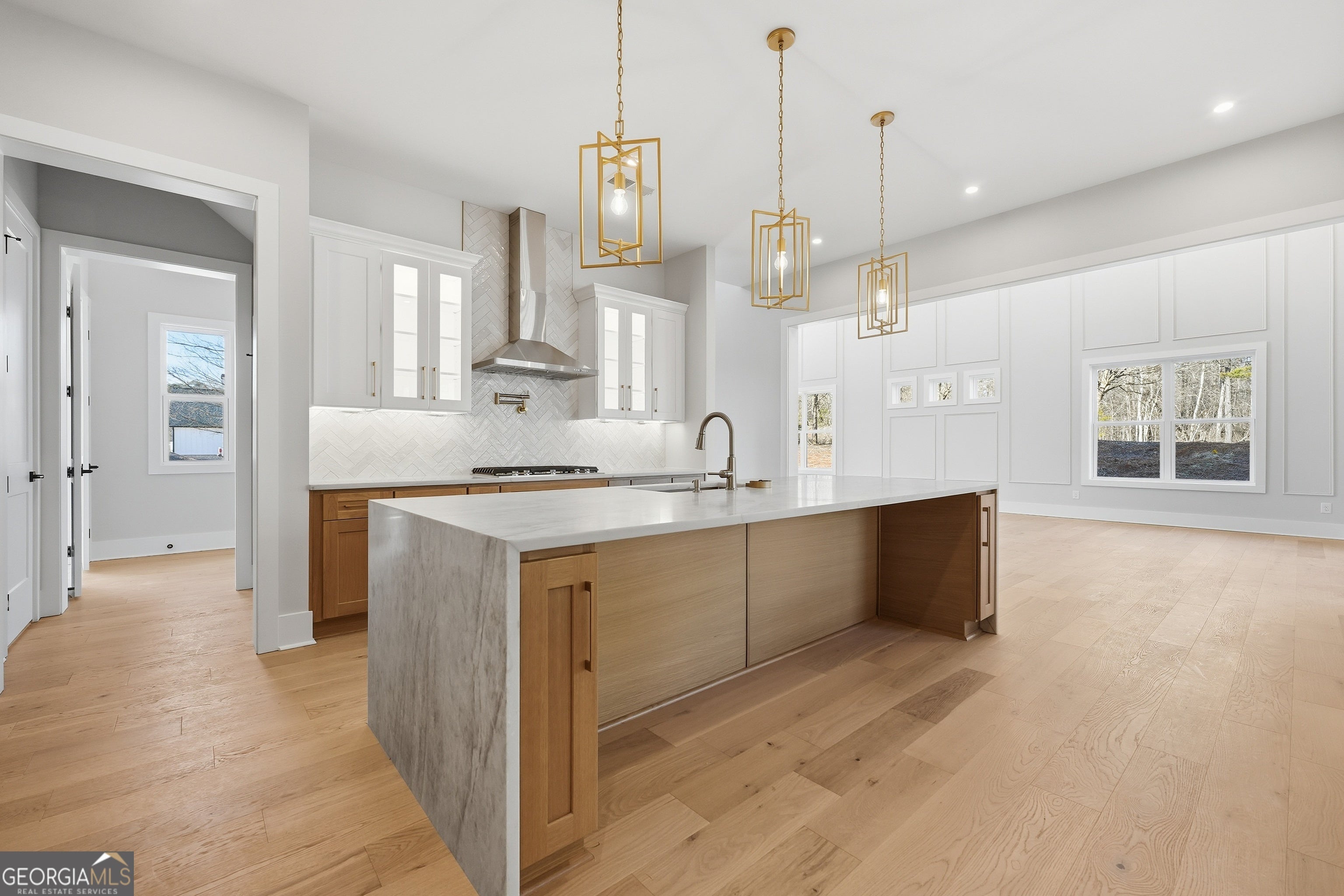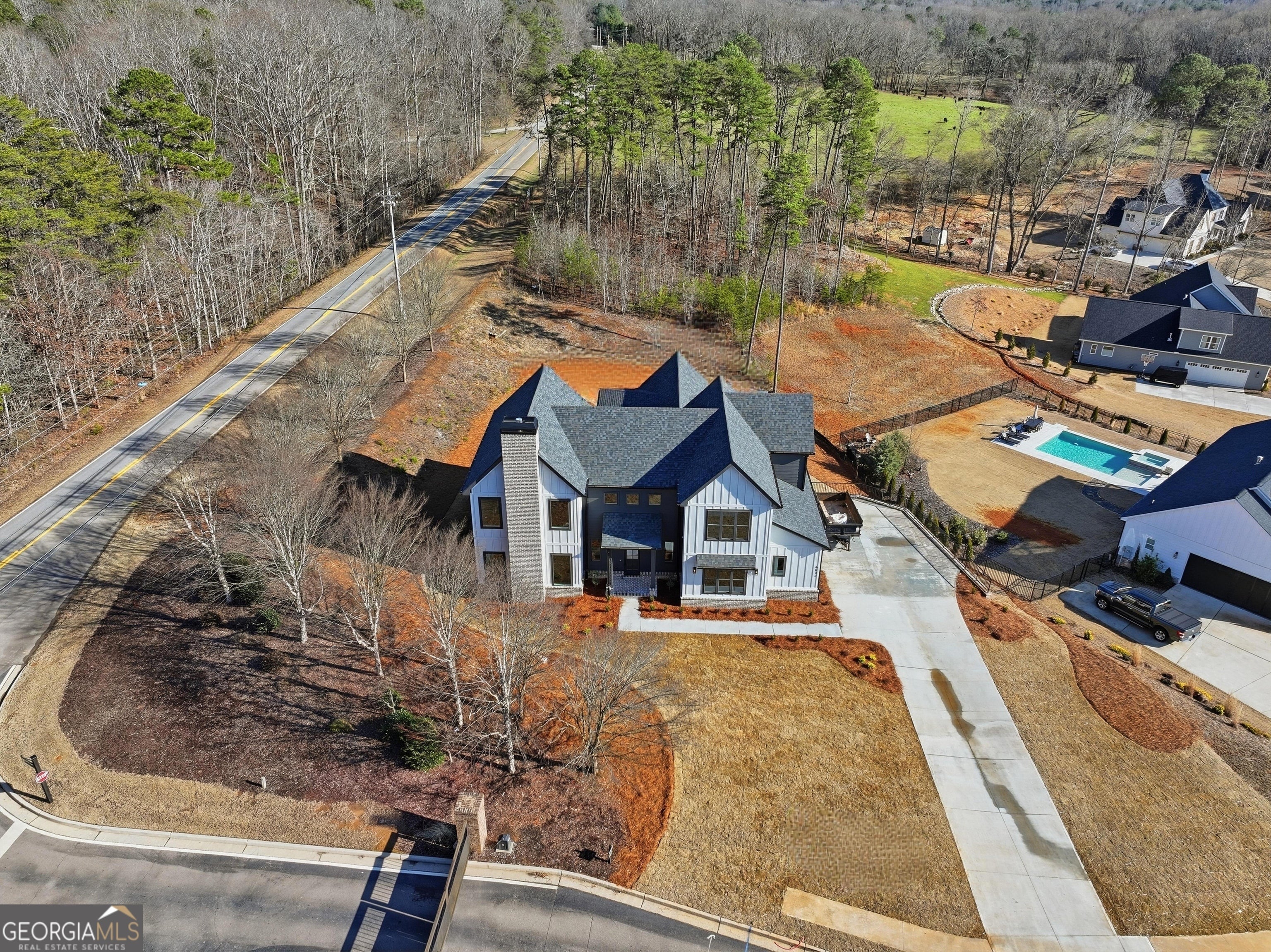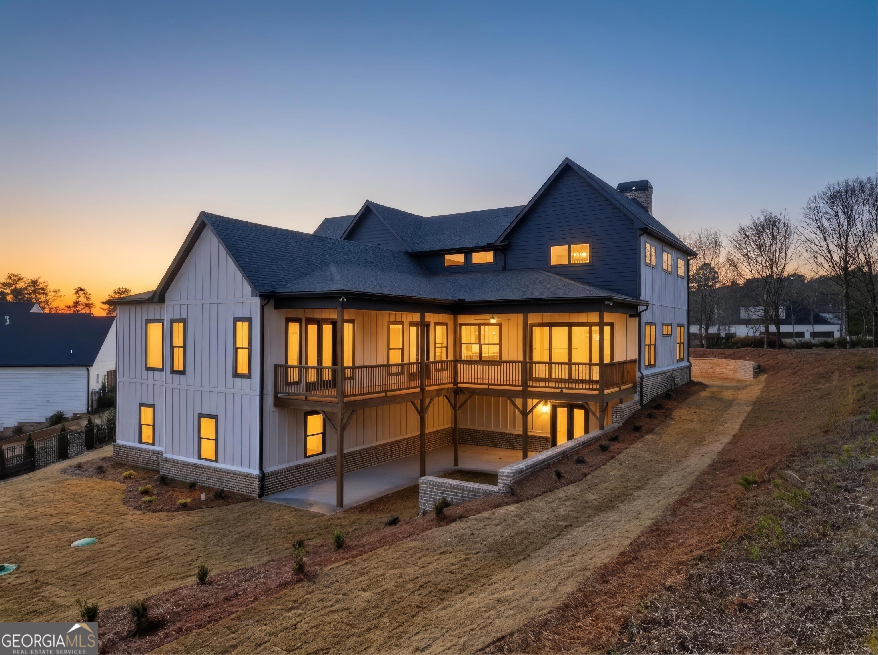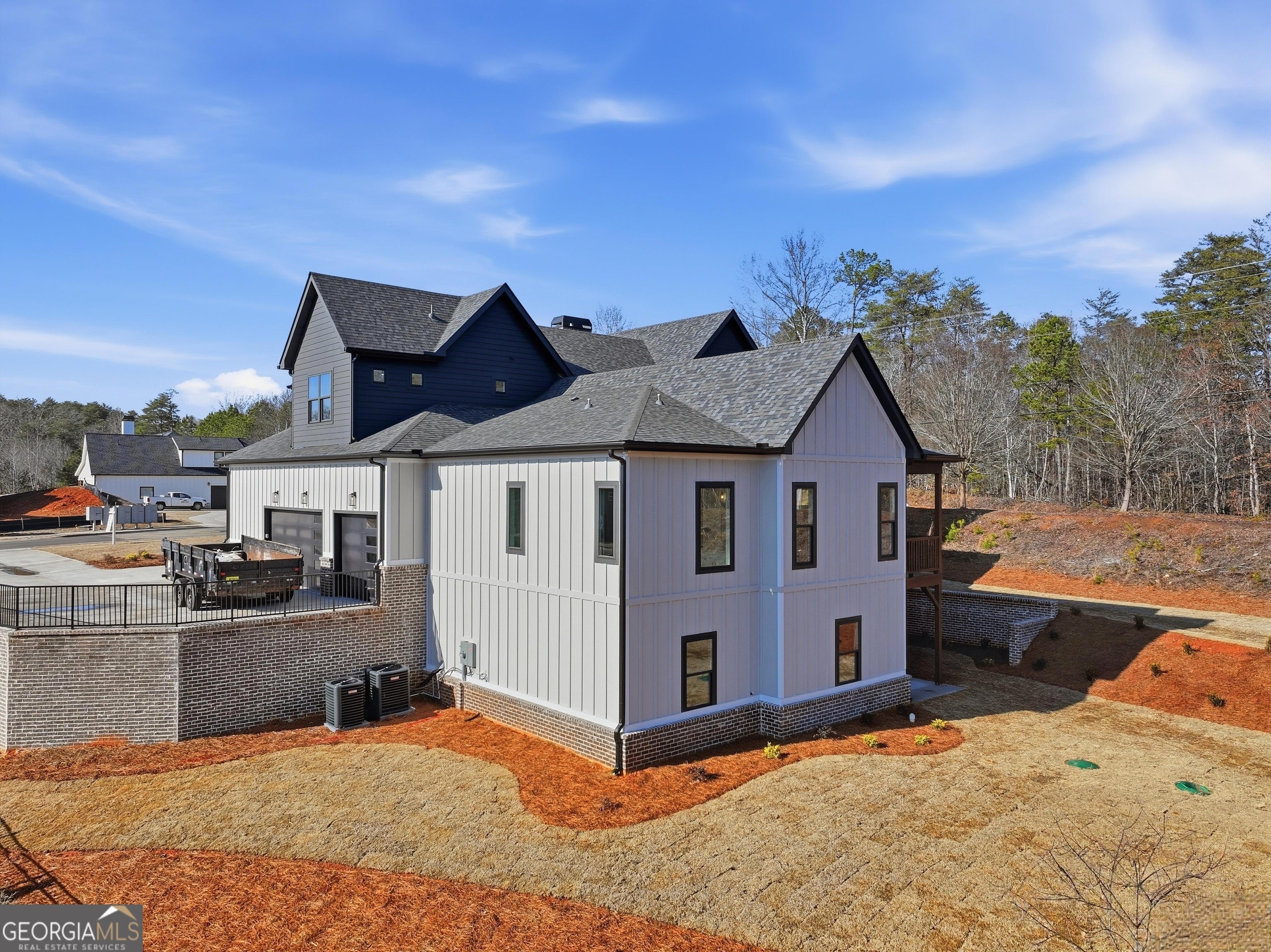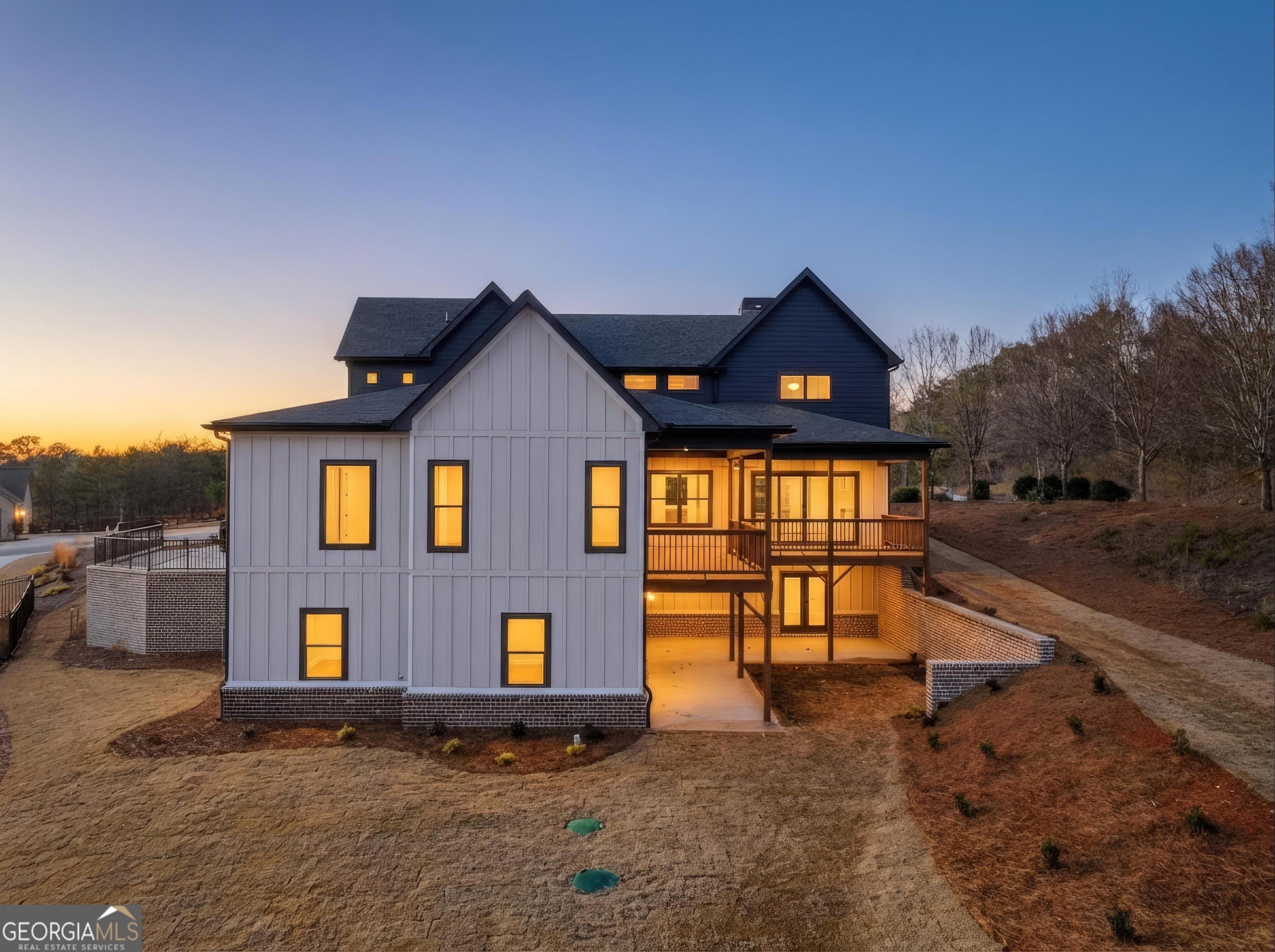Welcome to 6003 Bluewater Blvd, Gainesville, GA, a stunning new construction home that blends modern farmhouse style with thoughtful craftsmanship. This beautifully designed residence features eye-catching curb appeal with board-and-batten siding, brick accents, and architectural rooflines that make a lasting first impression. Inside, the home opens to a bright, airy living space with soaring ceilings, expansive windows, and elegant trim details that adds warmth and character. Natural light floods the interior, highlighting the hardwood floors and upscale finishes throughout. Statement chandeliers and exposed wood beam create a perfect focal point for entertaining or relaxing. The exterior living space is equally impressive, offering a spacious covered back deck ideal for outdoor dining, gatherings, or enjoying peaceful views of the surrounding landscape. The walk-out lower level provides additional flexibility and potential for future living or recreational space. Thoughtfully designed with quality materials and modern style, this home offers the perfect balance of comfort, function, and timeless appeal-all nestled in a desirable Gainesville location. A must-see property that truly stands out.