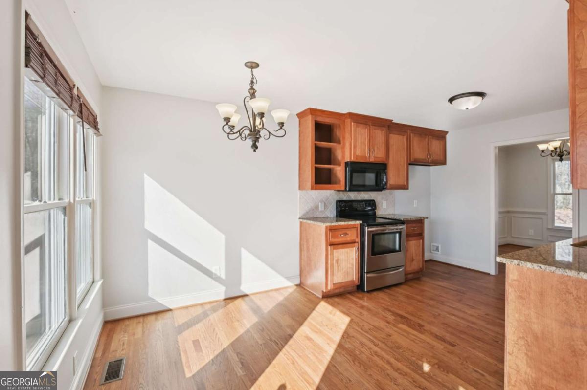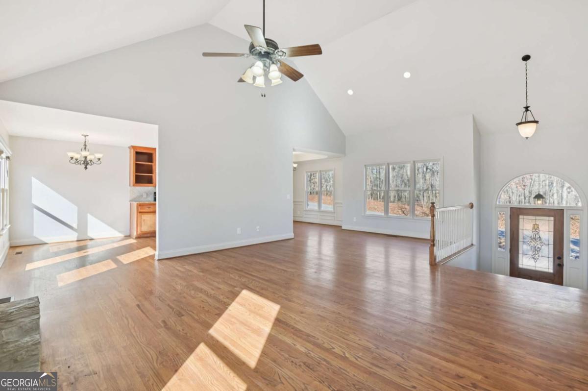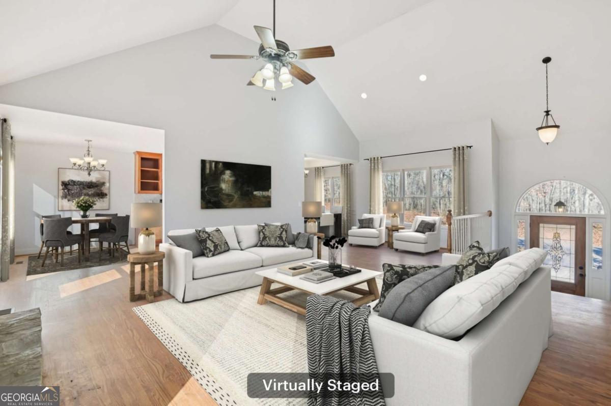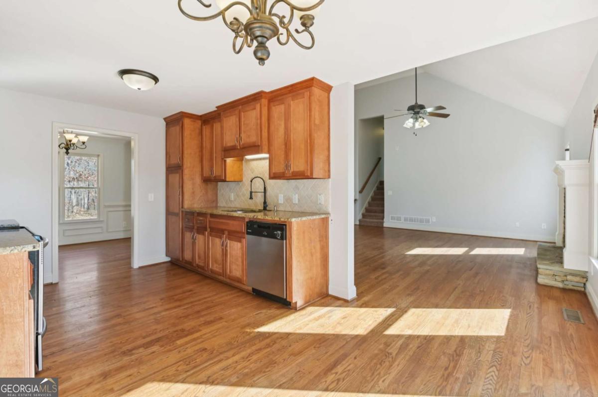 Beautiful 4-bedroom, 3-bath single-family home located in desirable Haynes Crossing! This stately home welcomes you with a huge Southern-style front porch-perfect for relaxing on cool Georgia evenings. Inside, hardwood floors run throughout the main living areas, including a formal dining room with a tray ceiling and ample space for entertaining. The bright and open family room features a vaulted ceiling and wood burning cozy fireplace, creating a warm and inviting atmosphere. The spacious kitchen offers a breakfast area, tile backsplash, granite countertops, and stainless steel appliances. Huge MIL/guest suite has a door that closes it off to the rest of the home with a living space, bedroom, full bath, and laundry room. Upstairs, retreat to the primary suite with an en-suite bath featuring dual vanities, a soaking tub, and a separate glass-enclosed shower. 2 additional bedrooms provide plenty of space for everyone! The large garage and unfinished basement offer abundant storage and endless possibilities-perfect for a man cave, craft room, home office, or more! The basement includes a walkout to the side yard. Enjoy a spacious backyard backing up to woods for ultimate privacy and a spacious deck to enjoy it all. No HOA! Conveniently located with an easy commute to Canton and Cartersville. Book your tour today!