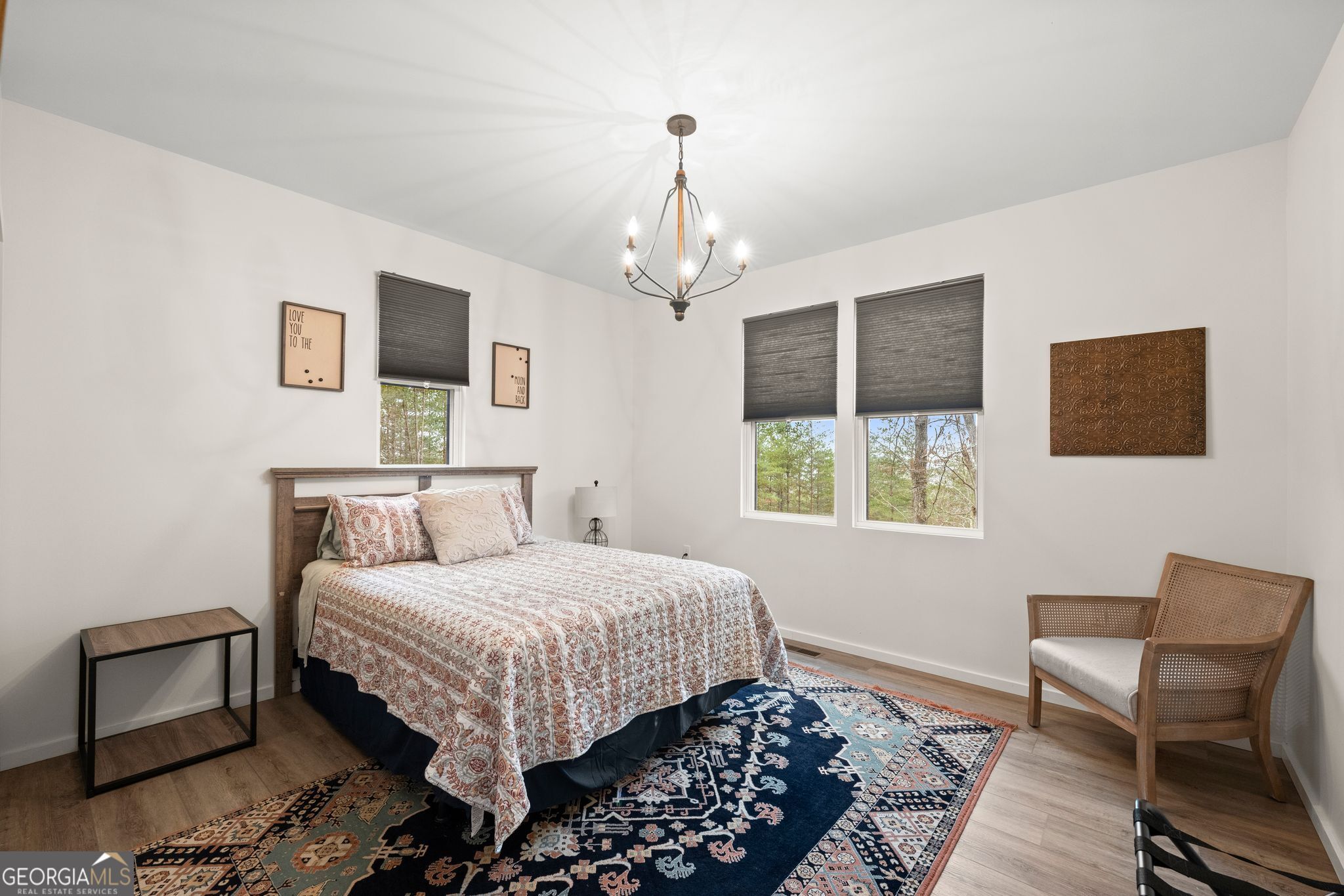 Stunning new construction on just over 2 acres in a quiet, low-traffic community. Not in Dahlonega city limits-perfect as a primary home or short-term rental. Features a luxurious first-rate master bath with tile wet area, soaking tub, rain-head shower, and granite double-sink vanity. Two additional bathrooms with granite vanities and tile showers. Three bedrooms upstairs plus a main-floor bedroom ideal for guests or an in-law suite. Covered front porch, separate laundry with tankless water heater, and exterior entry. Blacktop driveway with ample flat parking at the top. Tree trimming could reveal mountain views. Turnkey, pristine condition-ready to move in or start hosting.