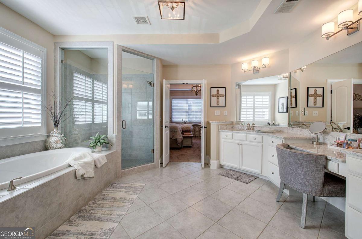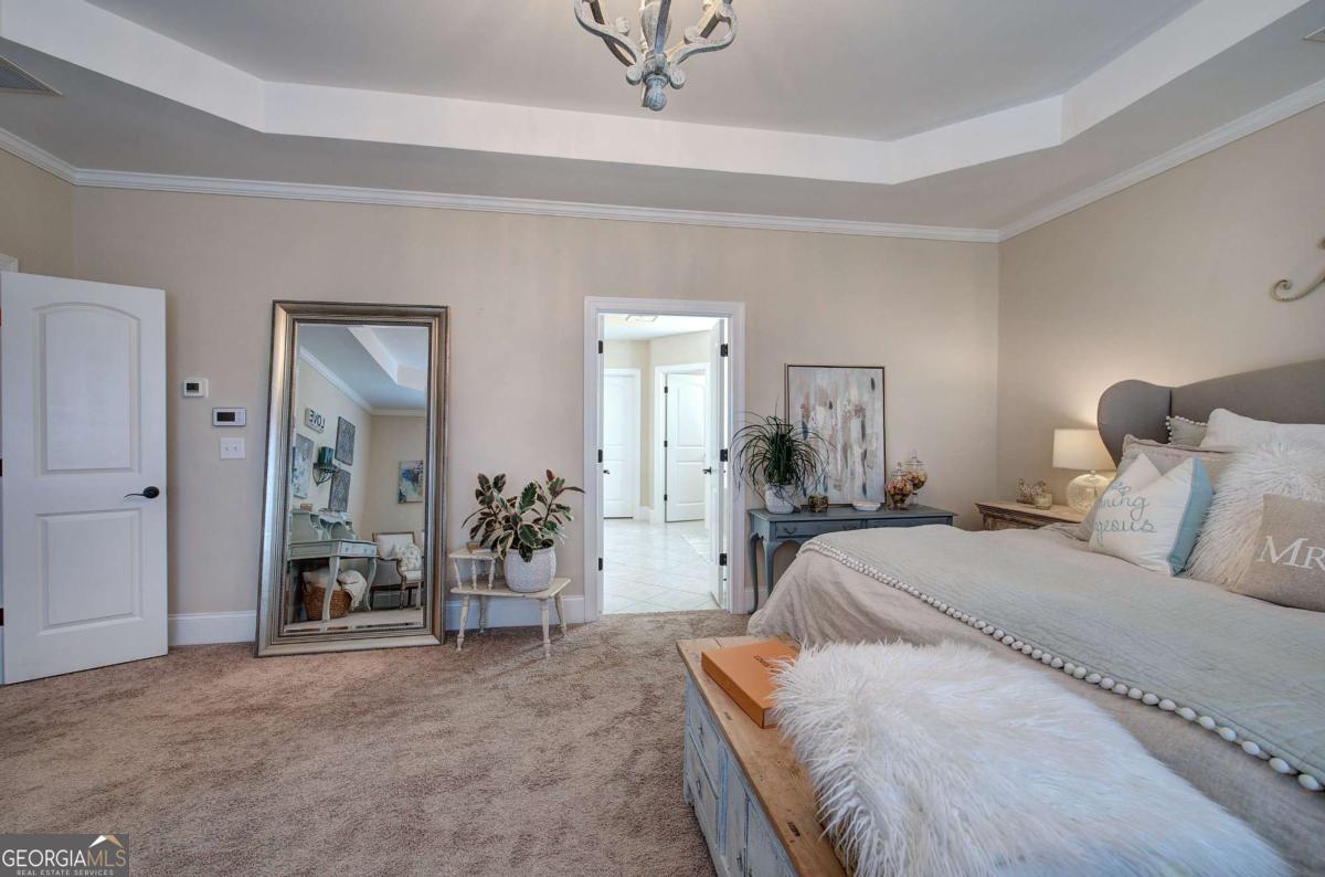 - Interior FeaturesBeamed Ceilings, Bookcases, Double Vanity, High Ceilings, Tray Ceiling(s), Vaulted Ceiling(s), Walk-In Closet(s)