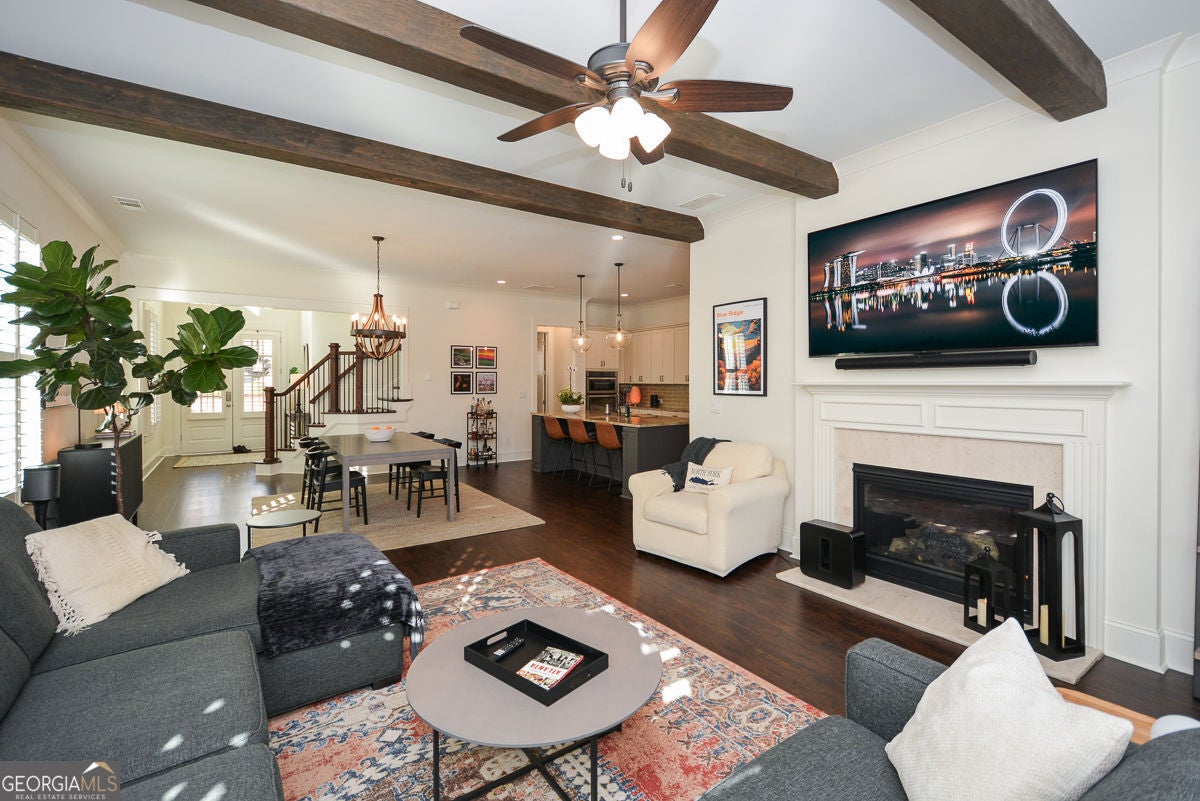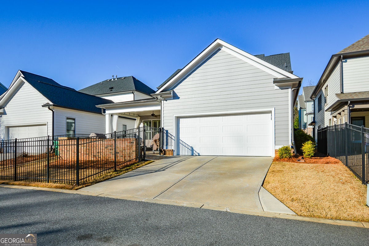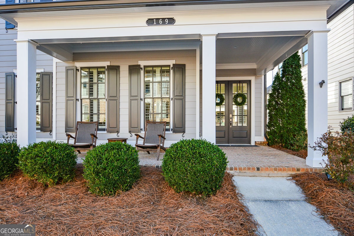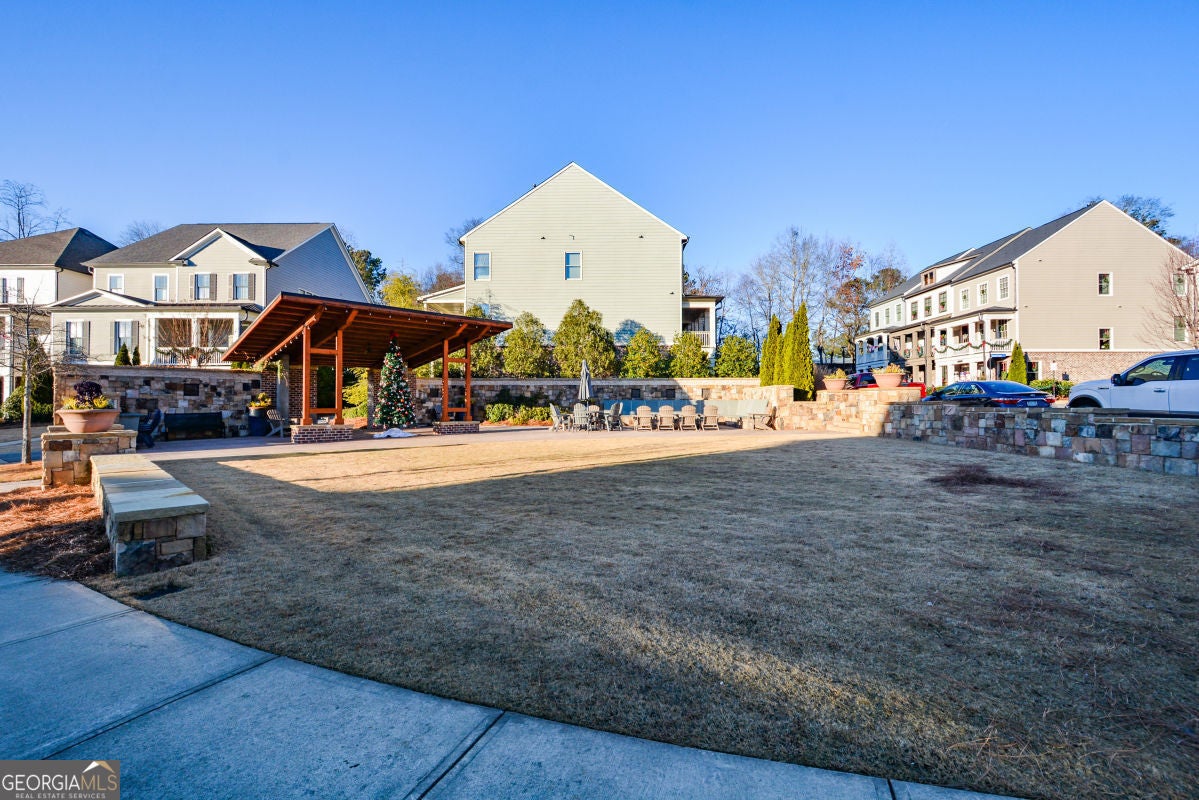 One of the most charming homes you'll ever see, this impeccably maintained residence features graceful architectural details and a welcoming, open layout that feels both warm and timelessly elegant. From the inviting porches to the thoughtfully designed interiors, the home blends classic character with modern comfort, making it a true standout in the neighborhood. The main level offers a spacious primary suite with dual vanities, a soaking tub, separate shower, and two walk-in closets. An open floor plan highlights 10-foot ceilings, crown molding, and engineered hardwood floors throughout. The stunning kitchen is a true centerpiece, featuring granite countertops, tile backsplash, stainless steel appliances, gas cooktop, oversized island, abundant cabinetry, and an impressive walk-in pantry. A convenient mudroom and laundry room complete the main level. Upstairs includes three additional bedrooms, two full baths, and a large, light-filled loft. The great room is anchored by a gas-start fireplace and opens seamlessly to a covered back deck overlooking a custom-designed backyard with a stone and river rock patio, built-in fireplace, gas grill, and fully fenced yard-ideal for entertaining or everyday enjoyment. Additional highlights include a rear-entry two-car garage with driveway parking and ample street parking. Residents enjoy resort-style amenities including a community pool, pool gazebo with restrooms, Blue Stone Park, and a dog park. Located just off the Woodstock Trail System and only one mile from downtown Woodstock, this golf-cart-friendly community offers easy access to shopping, dining, concerts, and more-perfectly balancing city convenience with neighborhood charm.