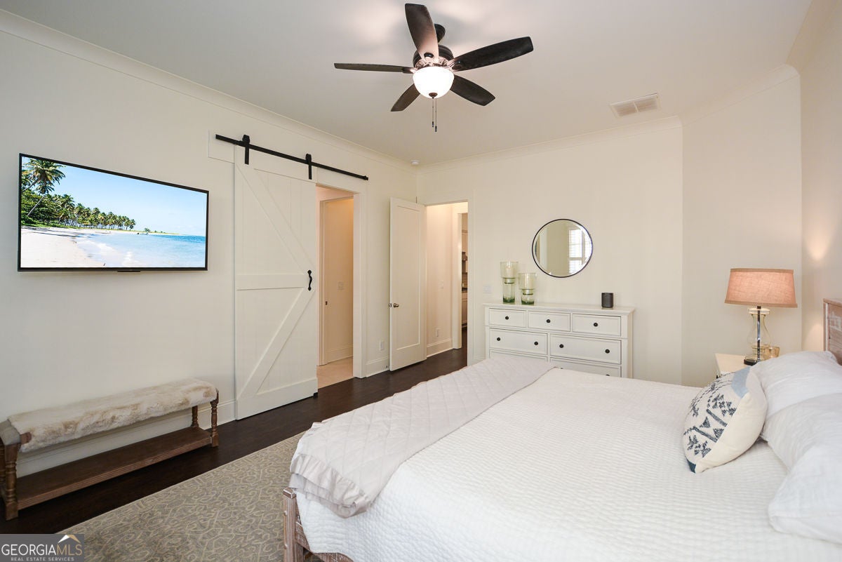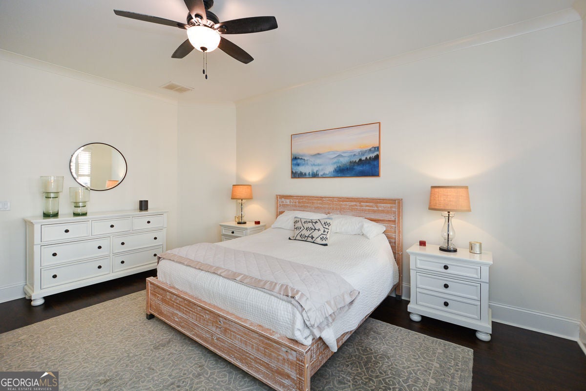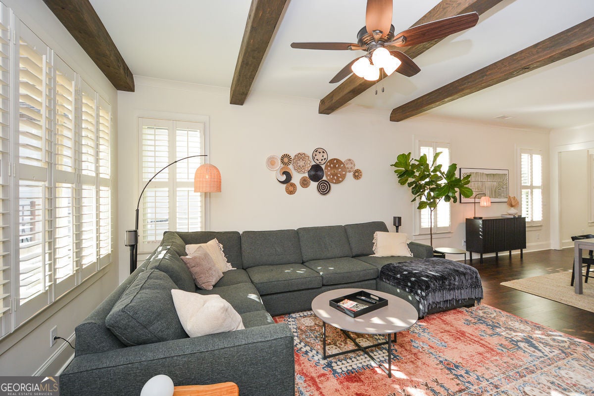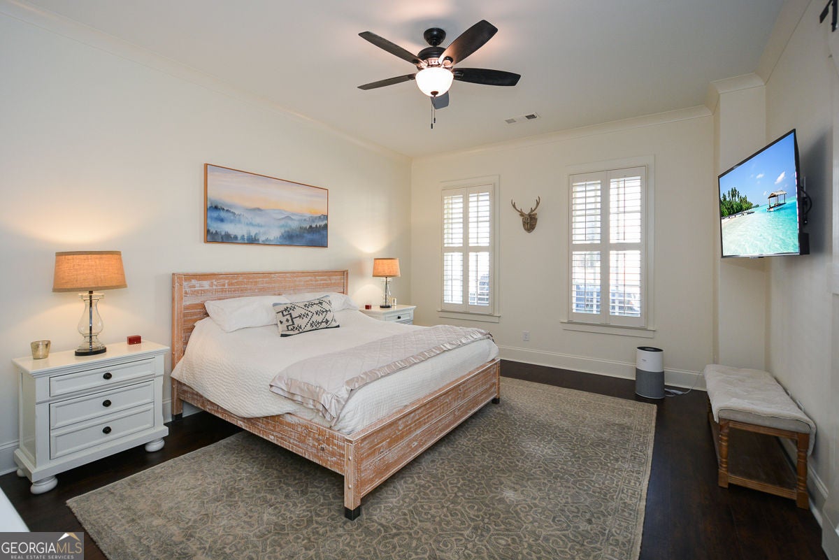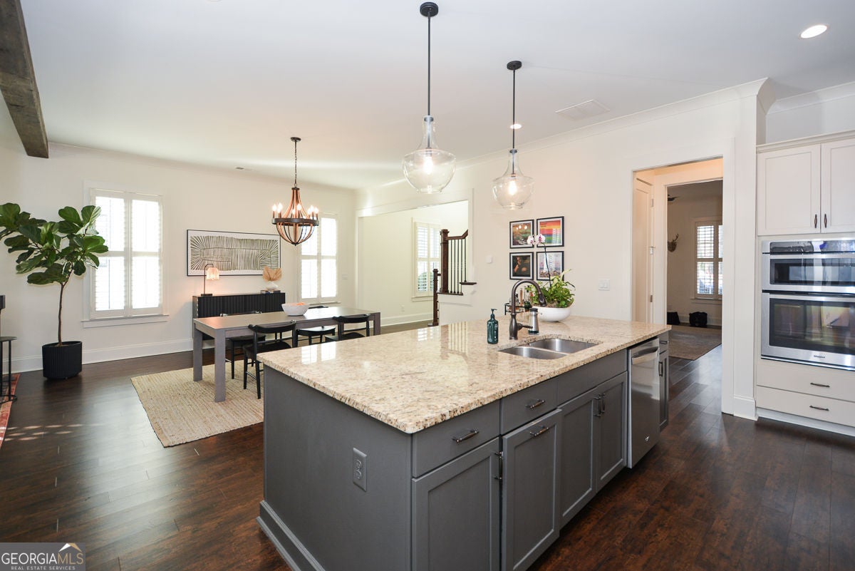 One of the most charming homes you'll ever see, this impeccably maintained residence features graceful architectural details and a welcoming, open layout that feels both warm and timelessly elegant. From the inviting porches to the thoughtfully designed interiors, the home blends classic character with modern comfort, making it a true standout in the neighborhood. The main level offers a spacious primary suite with dual vanities, a soaking tub, separate shower, and two walk-in closets. An open floor plan highlights 10-foot ceilings, crown molding, and engineered hardwood floors throughout. The stunning kitchen is a true centerpiece, featuring granite countertops, tile backsplash, stainless steel appliances, gas cooktop, oversized island, abundant cabinetry, and an impressive walk-in pantry. A convenient mudroom and laundry room complete the main level. Upstairs includes three additional bedrooms, two full baths, and a large, light-filled loft. The great room is anchored by a gas-start fireplace and opens seamlessly to a covered back deck overlooking a custom-designed backyard with a stone and river rock patio, built-in fireplace, gas grill, and fully fenced yard-ideal for entertaining or everyday enjoyment. Additional highlights include a rear-entry two-car garage with driveway parking and ample street parking. Residents enjoy resort-style amenities including a community pool, pool gazebo with restrooms, Blue Stone Park, and a dog park. Located just off the Woodstock Trail System and only one mile from downtown Woodstock, this golf-cart-friendly community offers easy access to shopping, dining, concerts, and more-perfectly balancing city convenience with neighborhood charm.