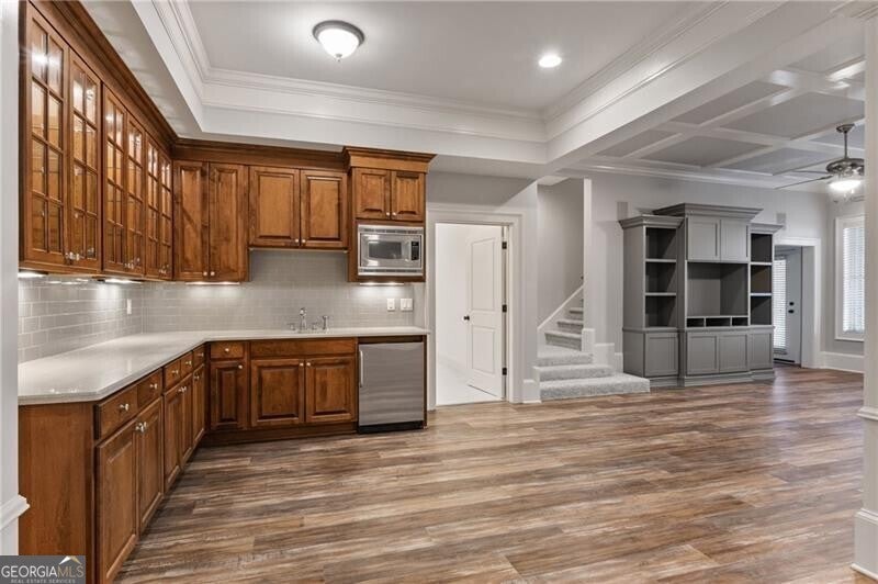 Situated on a private 1-acre wooded homesite in a charming 15-home community, this beautifully designed residence offers space, flexibility, and an ideal location. Just minutes from a new Publix, popular dining and shopping, Crystal Lake Golf Club, and the new Mount Carmel Community Center with fitness facilities and pickleball. I-75 is only 8 minutes away. The main level features 10-foot ceilings, 8-foot doors, and an open designer kitchen with new quartz countertops, oversized island, custom cabinetry, and updated fixtures, flowing into a large family room with fireplace. Additional spaces include a formal dining room and a formal living room, perfect for a home office or sitting area. The owner's suite includes a spacious bath with dual vanities, whirlpool tub, walk-in shower, and generous storage. Enjoy covered outdoor living areas on both main and terrace levels, ideal for entertaining or relaxing in the private setting. The finished terrace level offers a private guest suite with bath, full kitchen, game area, and exercise room-perfect for guests or extended family. A 3-car garage with epoxy flooring plus a 4th basement garage bay provides ample storage. Additional highlights include two children's playhouses, two front entrances, including a Friends' Porch, fresh paint, and a newer roof with Tech Shield energy barrier sheathing.