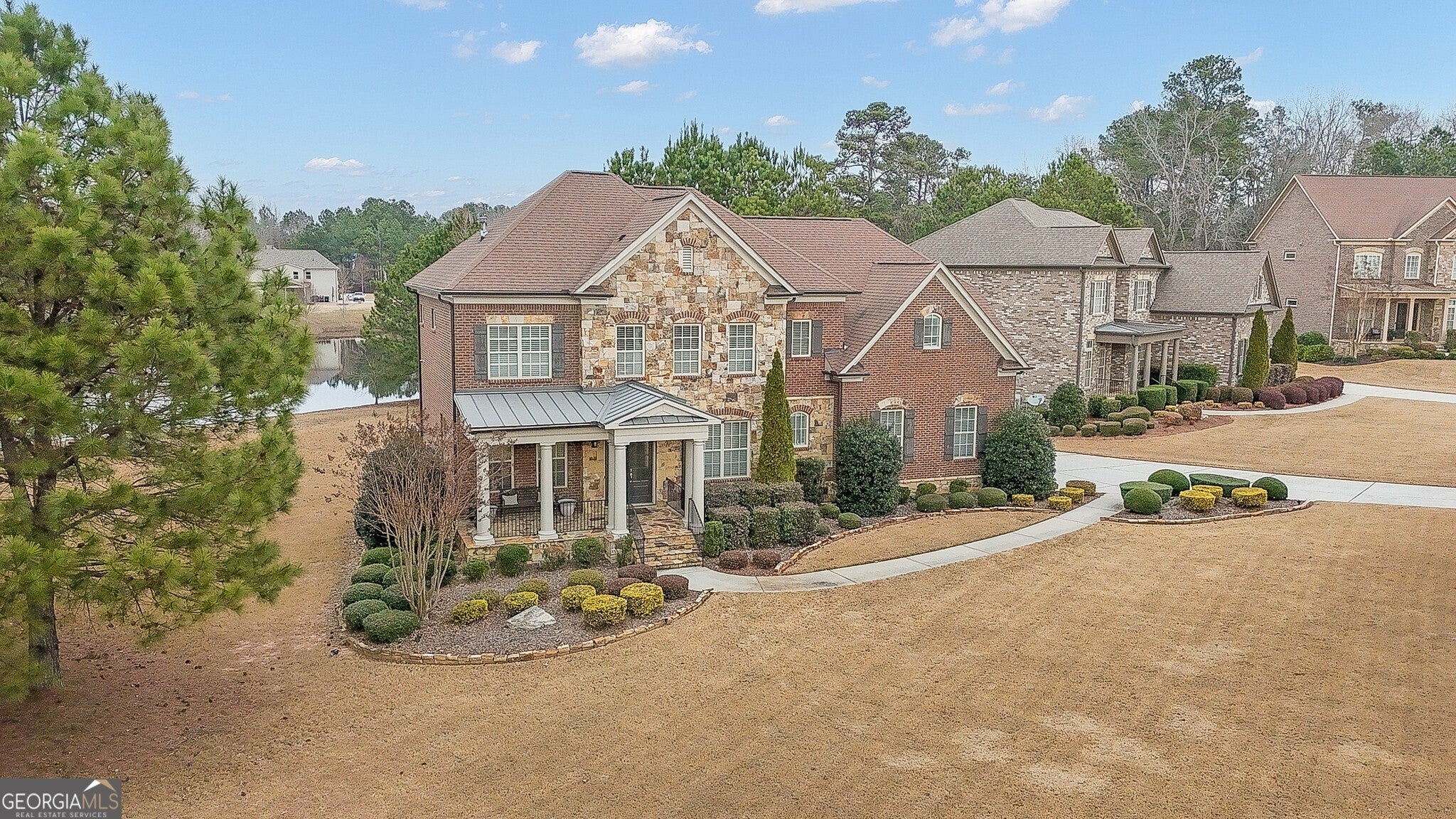 Experience this stately 5-bedroom residence, beautifully positioned to capture serene water views and surrounded by meticulously manicured landscaping. This elegant 3-sided brick home, accented with timeless stone detailing, welcomes you with a gracious flagstone front porch. Inside, an impressive light-filled foyer opens to expansive living and entertaining spaces. The flowing open floor plan features a grand formal dining room, a spacious breakfast room, and an inviting keeping room-designed for effortless gatherings. At the heart of the home, the kitchen offers an island, stone countertops, and stainless steel appliances, creating a perfect blend of sophistication and functionality. The adjoining family room is anchored by a beautiful fireplace framed with custom built-ins, offering a warm backdrop for both casual living and elegant entertaining. The luxurious primary suite is a true retreat, complete with a private office/sitting room and dual walk-in closets outfitted with custom cabinetry. Primary bath with separate soaking tub and separated double vanities. A secondary bedroom with a full bath on the main level provides rare flexibility for guests or multigenerational living. With 5 bedrooms and 4 full baths, including an ensuite bedroom upstairs, this home is thoughtfully designed for comfort and privacy. Outdoor living is elevated with a charming paver patio and fire pit-an ideal setting to unwind while taking in the tranquil water views. Situated in a highly sought-after swim/tennis community featuring parks and playgrounds, this property offers an exceptional lifestyle just minutes from I-85 and a short drive to Hartsfield-Jackson International Airport. A perfect blend of elegance, convenience, and resort-style amenities-this luxury home is not to be missed.