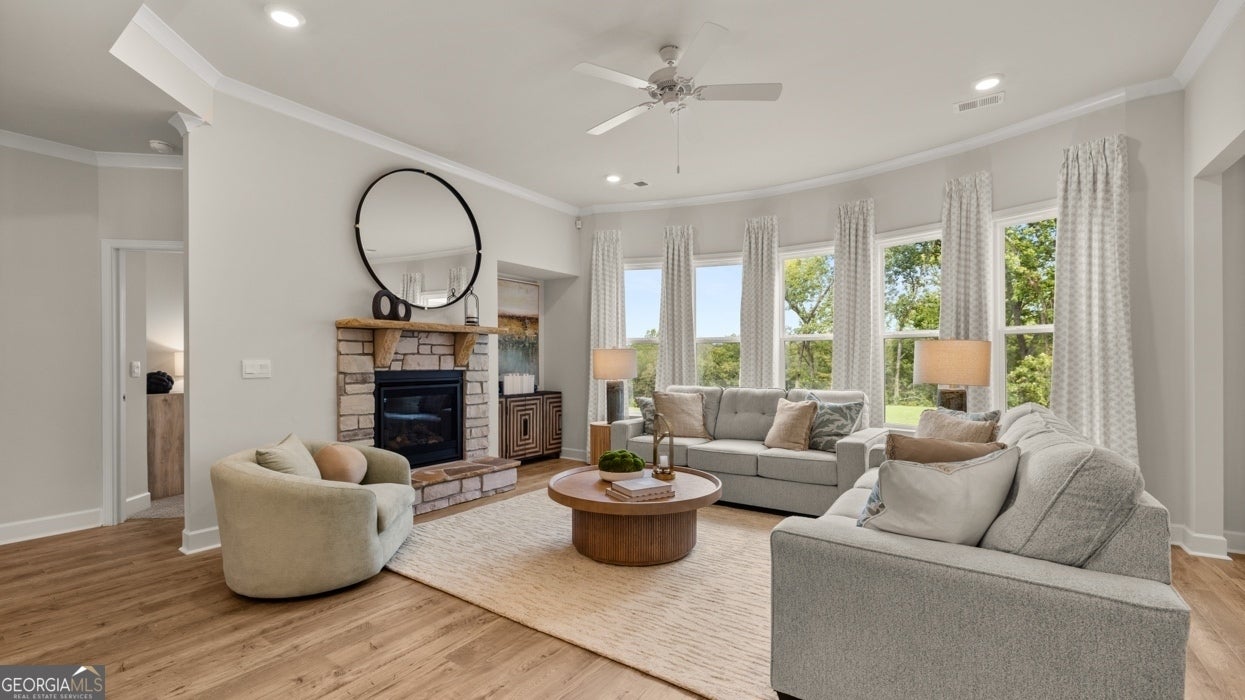 GOLF CART PATH TO HISTORIC DOWNTOWN SENOIA | MINUTES TO PEACHTREE CITY WITHOUT THE PRICE TAG | OVERSIZED LOTS WITH TREE LINED BACKYARD PRIVACY. The Savannah floorplan at Heritage Pointe is a 5 bedroom, 4 bathroom two-story home. The 2-car garage ensures plenty of room for vehicles and storage. Classic and timeless, this incredible design offers a formal dining room and formal living space upon entry. Create a separate living area or a dedicated home office depending on your lifestyle. Beyond the foyer you're greeted by a spacious family room with a dramatic wall of bowed windows. The family room flows effortlessly into a casual breakfast area and a well-appointed kitchen featuring an island with bar stool seating, contemporary cabinetry, stainless steel appliances and beautiful quartz countertops. A guest bedroom and full bath complete the main level. Upstairs offers a private bedroom suite that is truly like no other. From the spacious sleeping quarters to the separate sitting room featuring the same dramatic bowed windows downstairs, you will be surrounded in luxury. Adjoining is a spa-like bath with dual vanities, separate shower, garden tub and extra closet space. There are three secondary bedrooms, two that share a split bath for the ultimate in convenience. Our homes are not only well designed, they're also smart, as each comes standard with our industry-leading suite of smart home technology that allows you to monitor your home. Photos used for illustrative purposes and may not depict actual home.