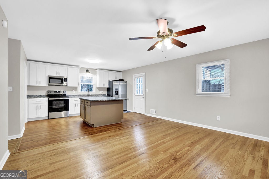 Updated four-sided brick ranch with garage in the heart of desirable Smyrna! This move-in-ready home offers an unbeatable location just minutes from Smyrna Market Village, Cobb Park, the Silver Comet Trail, and Truist Park at The Battery, with easy access to shopping, dining, schools, and entertainment. Inside, hardwood floors run throughout an inviting open-concept layout featuring a spacious family room and a beautifully updated kitchen with all-new cabinetry, a large island with granite countertops, and a full suite of updated appliances. A true laundry room adds everyday convenience. The home offers three bedrooms, including a primary bedroom with its own half bath, plus a centrally located, fully updated full bathroom with tiled shower, tile flooring, and upgraded vanity. Downstairs, the finished basement provides incredible flexibility-perfect for a fourth bedroom, home office, gym, or recreation space-and connects to a generous garage with ample room for storage, bikes, or golf carts in addition to parking. Fresh paint throughout, new gutters, a newer roof, and newer HVAC systems complete this exceptional offering. Schedule your private showing today-this Smyrna gem won't last!