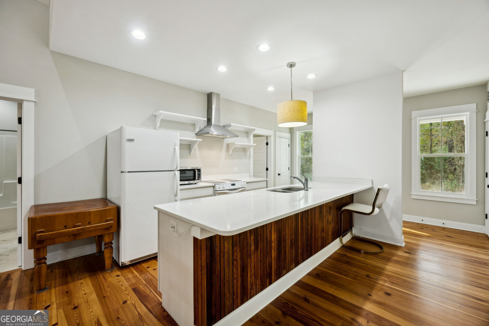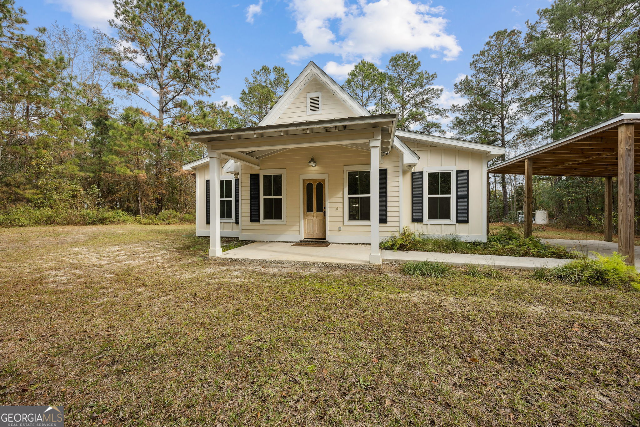 Custom built in 2018 by well-known local builder Terry Stover, this thoughtfully designed Craftsman-style home sits on 1.85 acres with peaceful lake views and a sense of privacy that's hard to find. From the moment you arrive, the private drive, covered carport, and exterior blend of board-and-batten and lap siding set the tone for the quality and character throughout. Inside, the home lives larger than its footprint. The open-concept living, dining, and kitchen area features vaulted ceilings, heart pine plank floors, Craftsman trim surrounding every window, doorway, and baseboard, and a beautiful stained-glass accent window that fills the space with natural light. Ceiling fans are located in the living area and both bedrooms for year-round comfort. The kitchen offers quartz countertops, a breakfast bar, industrial-style stainless steel hood, and open shelving, blending function with timeless style. Barn-door loft-style doors provide attic access while adding architectural interest. The split bedroom layout provides privacy with bedrooms on opposite sides of the home. One bedroom features a private bath with a reclaimed-wood vanity, walk-in subway-tile shower with mosaic floor, and a walk-in closet with window. The secondary bedroom includes two closets, a transom window, and direct access to the second full bath, which is also accessible from the main living area. Both bathrooms feature reclaimed-wood vanities, tile flooring, and industrial-style lighting. Additional highlights include carpeted bedrooms, tile bathrooms and laundry room, interior laundry with shelving (washer and dryer included), fully encased windows, and inviting covered front and back porches, with the rear porch overlooking the lake. Tucked behind a wooded setting yet surrounded by neighboring homes, this property offers the perfect balance of privacy and connection. Riverfront access is a short walk away, and no city taxes apply. A truly special home designed with intention, craftsmanship, and comfort in mind.