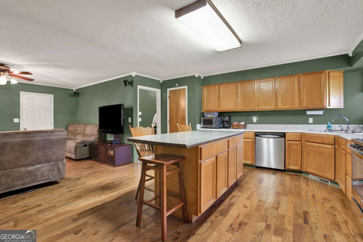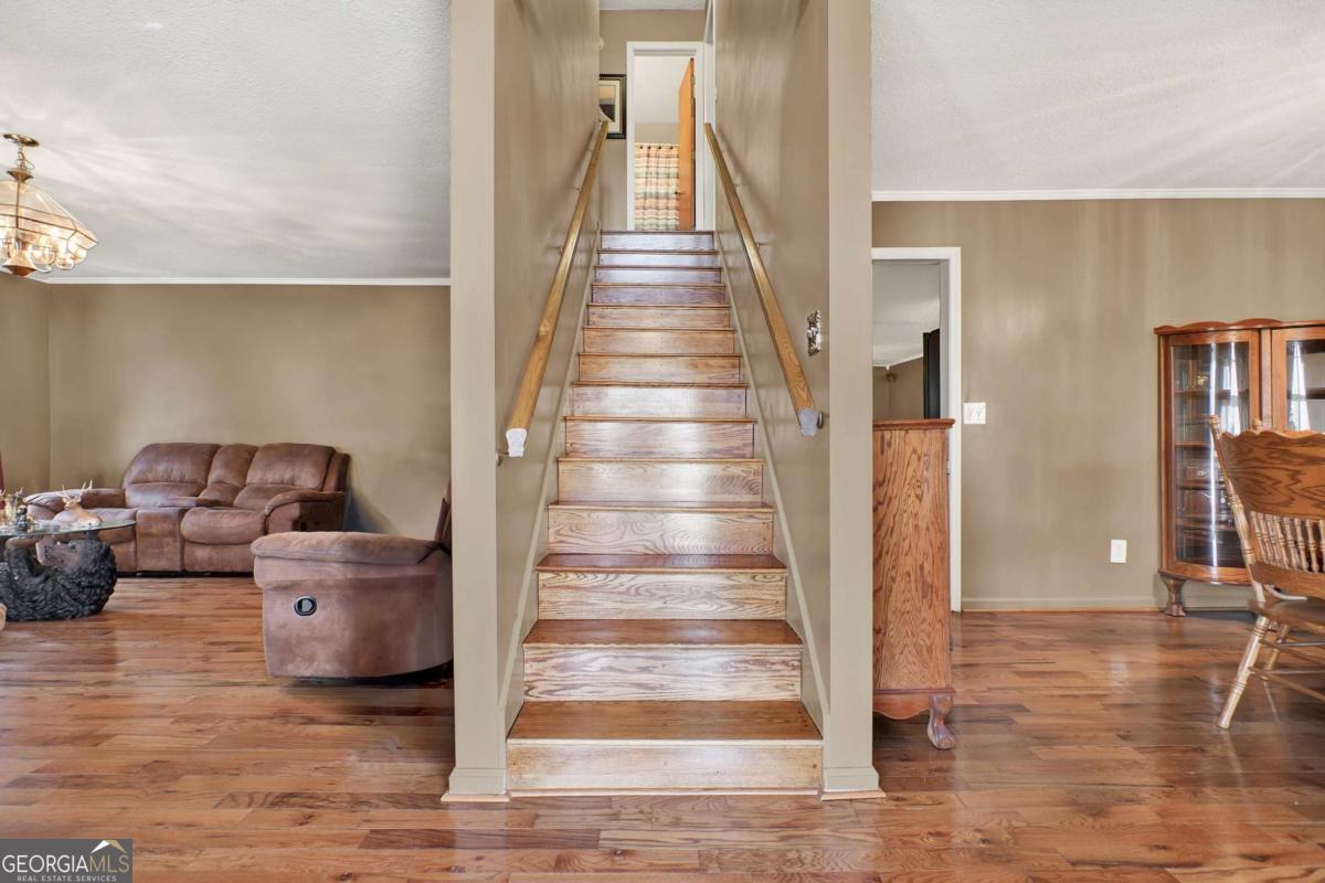 USDA Eligible - Qualifies for No Down Payment! Level lot with concrete walkway and front porch featuring white railing, columns, and beadboard ceiling. Three dormer windows flood the interior with natural light. Flowing polished hardwood flooring, central natural stone constructed fireplace with wooden mantel, and hardwood staircase with wooden handrails on both sides. Large window positioned strategically providing clear, unobstructed view of the entrance to effortlessly observe the arrival of guest. Blinds convey for added privacy and light control. Open layout kitchen enhancing easy flow & functionality with wood cabinets integrated to fit the kitchen layout perfectly maximizing storage space, plus window above kitchen sink. Dedicated laundry room with open shelving facilitates clutter free environment. Walk-in closets, large whirlpool soaking tub, separate tile shower, and tile flooring extending up the wall blending perfectly. Distinguished den space framed with crisp white crown molding ensures generous seating arrangements. 16X34 back deck with white vinal railing offers ample space for lounging, social gatherings, and hosting memorable occasions. 2 car garage providing security and keep your vehicle safe from the elements. Metal roof offers durability, longevity, and significant savings on energy bills. 20X30 boat garage equipped with central heating & air, double garage door, and remote-control access. 18X36 metal carport with peaked roof plus additional 12X24 & 12X12 storage buildings. Picture perfect pond mirrors the sky surrounded by lush trees. Sence of seclusion - no back neighbors!!!