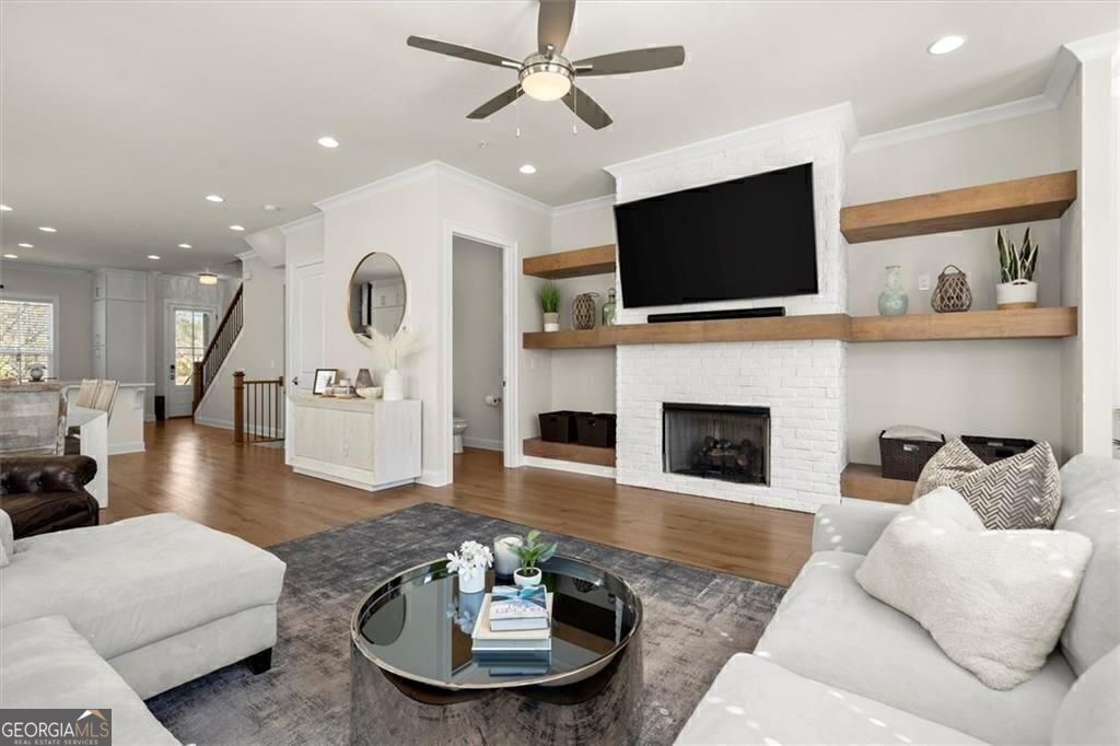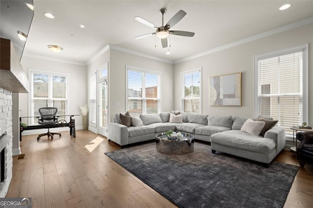 Discover the epitome of upscale living in this stunning townhome, nestled perfectly between the Avalon shopping district and Downtown Alpharetta City Center. Enjoy the finest in dining, boutique shopping, free concerts, food/music festivals and seasonal farmer's markets, all within easy reach. Nestled in the prestigious sought after gated Chelsea Walk community, this stunning end-unit three story townhome offers the perfect blend of privacy, luxury and convenience, with a large fenced dog park, private pocket park, and direct and secure access to the Alpha Loop. This townhome offers plenty of natural light, 3 bedrooms, 3 and 1/2 baths, and over 2,500 square feet of luxurious living space. The open floor plan seamlessly connects the kitchen, family room, and sunroom/office creating a spacious and inviting atmosphere. The gourmet kitchen features stainless steel appliances, upgraded white cabinetry, large island, stone countertops and a sleek open design perfect for hosting gatherings. The oversized primary bedroom provides a serene retreat, complemented by a spa-like master bath with upgraded oversized frameless glass shower and spacious custom closet. Two generously sized secondary bedrooms offer ample closet space and each have their own full ensuite bathroom. It also offers a private deck, three extra large storage closets, fireplace, powder room on main, laundry on upper, HOA maintained landscape and lawns, and an unbeatable location with under half a mile walk to both Downtown Alpharetta and Avalon. Don't miss this opportunity!