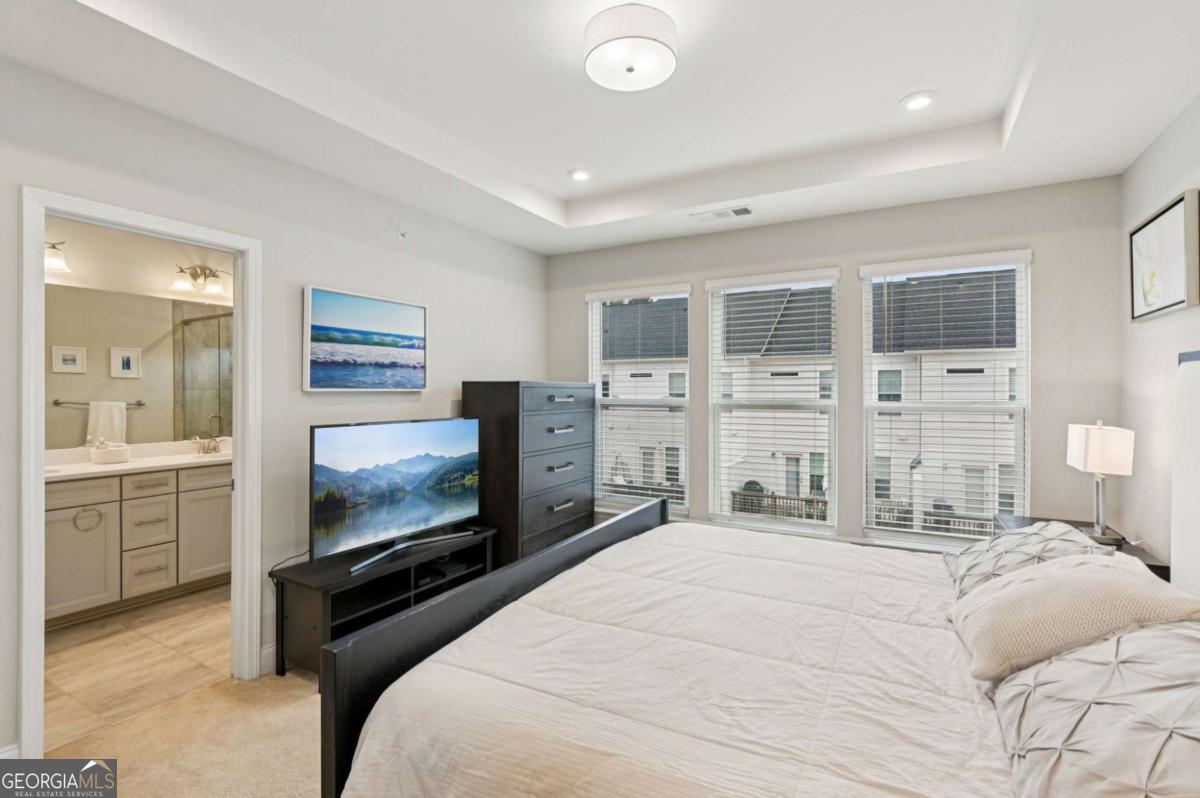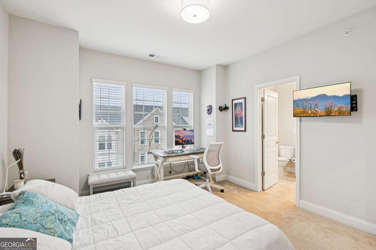 ***Bright Open Spaces ***On-Trend Finishes***Community Amenities***Convenient Location***Stately townhome ideally located next to the Alpha Loop and a stone's throw to Avalon, offering unbeatable access to shopping, dining, movies, and leisurely strolls! From Avalon, enjoy a scenic route along the Alpha Loop to downtown Alpharetta in approximately 15-20 minutes. Inside, the home features thoughtful smart-home upgrades including a Ring doorbell and Nest thermostats, both remotely managed. The entry-level offers a private bedroom with a full bath-ideal for a home office, guest suite, or flexible living space. The main living level showcases gorgeous wood floors and a bright, open living room with an accent wall, tons of natural light, and access to a private balcony. The on-trend kitchen features white cabinetry, stainless steel appliances, a spacious island with seating and storage, and a tile backsplash, flowing seamlessly into the dining area. Upstairs, retreat to the primary suite with an en-suite bath featuring dual sinks and a large, fully tiled frameless glass shower. A secondary bedroom also includes its own en-suite bath, providing comfort and privacy. The community amenities include a pool, grilling patio, and plenty of space for entertaining, making this home as enjoyable outside as it is inside. Don't miss your opportunity to tour this home today!