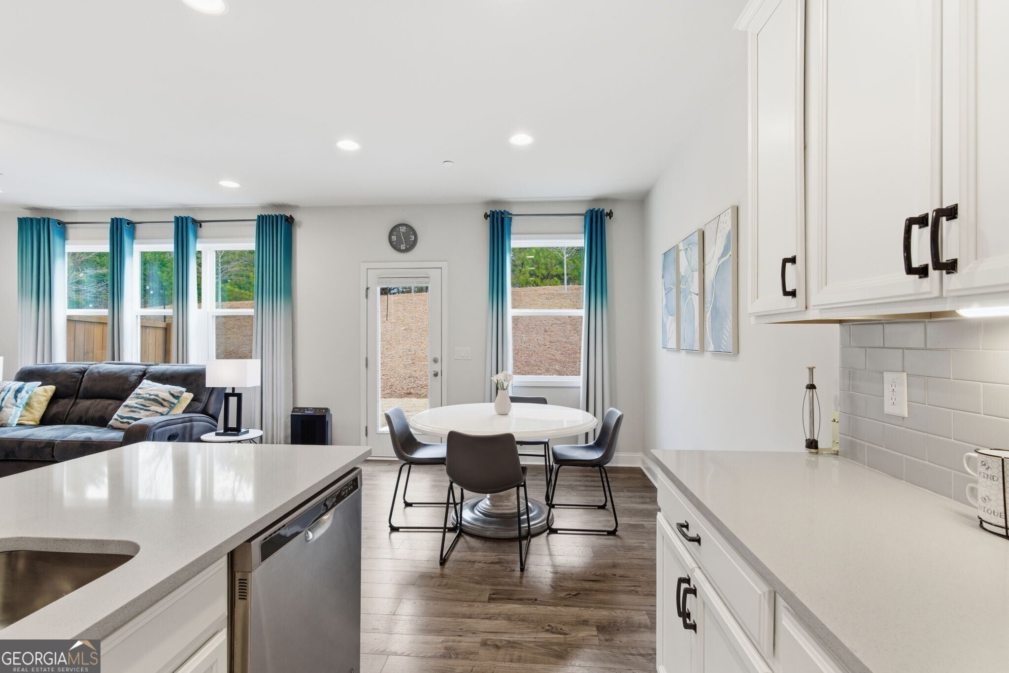 Step inside this beautifully maintained 3-bedroom, 2.5-bath townhome where modern elegance meets everyday ease. The heart of the home is a spacious open-concept kitchen featuring crisp white cabinetry, stainless steel appliances, a large island with seating, and an eye-catching backsplash ideal for casual meals or entertaining. Adjacent to the kitchen, the family room offers a warm, inviting space anchored by natural light from a wall of windows that overlook the private, tree-lined backyard. Upstairs, the generously sized primary suite is a true retreat with a tray ceiling, dual-sink vanity, soaking tub, oversized shower, an expansive walk-in closet, and a private deck. Two additional bedrooms provide flexibility for guests, a home office, or both. Throughout the home, you'll find thoughtful updates, stylish lighting, and a neutral color palette that complements any decor. Located minutes from Historic Downtown Woodstock, with easy access to major shopping, restaurants, I-575, and Hwy 92, this low-maintenance townhome is a perfect blend of style, function, and location.