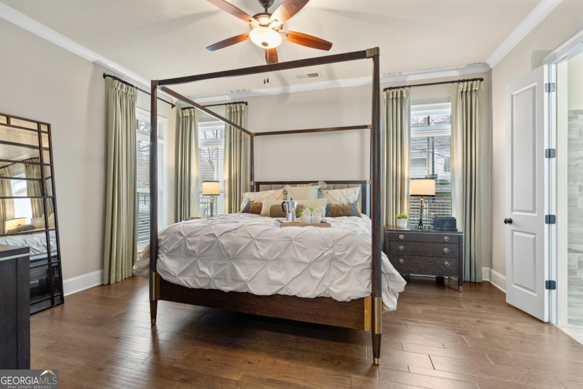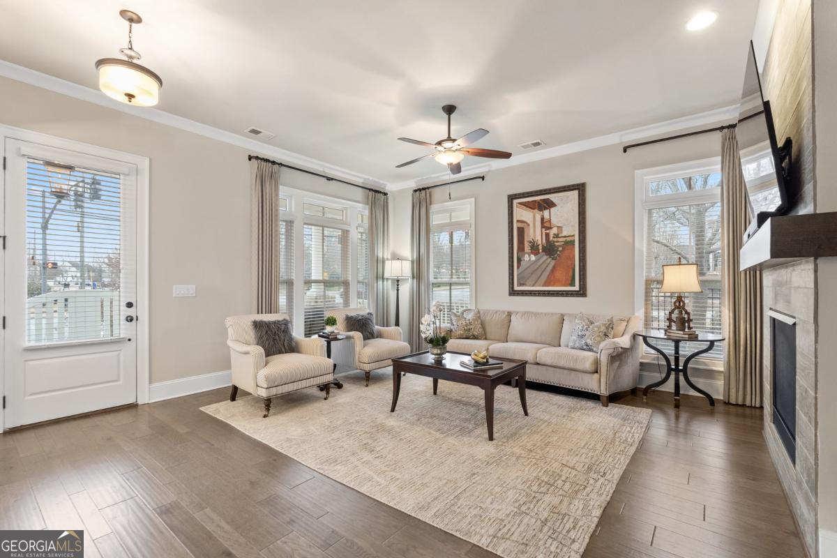 LOCATED IN THE HEART OF DOWNTOWN ALPHARETTA, THIS EAST OF MAIN HOME OFFERS A PRIMARY SUITE ON THE MAIN LEVEL, TASTEFUL FINISHES THROUGHOUT, FENCED OUTDOOR LIVING AREA AND AN OPPORTUNITY FOR A TRULY WALKABLE LIFESTYLE. Built in 2017 by The Providence Group, this former model home combines modern architecture with timeless charm, offering a lifestyle that's as sophisticated as it is convenient. The standout feature? A spacious and serene Primary Suite on the Main Level. Wake up to natural light streaming through large windows, enjoy the ample walk-in closet, and pamper yourself in the oversized, spa-like shower with dual rain showerheads and zero-entry access. It's the retreat you've been dreaming of-all without climbing a single stair. The rest of the home doesn't disappoint either. 10-Foot Ceilings on the main, accentuated by an open-concept floor plan, hardwood flooring, and designer touches throughout, create an inviting ambiance perfect for entertaining or simply relaxing. The kitchen, equipped with Quartz countertops, Wellborne cabinetry, top-of-the-line appliances, and a convenient counter-height breakfast bar, flows effortlessly into the dining and living areas. Outdoor spaces are just as impressive, featuring a front wrap-around porch and a covered patio off the breakfast room, where you can sip your morning coffee or host summer gatherings. The second level features a Loft with three secondary bedrooms and two full baths upstairs. Situated in one of Alpharetta's most coveted communities, East of Main is steps away from boutique shopping, award-winning restaurants, and the buzzing energy of Avalon and Downtown Alpharetta. Plus, with easy access to Georgia 400, Old Milton Parkway, The Windward Parkway Corporate Corridor, Avalon, Downtown Alpharetta, the AlphaLoop, nature parks, and top-rated schools, this location truly has it all! Don't miss your chance to make 98 Academy Street your next home. Schedule a private tour today and experience the perfect blend of luxury, comfort, and convenience!