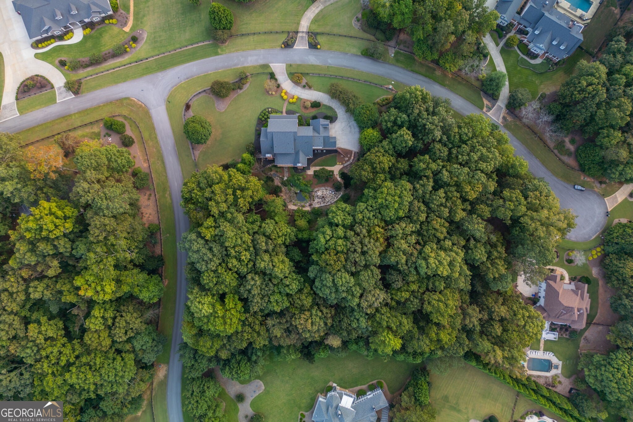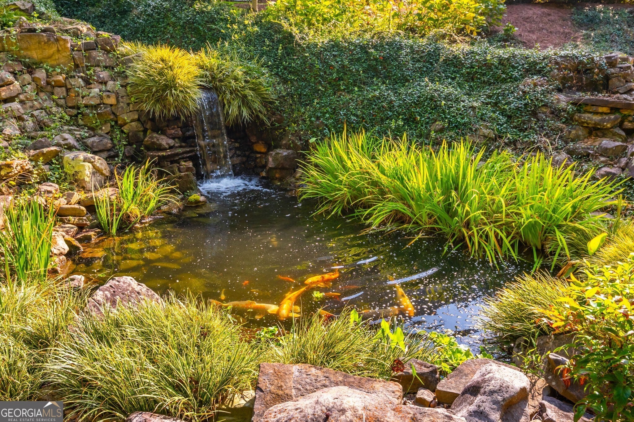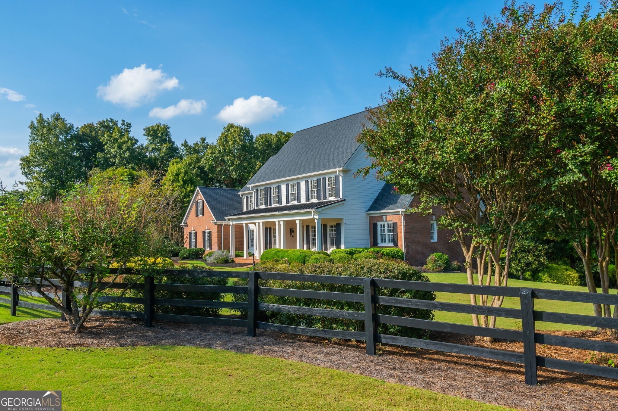 Experience timeless elegance and serene living in this custom-built estate by award-winning Chatham Homes, set on 2.5 acres in the exclusive Shoals at Arbor Hill community. This 6-bedroom, 6.5-bath residence showcases refined craftsmanship and luxurious details throughout. A welcoming Southern porch and dramatic two-story foyer lead to a large dining room with exquisite architectural accents. The living room features a coffered ceiling, built-ins, and French doors opening to a spacious deck overlooking the private backyard. Additional highlights include a butler's pantry, laundry room with office space, and abundant storage. The gourmet kitchen is the heart of the home, offering stainless steel appliances, custom cabinetry, an oversized island, and expansive counters, flowing seamlessly into a bright keeping room with fireplace. The main-level owner's suite is a private retreat with fireplace, sitting area, dual walk-ins, and a spa bath with soaking tub, dual vanities, and walk-in shower. Upstairs are four en-suite bedrooms, each with a walk-in closet. Enjoy outdoor living from the covered porch or terrace level, complete with bedroom suite, kitchenette, recreation space, and storage. The grounds feature a French-style garden, koi pond, stone fire pit, and custom stream with waterfalls. Adding to its appeal, The Shoals at Arbor Hill is an equestrian-friendly community, allowing horses on property with HOA approval -a rare lifestyle opportunity. Minutes from shopping, dining, and top-rated schools, this home offers unmatched luxury, privacy, and serenity. Welcome Home.