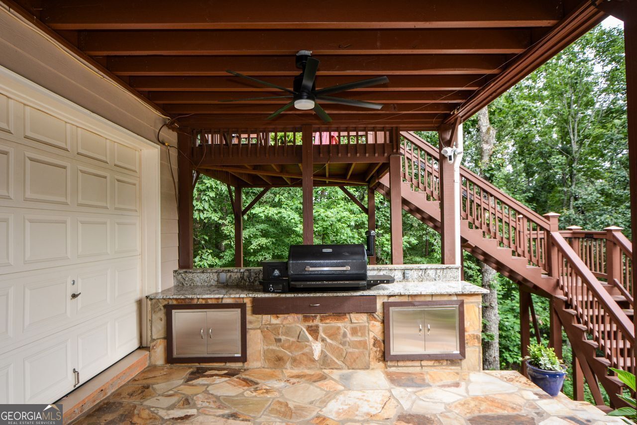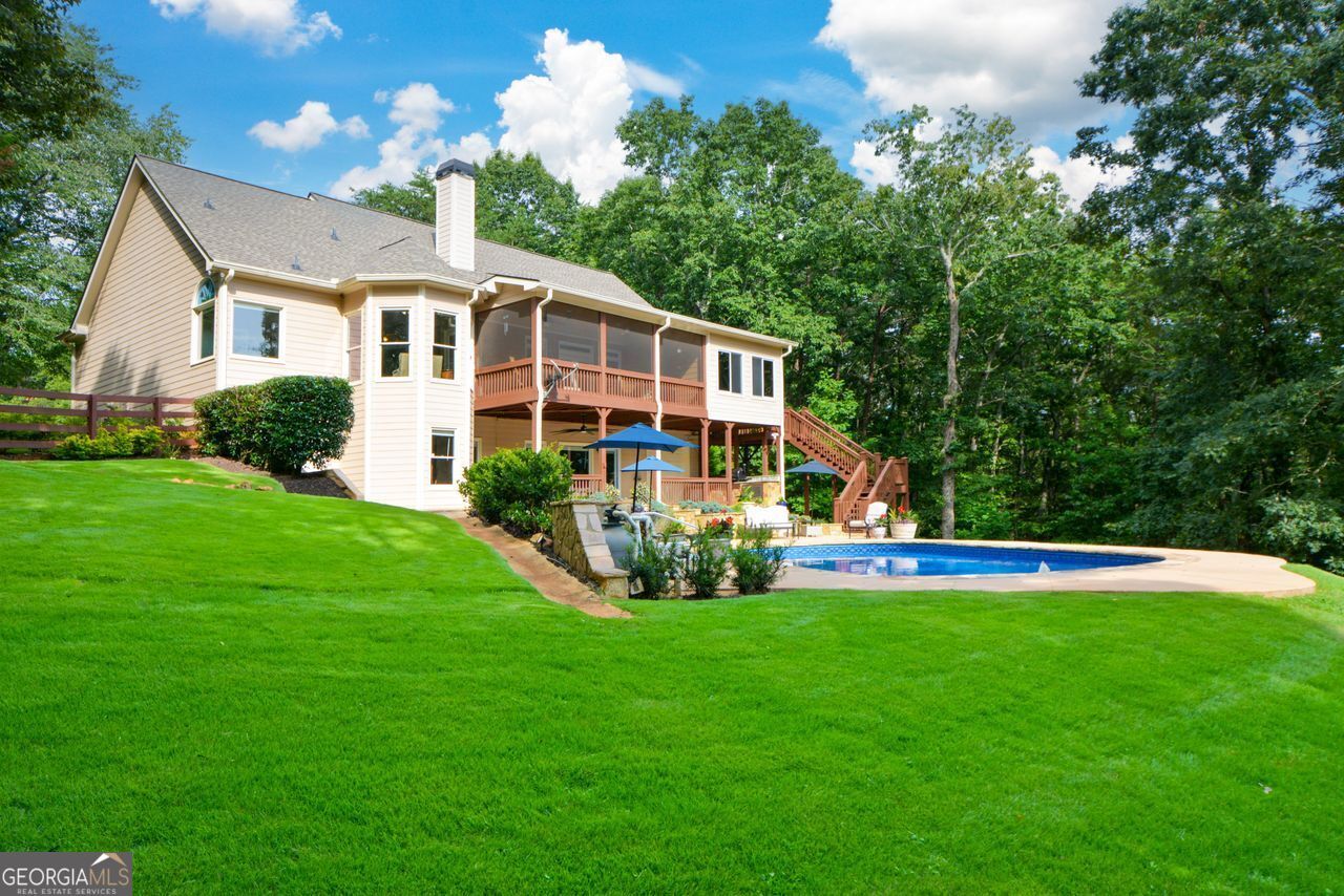 6+ Acres with mountain views, a pool framed by gorgeous flagstone and beautiful landscaping. 2 Acres fully fenced. Remaining acreage leads to Sharp Mountain Parkway -perfect for another home on 3 acres, enclosed RV or boat storage or classic car garage. Discover this beautifully crafted custom home nestled on a corner lot in the prestigious Preserve at Sharp Mountain. Your own private oasis with breathtaking views of Tally Mountain. Inside, you'll be welcomed by a warm and inviting family room featuring a floor-to-ceiling real stacked stone fireplace, flanked by built-in bookcases. French doors open to an expansive screened-in rear porch, the perfect place to unwind and enjoy serene mountain views. The open-concept kitchen boasts granite countertops, stainless steel appliances, a breakfast bar, and seamless flow into the family room-ideal for entertaining. A cozy keeping room just off the kitchen overlooks this tranquil property; creating a peaceful spot to relax any time of day. The main-level master suite includes a spacious sitting area and a luxurious bath with a soaking tub framed by corner windows, offering a spa-like retreat with scenic views. The finished terrace level provides even more living space with a second custom kitchen, family room and a private bedroom with full bath-ideal for multi-generational living or entertaining guests. Step outside to a covered full-length patio with built-in gas grill and cooking area just steps from the pool. Located just inside the front gate of The Preserve at Sharp Mountain, this home offers privacy, views, and convenience-just 10 minutes from Highway 575 for an easy commute to Atlanta.