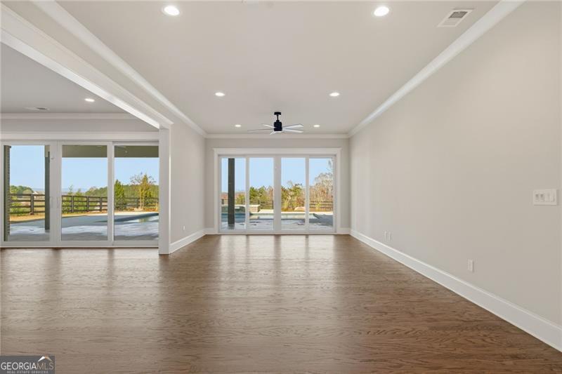 Welcome to Lot 4 on Price Road, featuring the highly sought-after Madison Plan with a fully finished basement and approximately 5,200 heated square feet of beautifully curated living space. The home sits on over 11 acres with shared used of a pond and spectacular mountain views! The home features 5 bedrooms, 5 full baths, and 2 half baths, this custom home blends architectural character with high-end finishes throughout. The exterior makes a striking first impression with brick to water table height on three sides, board and batten detailing above, Hardie shingle accents, cedar truss gables, and cedar columns framing a flagstone front porch. A screened rear covered porch with open gable design and Trex decking creates seamless outdoor living, complemented by a custom landscape package with irrigation and 4-rail fencing along Price Road. A rare four-car configuration includes a two-car side-entry and additional two-car front-entry garage. Inside, site-finished red oak floors span the main level, including the owner's suite. The family room showcases a coffered ceiling, custom built-ins, and a stunning 50" wood-burning fireplace with stone surround, opening through an expansive 16' sliding glass door to the outdoor living area. The chef's kitchen is designed for entertaining, anchored by a 48" ZLINE dual-fuel range, 60" built-in refrigerator, vented cabinet hood with makeup air, illuminated glass upper cabinetry, under-cabinet lighting, and thoughtful storage details. A fully appointed butler's pantry with wine cooler enhances both function and style. The owner's suite offers a spa-inspired bath with a 65" freestanding soaking tub, oversized tiled shower with bench, designer countertops, and upgraded black Moen fixtures. Tile extends to the ceiling in all showers, and elevated finishes continue throughout every bath. The finished terrace level is built for entertaining, complete with a full bar featuring leathered stone countertops, beverage cooler, ice maker, dishwasher, microwave, brick backsplash, and a sleek linear fireplace. Large-format sliding glass doors and double doors provide abundant natural light and easy outdoor access. Additional highlights include 8' solid-core doors, extensive trim details, Ecobee smart thermostats, 400-amp service with additional panel, tankless water heater, and a wood-burning fireplace on the covered back porch. An exceptional blend of craftsmanship, design, and modern comfort.