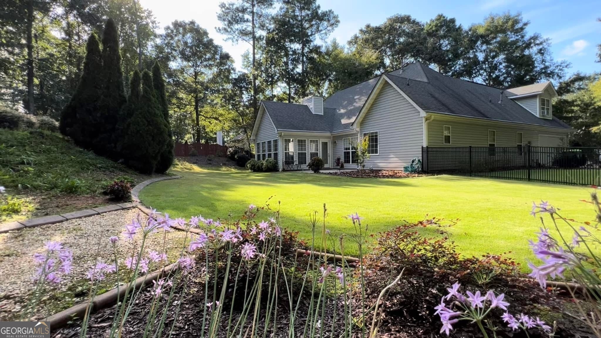 New Year... New Address waiting for you! Spacious, move-in ready ranch home located in the desirable Westminster Village community, set on a beautifully landscaped, nearly one-acre wooded lot that offers privacy and peaceful outdoor living. Enjoy front and back patios overlooking a professionally designed terraced garden-perfect for relaxing or entertaining. Inside, the open-concept floor plan features a vaulted living room anchored by a stunning stacked-stone fireplace, flowing seamlessly into the dining area, breakfast nook, and vaulted sunroom with tranquil garden views. The kitchen is well-appointed with granite countertops, custom wood cabinetry, stainless steel appliances, and a walk-in pantry. The oversized primary suite offers vaulted ceilings and dual walk-in closets. The spa-inspired ensuite bath includes double vanities, a deep soaking tub, and a separate shower. Two additional main-level bedrooms also feature vaulted ceilings and large picture windows that bring in natural light and scenic views. Upstairs, a spacious bonus room provides flexibility for a home office, media room, or fourth bedroom. Recent upgrades provide peace of mind, including a new roof (May 2025), new furnace (October 2024), septic serviced (November 2025), and removal of ten high-risk trees (April 2025). Westminster Village residents enjoy excellent HOA amenities, including a clubhouse, tennis and pickleball courts, a recently renovated swimming pool, and playground. Conveniently located near top-rated Northgate High School, Canongate Elementary, and Blake Bass Middle School. Just minutes to Costco and Sam's Club, approximately 12 minutes to The Avenue and the new Trader Joe's, and about 25 minutes to Hartsfield-Jackson Atlanta International Airport. Schedule your showing today!