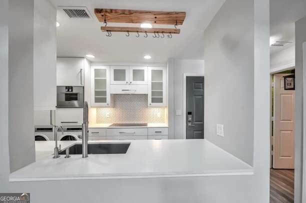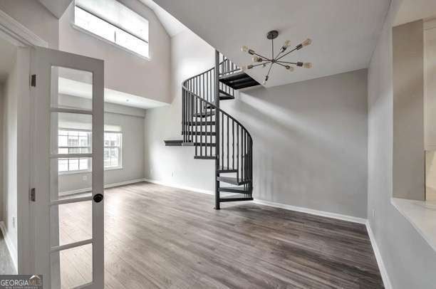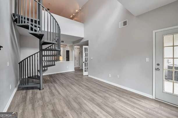 This stunning 2BR/2BA top-floor condo in Peachtree Walk was completely renovated in 2023 and is a huge value opportunity for anyone looking for a stylish, functional and move-in ready condo with low HOA dues! The open kitchen overlooks the 2-story great room flooded with natural light and includes Gaggenau stainless steel appliances and thoughtfully designed built-ins for maximum storage. This freshly painted condo features a farm sink, white cabinetry, and luxury vinyl plank flooring throughout and an oversized ceiling fan upstairs. A dramatic spiral staircase leads to a spacious loft and the second full bath - perfect as a guest room, home office or creative studio. Step out onto your covered balcony from the main-level primary suite for a view of the pool. This residence also includes a separate storage space, assigned and gated parking with plenty of guest parking, and access to a host of amenities: pool, gym, dog park, bike locker, EV charging-all with low HOA fees. Stylish, functional, and move-in ready!
