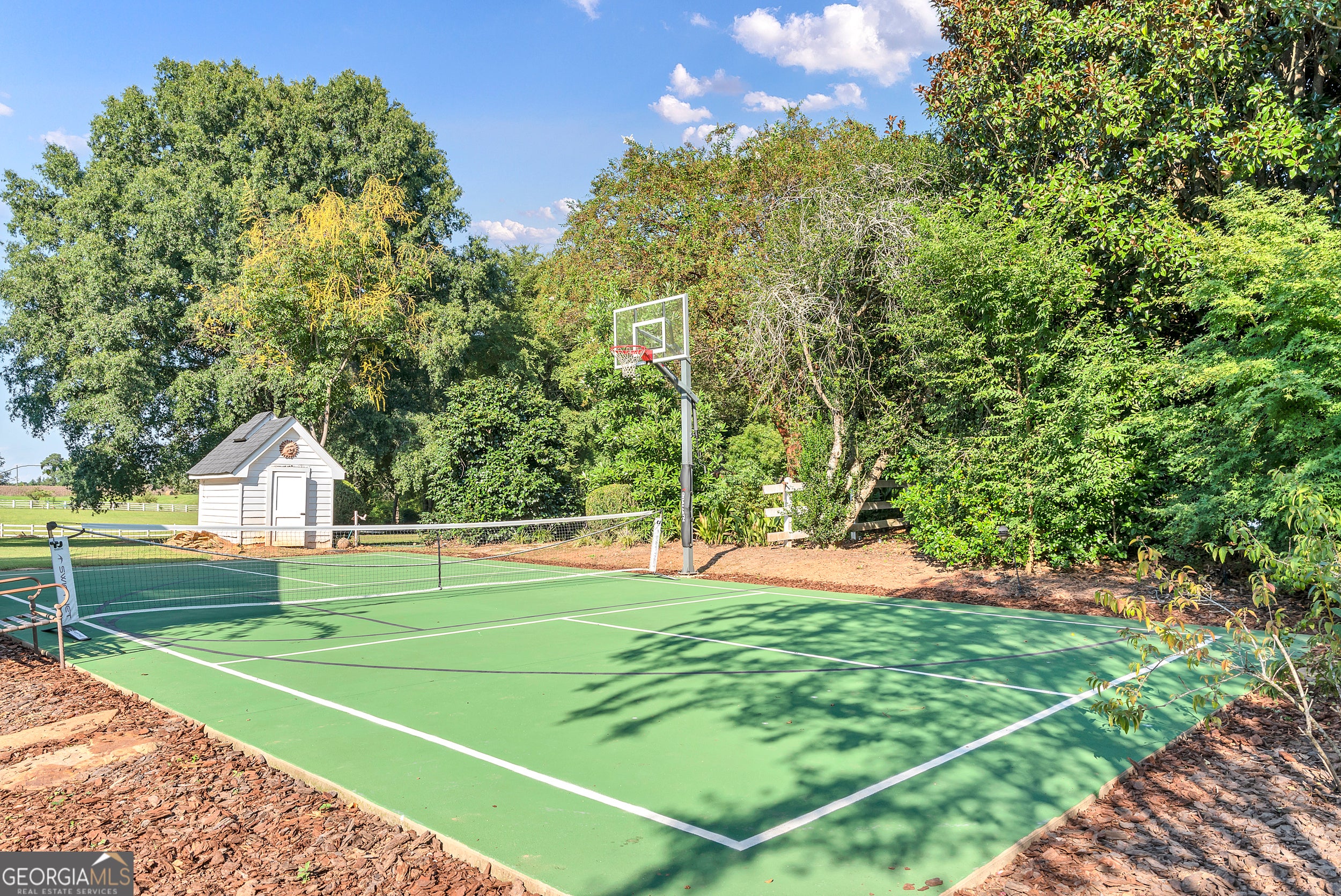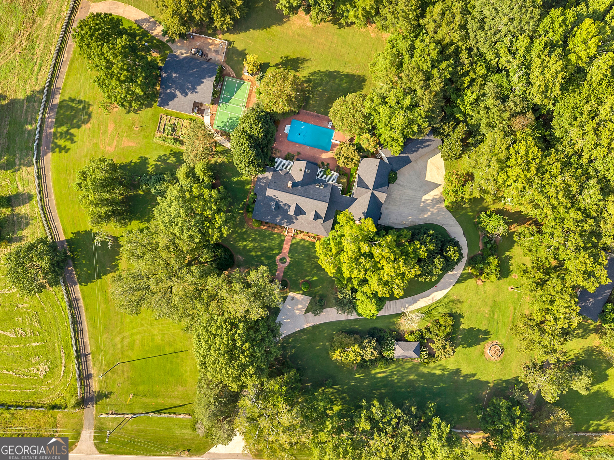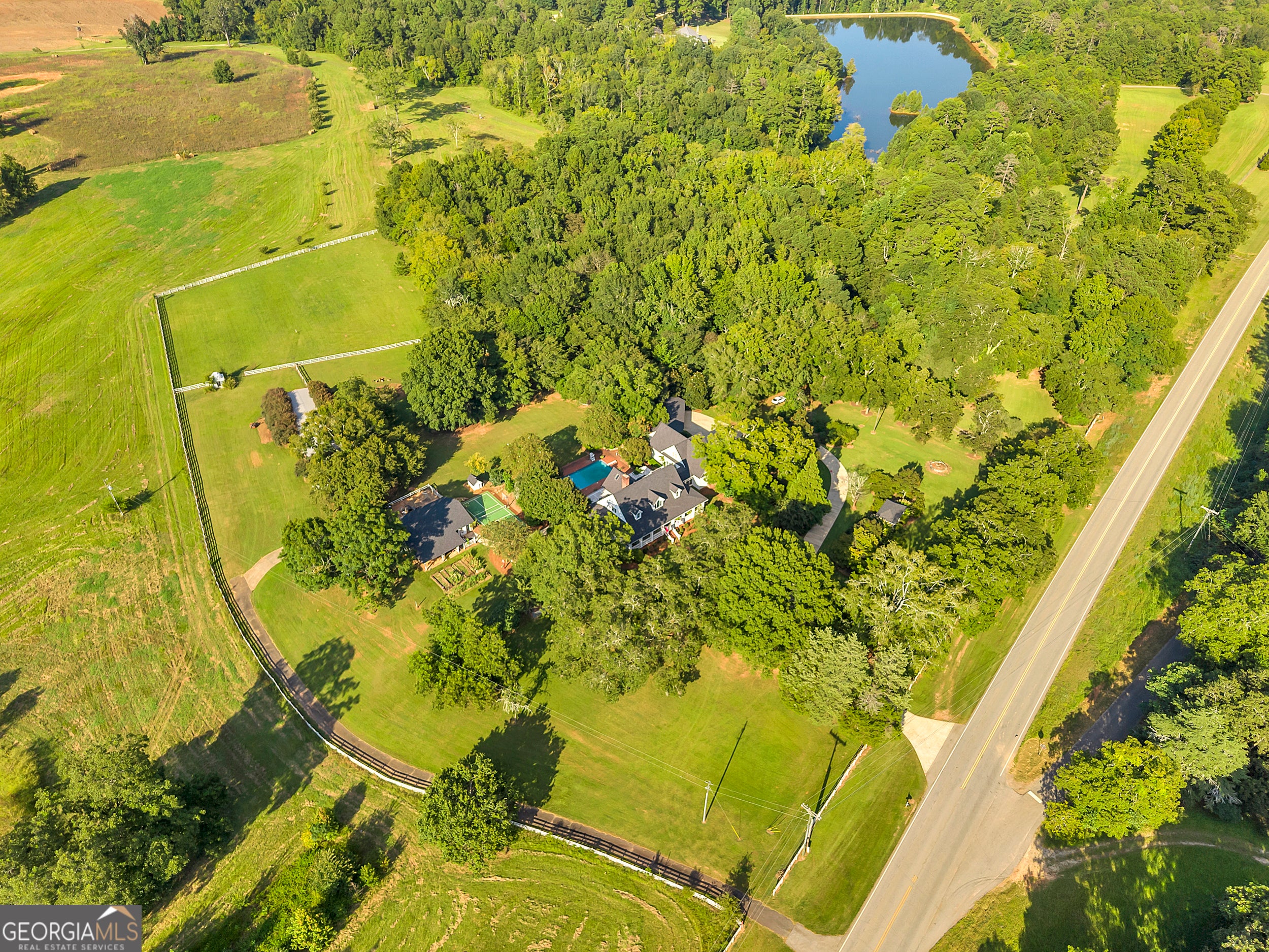 Discover your private farm oasis on over 13 acres of land, perfect for playing & living. This charming but expansive farmhouse is surrounded by gardens, patios, and space to roam, all enclosed by a classic white picket fence. Enjoy the sprawling front porch and multiple outdoor amenities, including a pickleball court, pool, outdoor kitchen & fireplace, and entertaining patio. Additional features include a large workshop, chicken coop & a massive equipment shed that can hold tall RV's & Boats. A True haven for both leisure and modern farm living! This custom-built home boasts slab hardwood floors, expansive floor-to-ceiling windows, vaulted ceilings, and a gourmet kitchen equipped with a Wolfe six-burner range and Sub-Zero refrigerator. The main level features a primary en-suite and a dedicated office space, while upstairs offers two sizable bedrooms. All rooms overlook the picturesque landscape. For gatherings, enjoy a spacious great room with a soaring brick masonry fireplace and wet bar-perfect for game days. A guest bedroom/bonus room upstairs provides additional space. Enjoy a spacious four-car attached garage. An additional 2BR|1Ba cottage onsite conveys with sale. Currently rented. This oasis is Located just 10 minutes from Lake Oconee amenities. This incredible property combines luxury, privacy, and recreation in one perfect package.
