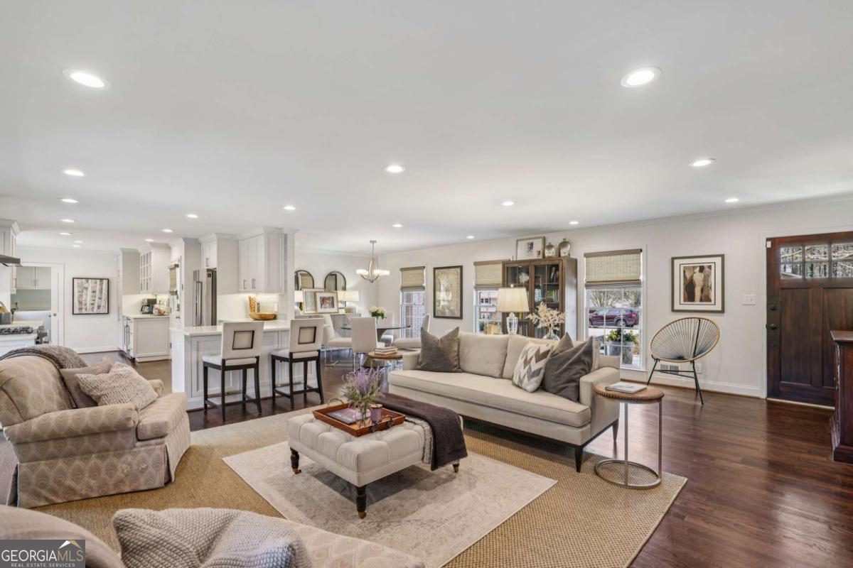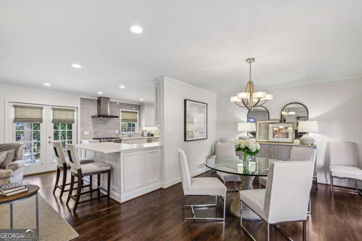 Top-of-the-Line renovation in this light, bright open home in sought-after Dunwoody! Living room, dining room, and kitchen flow seamlessly for easy, one-level living and entertaining. The kitchen features custom cabinets, quartz countertops, built-in wine refrigerator, glass-front display cabinets, and a cozy window bench with storage. The primary suite has neutral finishes, quartz counters, herringbone tile, and a frameless glass shower. The basement has great storage, workshop space, and a door to the yard. The home is on a large corner lot that features a flagstone patio, mature trees and landscaped grounds. Extensive renovations include new HVAC, new water heater, hardwood floors, crown molding, and recessed lighting.