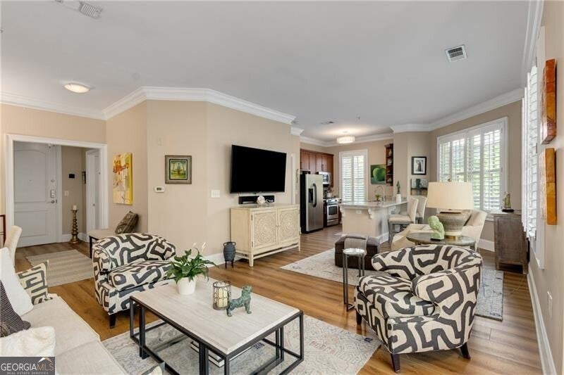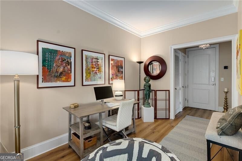 Encounter an elevated Midtown living at Piedmont Crest, directly beside Piedmont Park, Atlanta's iconic green space. This top-floor, southwest-corner residence is the largest one-bedroom in the building, offering 922 square feet of flexible space, abundant natural light, and two private balconies that capture views of the city skyline, treetops, and sunsets. Freshly updated, the home features new luxury vinyl wood-tone flooring, new kitchen countertops, and a brand-new glass-enclosed stall shower. The open-concept design allows for multiple furniture arrangements and includes space for a dedicated office nook, ideal for remote work or creative pursuits. The bedroom suite feels private and airy, complemented by generous closet space and access to one of the balconies. Every detail has been refreshed to create a move-in-ready home that balances function and style. Enjoy covered, assigned, gated parking, a fitness center, clubroom, and guest suite. The building is recognized for its signature fountain along Piedmont Avenue and its unmatched proximity to Piedmont Park, Colony Square, and Atlanta's top dining and entertainment destinations. Convenient access to Midtown MARTA provides an easy connection to Hartsfield-Jackson International Airport, making this an ideal home for professionals, first-time buyers, or those seeking a refined pied- -terre in one of Atlanta's most walkable and vibrant neighborhoods.