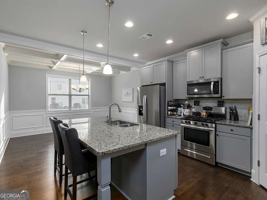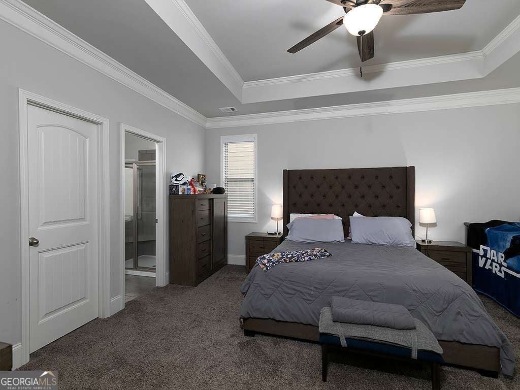An exceptional opportunity to own an elegant ranch-style residence nestled within a highly coveted, resort-inspired community. Thoughtfully designed, this home offers three spacious bedrooms, including an expansive owner's suite that serves as a private sanctuary. The spa-like owner's bath features dual vanities, a luxurious soaking tub in a private room, a large tiled walk-in shower, and an impressive walk-in closet. The open-concept living space is ideal for sophisticated entertaining, anchored by a chef-inspired kitchen with an oversized island offering seating for four to six guests. A formal dining area enhanced by striking coffered ceilings provides the perfect setting for memorable gatherings. The sunroom adds exceptional versatility, ideal for a private office, lounge, or serene retreat tailored to your lifestyle. This meticulously maintained home offers peace of mind, with the roof and all major home systems - Furnace, Water Heater, HVAC less than eight years old along with a built-in interior pest control management system professionally serviced by Peachtree Pest Control Company. Ideally located with easy access to major city roads, premier shopping centers, and a nearby outlet mall, the home is also conveniently situated less than two miles from Interstate 75-offering effortless connectivity while preserving a serene, resort-style setting. Enjoy an elevated living experience with access to exceptional community amenities, including a resort-style pool, tennis courts, basketball and volleyball courts, scenic walking trails, tranquil pond and lake views, playgrounds, and dedicated dog areas. Combining elegance, comfort, convenience, and lifestyle, this distinguished property presents a rare opportunity. Schedule your private showing today-this exceptional home will not last long.