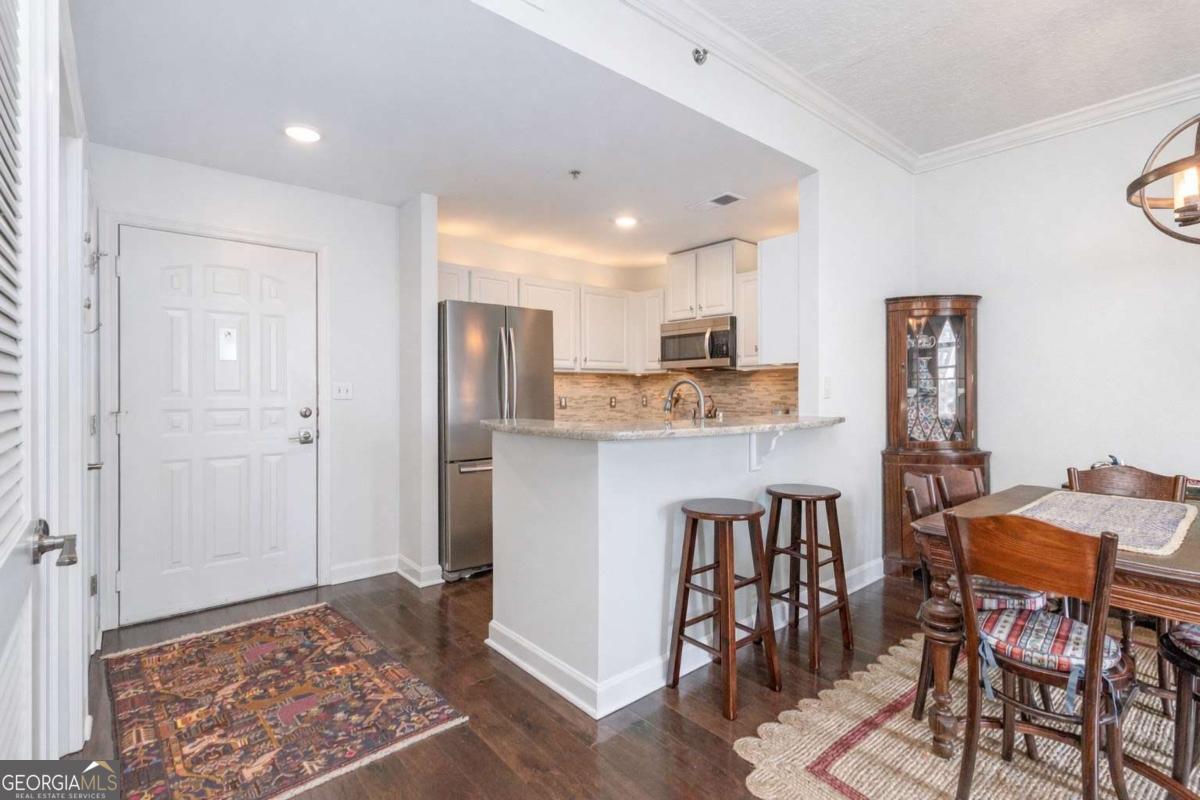Midtown living at an exceptional value, complete with captivating sunrise and evening skyline views. This thoughtfully designed one bedroom, one full bathroom home offers a spacious private balcony and expansive windows that highlight the vibrant energy of the city below. Inside, abundant natural light enhances the open layout, refined flooring, and modern finishes throughout. The kitchen features a functional breakfast bar, white cabinetry, and stainless appliances. The bathroom serves as a serene retreat with double shower, a sleek vanity and generous storage. In-unit full-size laundry and a reserved parking space in building add to the home's everyday convenience. Residents enjoy a full suite of luxury amenities, including covered visitor parking, 24/7 concierge, resort-style pool, heated lap pool, grilling areas, fitness center, rooftop Terrace with outstanding 360 views, clubroom, guest suite, and a private dog walk. Ideally located with immediate access to Piedmont Park, the Atlanta Beltline, MARTA, Colony Square, Trader Joe's, museums, theaters, boutique shopping, and top dining destinations. Perfect as a primary residence or city retreat, this Park Central Midtown condo features tree-lined Piedmont Park views just outside your window. The exterior of building including balcony is being refreshed for 2026 with no special assessment. Note: The first photos of kitchen, family room and bedroom feature color-altered renderings as Seller is open to paint color consideration for a more neutral palette, if desired.