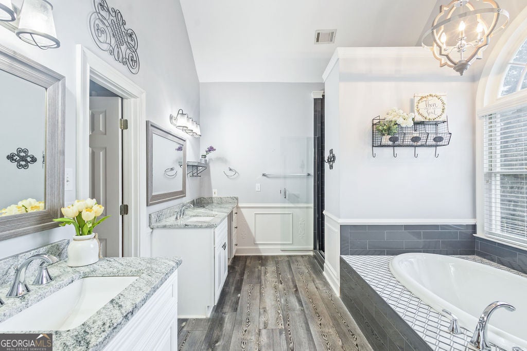 - Interior FeaturesDouble Vanity, Master On Main Level, Pulldown Attic Stairs, Roommate Plan, Separate Shower, Soaking Tub, Split Bedroom Plan, Tile Bath, Walk-In Closet(s)