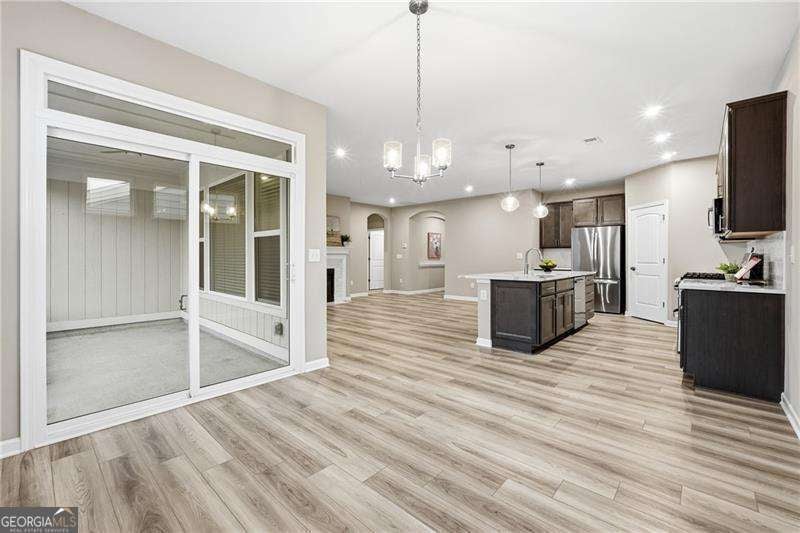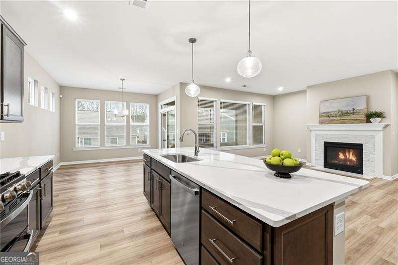 This beautifully maintained home in the gated Poplar Place 55+ community offers the perfect blend of modern comfort and easy living. You'll love the open, thoughtfully designed floor plan. A welcoming foyer leads into a bright, spacious great room that flows seamlessly into the kitchen and dining area. Light LVP flooring runs throughout the main living areas, with carpeted bedrooms and tiled baths. The gas log fireplace features a stunning tile surround, creating a warm focal point in the great room. The chef's kitchen features quartz countertops, a huge island, stained cabinetry, stainless steel appliances (including refrigerator), a gas cooktop, microwave, walk-in pantry, and a sunny breakfast area. Enjoy your morning coffee or evening relaxation on the screened porch. The primary suite offers a private retreat with a spacious tiled shower, dual vanities, safety bars, and a walk-in closet. Two additional bedrooms with generous closets share a well-appointed hall bath. Storage is abundant throughout the home, with multiple large closets, linen storage, and a roomy laundry room. Additional highlights include a two-car garage and a convenient location just minutes to Dallas Hwy/120, Hwy 92, Walmart, and Costco. The community features a clubhouse, pickleball court, and a full calendar of activities designed for active, low-maintenance living.