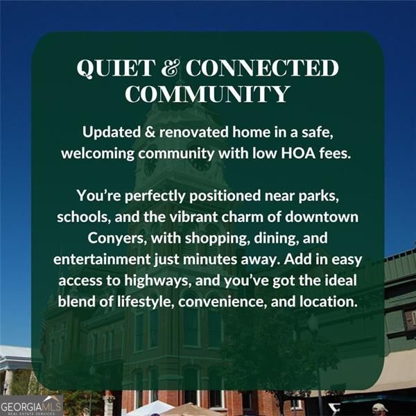 || BRAND NEW ROOF || || ALL NEW APPLIANCES || || NEW CARPET THROUGHOUT || || NEWLY PAINTED INSIDE & OUT || || MASTER ON MAIN || || GRANITE COUNTERS || || LEVEL LOT || || FULL SPRINKLER SYSTEM || || 5 MINUTES FROM DOWNTOWN CONYERS || ** What You'll See ** Fresh interior and exterior paint, brand-new carpet, and an updated look greet you the moment you arrive. The kitchen draws the eye with GRANITE COUNTERS and NEW APPLIANCES. Vaulted ceilings create an open, airy feel. The master on main adds visual simplicity and everyday ease, all set within a neighborhood just MINUTES FROM DOWNTOWN CONYERS. ** What You'll Hear ** Life here feels calm and unforced. Mornings are quiet, evenings are relaxed, and the neighborhood maintains a comfortable, well-kept atmosphere. When you want more energy, the sounds of downtown dining, shopping, and community events are only a short drive away. ** What You'll Feel ** Comfort and confidence come naturally in an updated home with a BRAND NEW ROOF already in place. Soft carpet underfoot, solid granite surfaces, and the convenience of a level driveway make daily routines smoother and more enjoyable. ** What You'll Experience ** This home offers flexibility and opportunity, whether you're settling in long-term or considering future investment options. With quick access to downtown Conyers, you'll experience an easy lifestyle that blends convenience, freedom, and a true sense of home. HOA dues are paid monthly at $226.