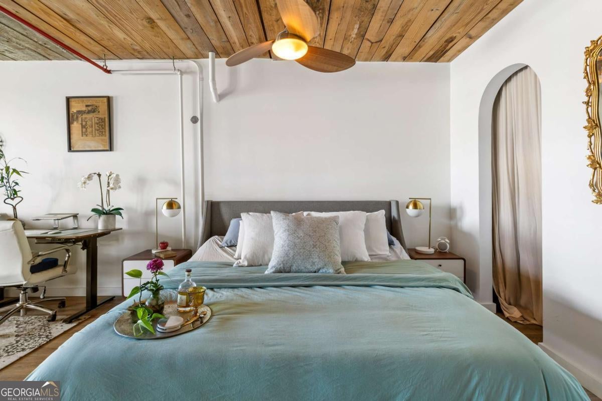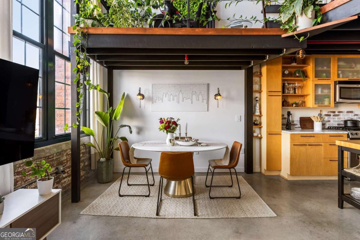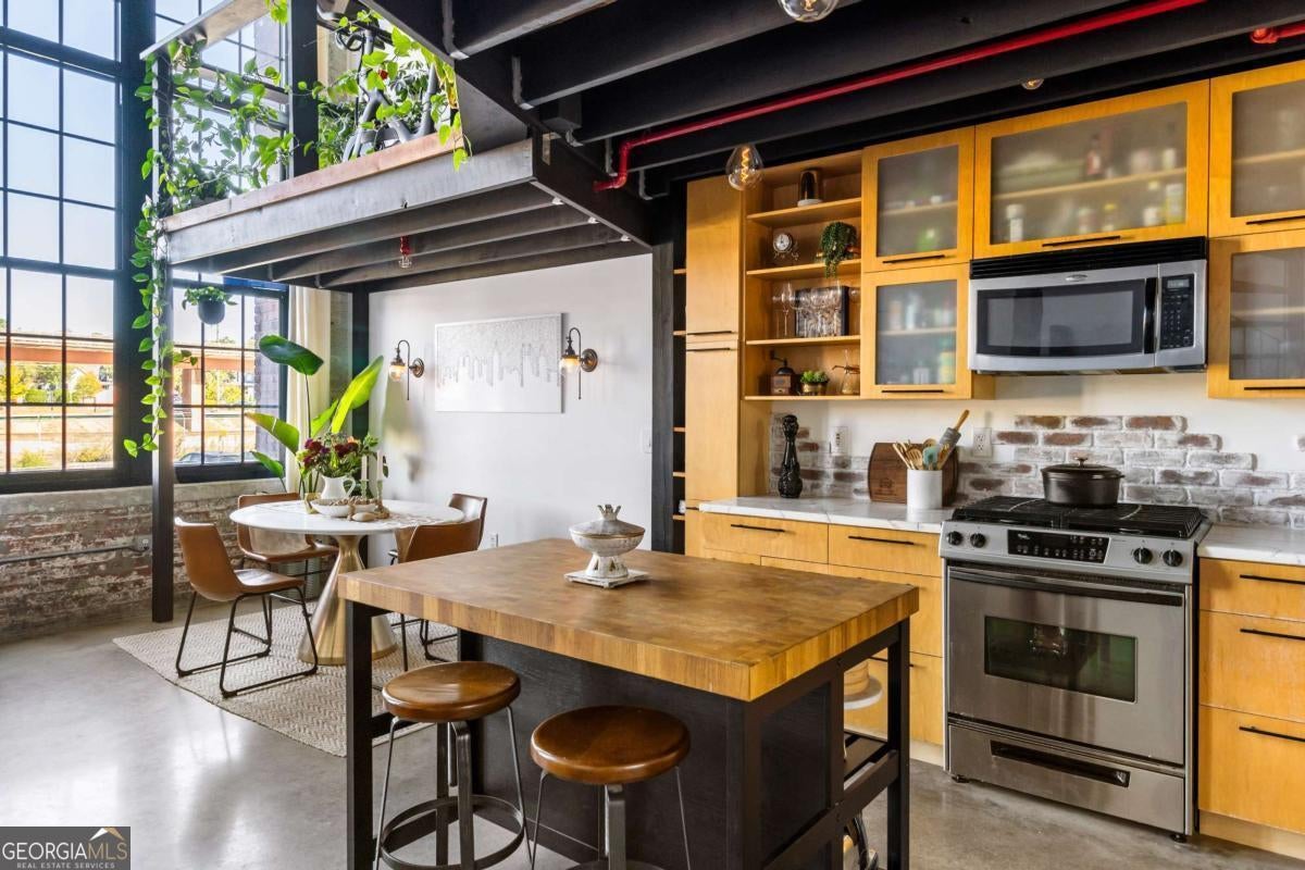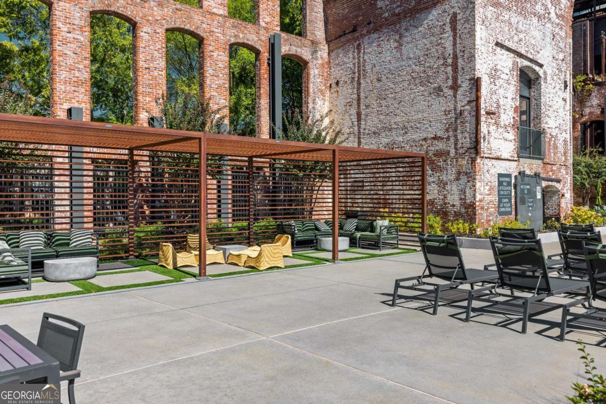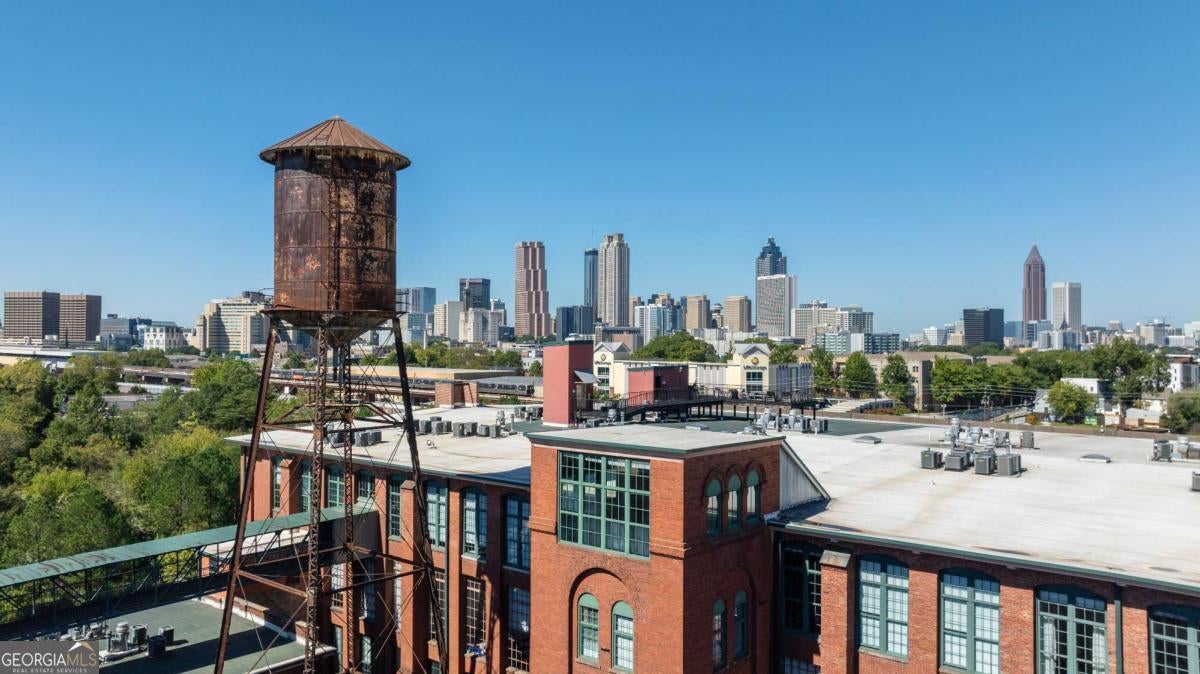 Welcome to this stunning 2-bedroom, 2-bath loft in the heart of The Stacks, one of Atlanta's most iconic converted mill communities. Located in sought-after Building E, this extensively renovated home blends industrial character with modern luxury, featuring 17-foot ceilings, oversized 14-foot windows with remote-controlled blackout shades, and exposed beams throughout. The newly renovated second-floor primary suite offers premium luxury vinyl flooring, expanded square footage, a custom closet system, and a spa-like bathroom with a Greek marble walk-in shower with three showerheads, a floating double vanity with a scalloped marble backsplash, walnut cabinetry, a bidet toilet, and vintage Egyptian double doors. The main level includes a custom brick kitchen backsplash with concrete countertops, an antique vanity in the guest bath, built-in shelving in the guest room, designer lighting, and a 2024 water heater. Additional highlights include a lower HOA than many larger units in the community, two reserved parking spaces (one covered and one uncovered near the Building E entrance), and access to renovated amenities, including a resort-style pool, BBQ and fire pit lounges, dog parks, a fitness center with new equipment, and a rooftop with views of Atlanta's skylines.