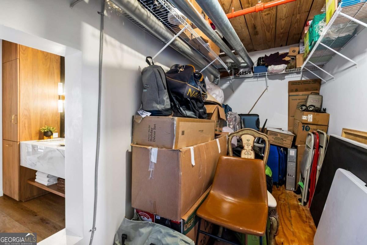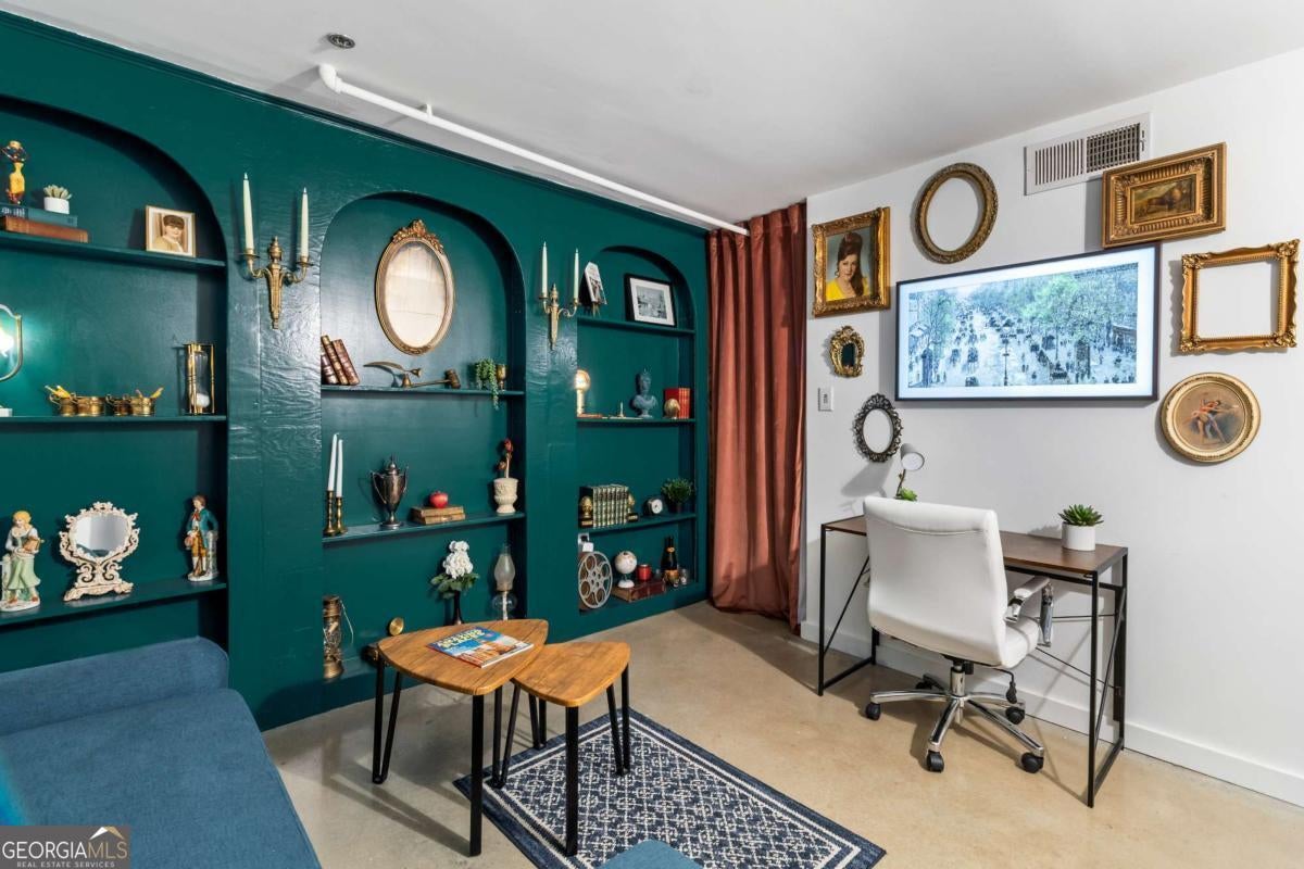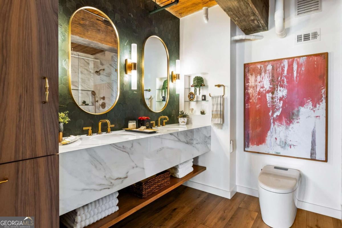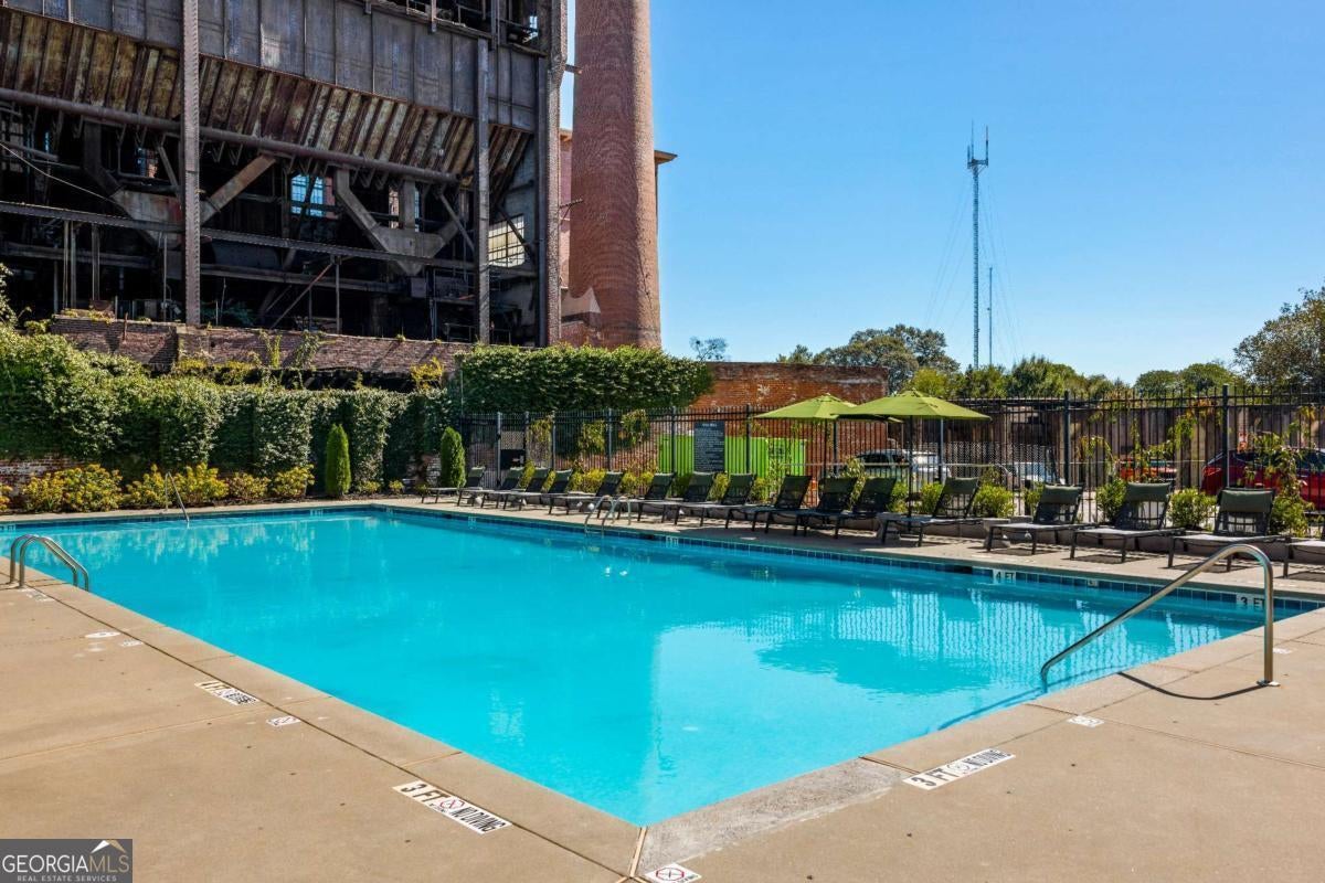 Welcome to this stunning 2-bedroom, 2-bath loft in the heart of The Stacks, one of Atlanta's most iconic converted mill communities. Located in sought-after Building E, this extensively renovated home blends industrial character with modern luxury, featuring 17-foot ceilings, oversized 14-foot windows with remote-controlled blackout shades, and exposed beams throughout. The newly renovated second-floor primary suite offers premium luxury vinyl flooring, expanded square footage, a custom closet system, and a spa-like bathroom with a Greek marble walk-in shower with three showerheads, a floating double vanity with a scalloped marble backsplash, walnut cabinetry, a bidet toilet, and vintage Egyptian double doors. The main level includes a custom brick kitchen backsplash with concrete countertops, an antique vanity in the guest bath, built-in shelving in the guest room, designer lighting, and a 2024 water heater. Additional highlights include a lower HOA than many larger units in the community, two reserved parking spaces (one covered and one uncovered near the Building E entrance), and access to renovated amenities, including a resort-style pool, BBQ and fire pit lounges, dog parks, a fitness center with new equipment, and a rooftop with views of Atlanta's skylines.