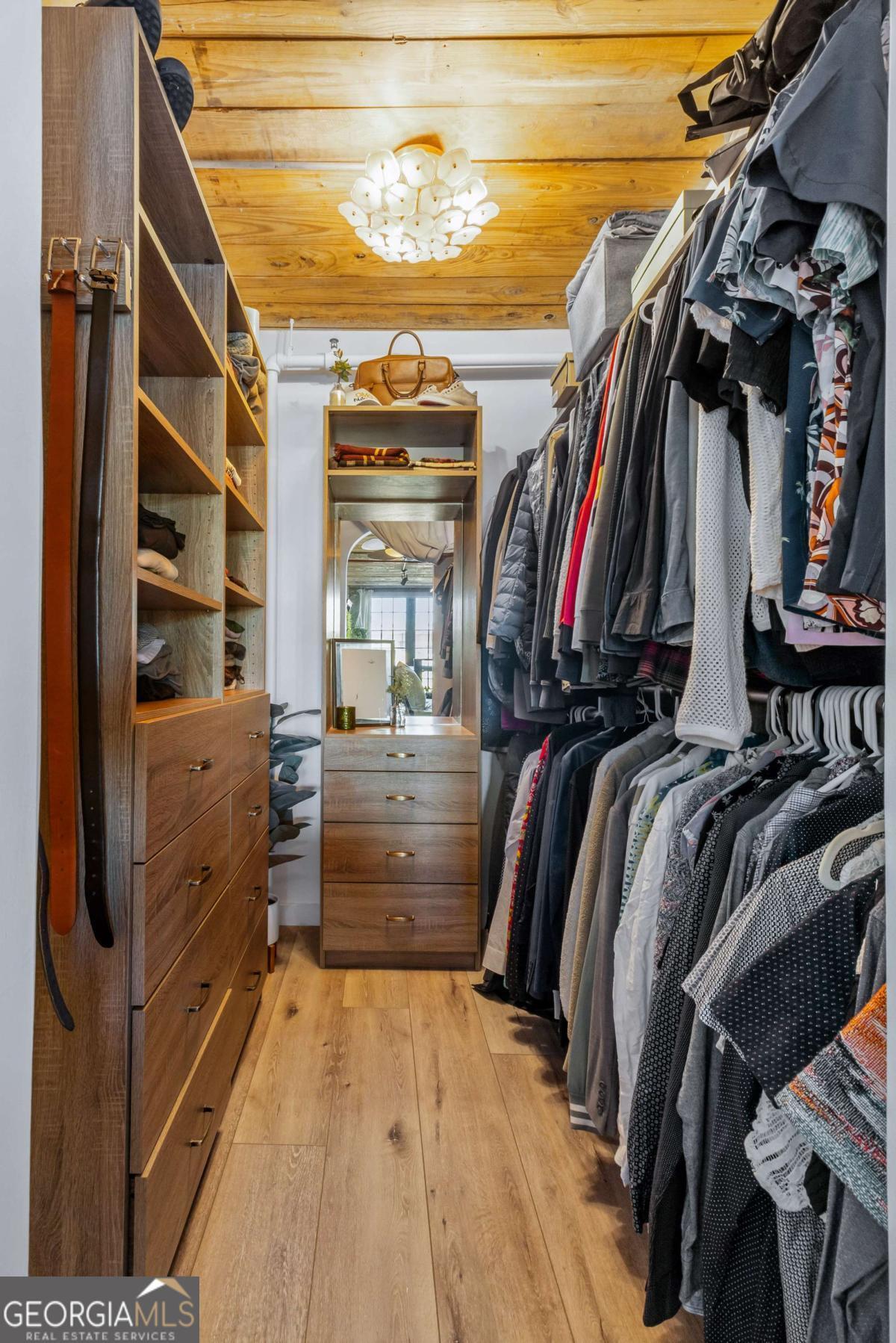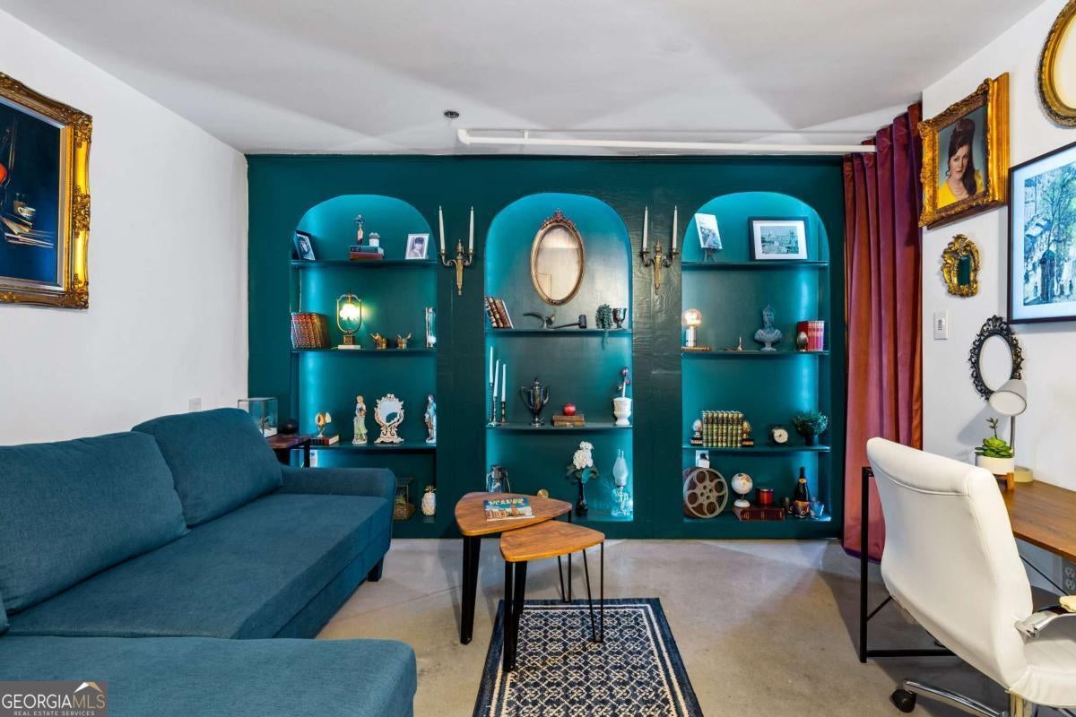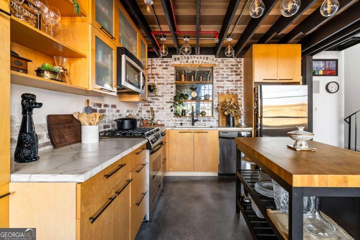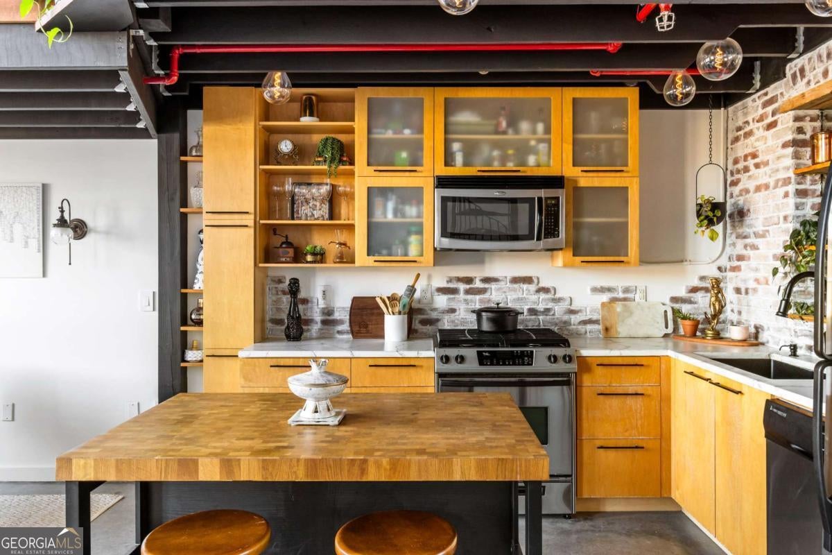 Welcome to this stunning 2-bedroom, 2-bath loft in the heart of The Stacks, one of Atlanta's most iconic converted mill communities. Located in sought-after Building E, this extensively renovated home blends industrial character with modern luxury, featuring 17-foot ceilings, oversized 14-foot windows with remote-controlled blackout shades, and exposed beams throughout. The newly renovated second-floor primary suite offers premium luxury vinyl flooring, expanded square footage, a custom closet system, and a spa-like bathroom with a Greek marble walk-in shower with three showerheads, a floating double vanity with a scalloped marble backsplash, walnut cabinetry, a bidet toilet, and vintage Egyptian double doors. The main level includes a custom brick kitchen backsplash with concrete countertops, an antique vanity in the guest bath, built-in shelving in the guest room, designer lighting, and a 2024 water heater. Additional highlights include a lower HOA than many larger units in the community, two reserved parking spaces (one covered and one uncovered near the Building E entrance), and access to renovated amenities, including a resort-style pool, BBQ and fire pit lounges, dog parks, a fitness center with new equipment, and a rooftop with views of Atlanta's skylines.