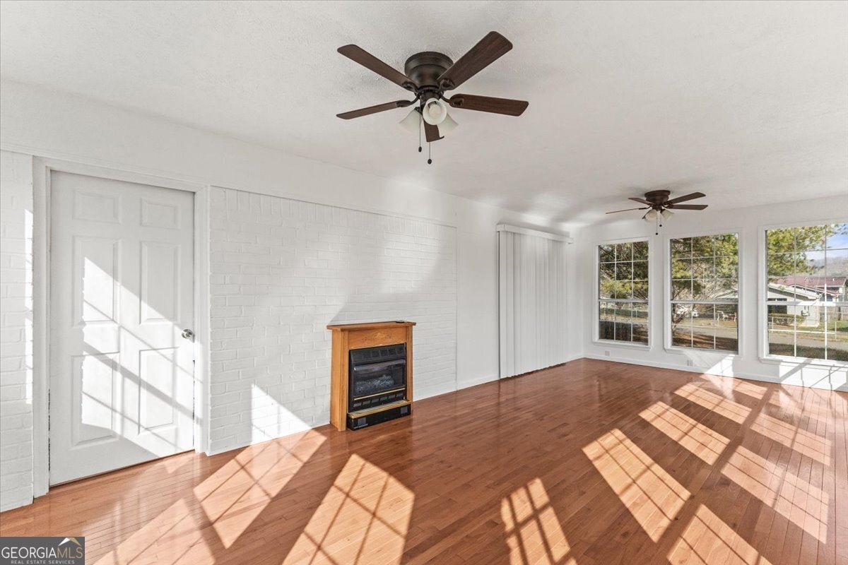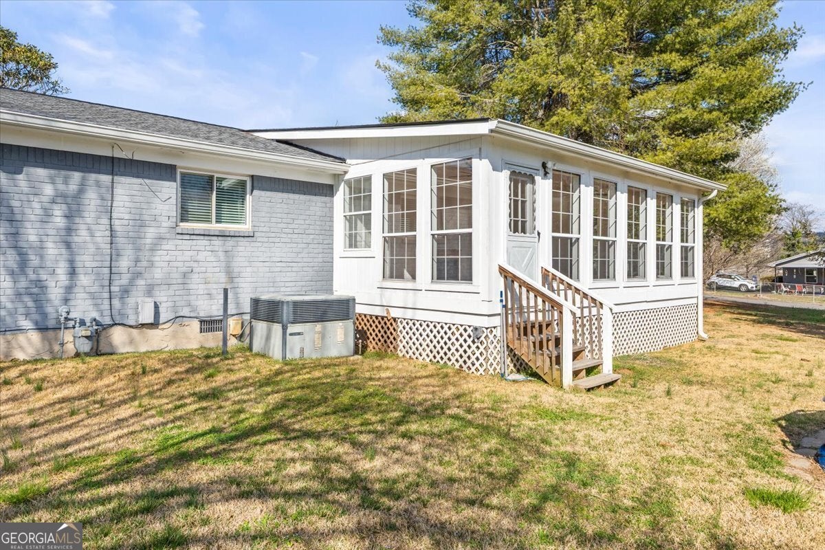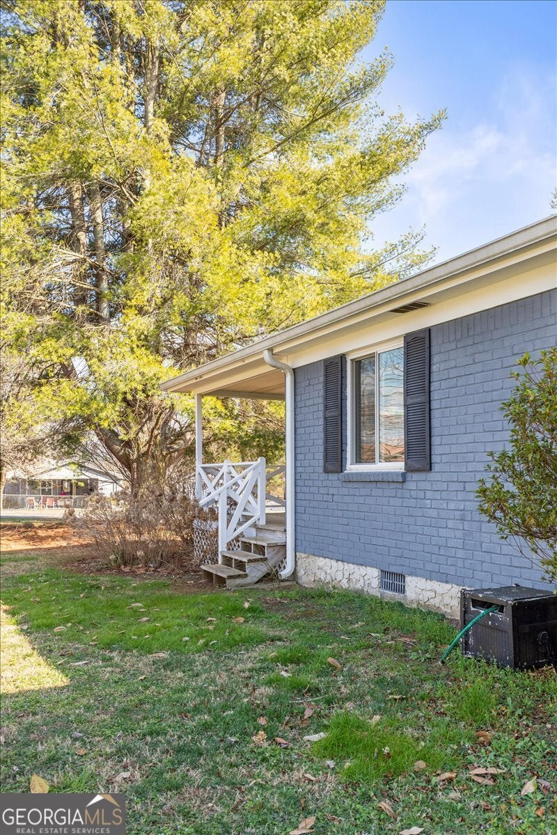 This beautiful, move-in ready, single-level home sits on a third of an acre in a well-established neighborhood, featuring a large corner lot with mature dogwoods and towering evergreens. The exterior showcases freshly painted brick, updated double-pane vinyl windows, and a brand-new roof installed in 2023. Covered porches on both the east and west sides of the home include sliding glass doors, with the east porch offering two ceiling fans-ideal for summer entertaining, even during a light rain. Inside, the home is equally impressive. The inviting living room features a natural gas fireplace with new logs installed in 2023, beautiful hardwood floors throughout, and two spacious closets. Just off the living room is a large bonus room on the west side of the home, providing flexible living space. The recently remodeled kitchen is designed for both everyday cooking and entertaining, with stainless steel appliances (including dishwasher and microwave), granite countertops, crisp white cabinetry with ample storage, and a deep double sink with a retractable sprayer. The adjacent dining room features a modern chandelier and a generous storage closet. A central hallway connects the home's two bedrooms and the remodeled bathroom. The bathroom blends retro charm with modern luxury, offering black-and-white vintage-style tile flooring, white wainscoting with chair rail, a walk-in shower with multiple showerheads, and a marble-topped vanity with abundant storage, plus an additional linen cabinet. Crown molding runs throughout the home, including both cozy bedrooms, each with a functional closet. Beyond the main bedroom is the true jewel of the home-a sunroom adding approximately 300 square feet of living space. Filled with natural light from morning to evening, this room features a natural gas fireplace and a sliding glass door leading to the east covered porch, making it an ideal space for relaxing or hosting gatherings year-round.