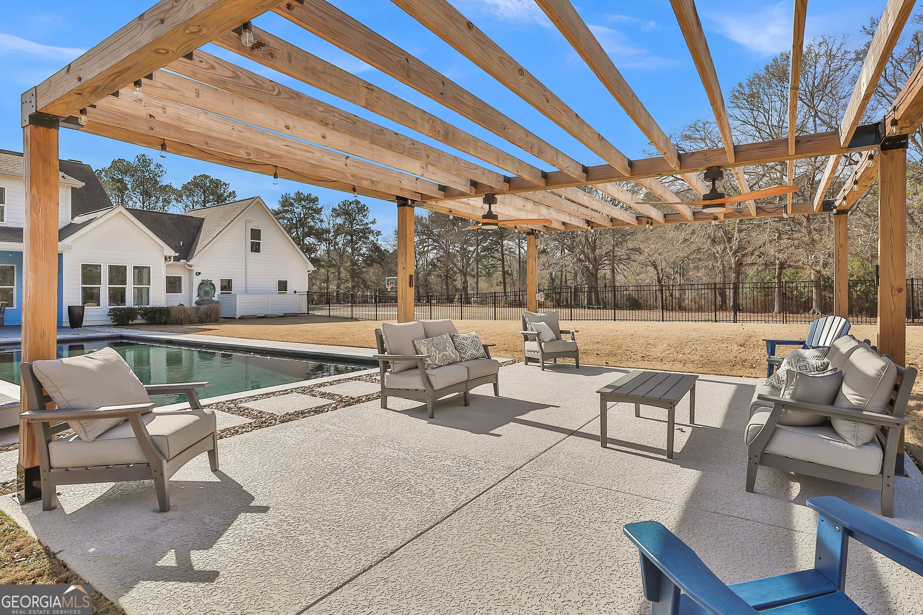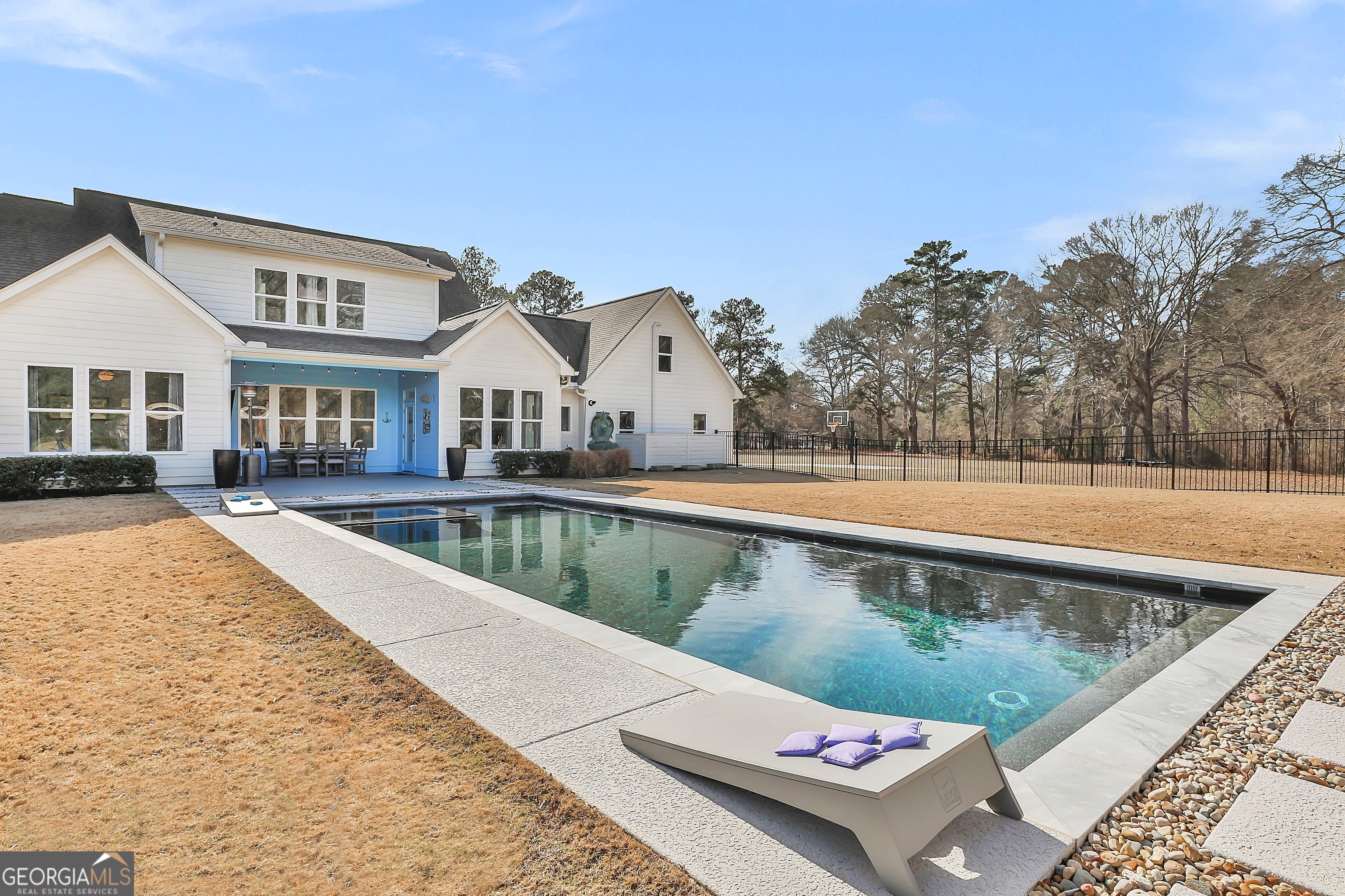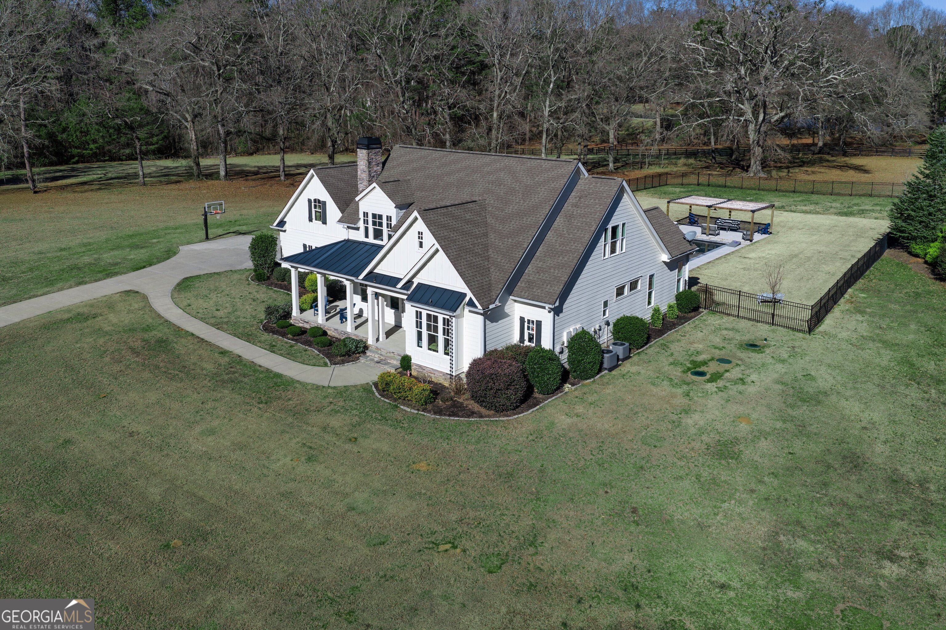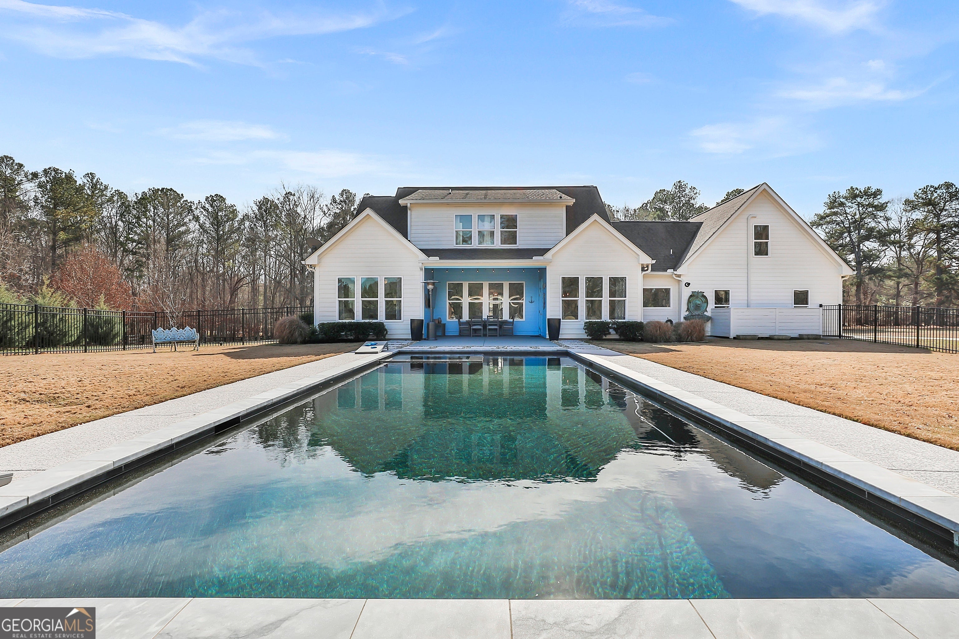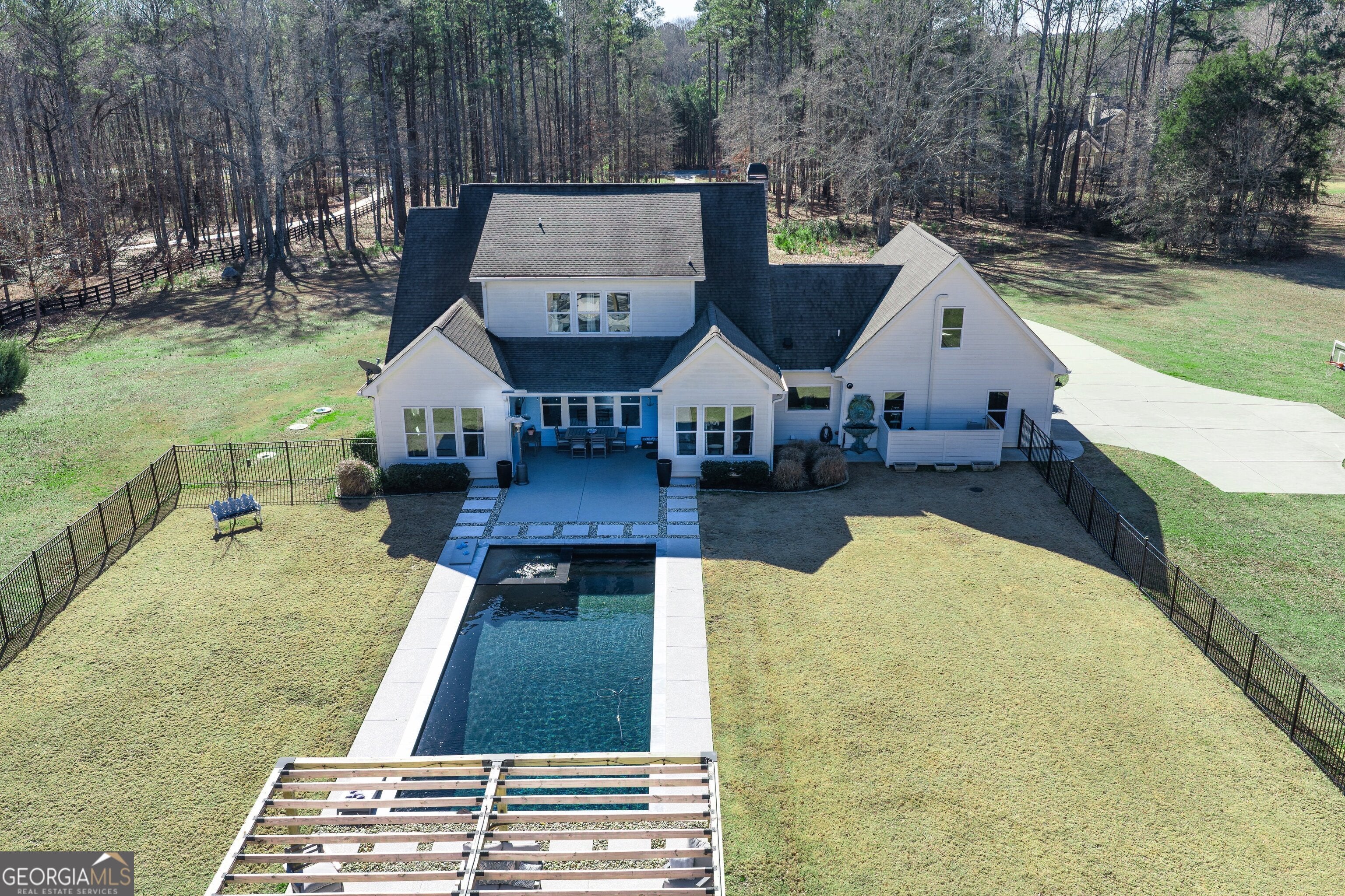 Incredible Mitch Ginn-designed custom estate welcomes you with a picturesque, tree-lined drive and a charming wraparound porch that immediately sets the stage for timeless Southern elegance. Arched double French doors open to a grand foyer, offering a stunning first impression and hinting at the refined craftsmanship found throughout the home. Experience elevated Southern living at 135 Woodbridge Place, a remarkable farmhouse-style estate privately situated on 5 serene acres in the heart of Brooks. Thoughtfully designed to blend classic architectural charm with modern luxury, this property delivers an exceptional balance of sophistication, comfort, and resort-style living. The main level features soaring ceilings, abundant natural light, and an effortless flow between formal and casual spaces-ideal for both everyday living and entertaining. At the heart of the home, the chef's kitchen impresses with stainless steel appliances, dual ovens, custom cabinetry, and stone countertops, seamlessly opening to a fireside family room and sunlit breakfast area. The owner's suite on the main level is a true private retreat, complete with a spa-inspired bath and an expansive custom walk-in closet. A guest suite with a full bath, along with a flexible study or office, completes the first floor with comfort and versatility in mind. Upstairs, three generously sized bedrooms, including two en-suite bedrooms, are complemented by a spacious media or bonus room-perfect for movie nights, game days, or relaxed gatherings. Step outside to your own private outdoor sanctuary. A covered porch overlooks the stunning gunite saltwater pool and hot tub, surrounded by an expansive patio designed for entertaining or quiet moments of relaxation. The fenced backyard features an irrigation system, while a large parking pad provides ample space for guests. Additional highlights include custom millwork, refined architectural detailing, and a two-car garage. With five peaceful, tree-lined acres, the property offers endless possibilities-gardens, recreation, or simply enjoying the rare privacy of your own retreat. Located within the highly sought-after Whitewater School District, just minutes from Peachtree City and with convenient access to Atlanta, this exceptional estate presents a rare opportunity to enjoy luxury living in one of Brooks' most desirable settings. This is more than a home-it's a lifestyle. Southeast Mortgage is our preferred lender. If buyer chooses to work with them, Southeast Mortgage will provide 1% credit up to $5,000. Reach out to the listing agent for more information.
