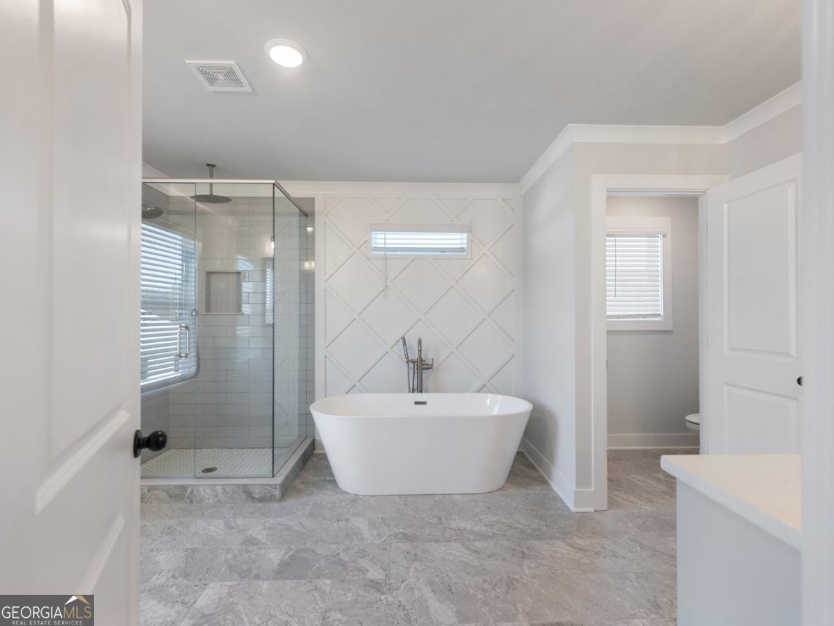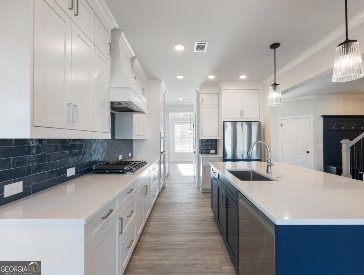 Built by SPI Homes - Homesite 50 The Orchard C is located in Phase 2 of Hosch Reserve. Estimated completion in April. This homesite plan lot offers 5BR 4BA and a three-car garage with a private, low maintenance backyard overlooking conservation area. Spacious open concept living room with decorative electric fireplace & floating bookshelves flowing into the breakfast sitting area and luxury kitchen with quartz counter tops, pendant lighting over the island, handmade vent hood, kitchen cabinets to the ceiling with soft-close drawers, stainless steel appliance package, gas cooktop with wall-mounted pasta faucet, wall oven and microwave! Elevated features throughout, including shiplap accents and crown molding. The fifth bedroom is on the main floor and is adjoined to a full bath. The second floor welcomes a large primary bedroom with a lavish bath showcasing a soaking tub, quartz countertops, and a generous walk-in closet. In addition, the upstairs features three bedrooms, a jack and jill bath, a junior suite, and a loft area! Laundry facilities are upstairs. Refrigerator and blinds are included! Hosch Reserve is a swim, cabana, and pickleball HOA community for active recreation. Conveniently located in Gwinnett County's sought-after Seckinger High School district, Hosch Reserve offers tranquility just off Old Thompson Mill Road. $10,000 buyer incentive with preferred lender. GPS Address: 3105 Old Thompson Mill Rd (use Apple Maps or Waze).