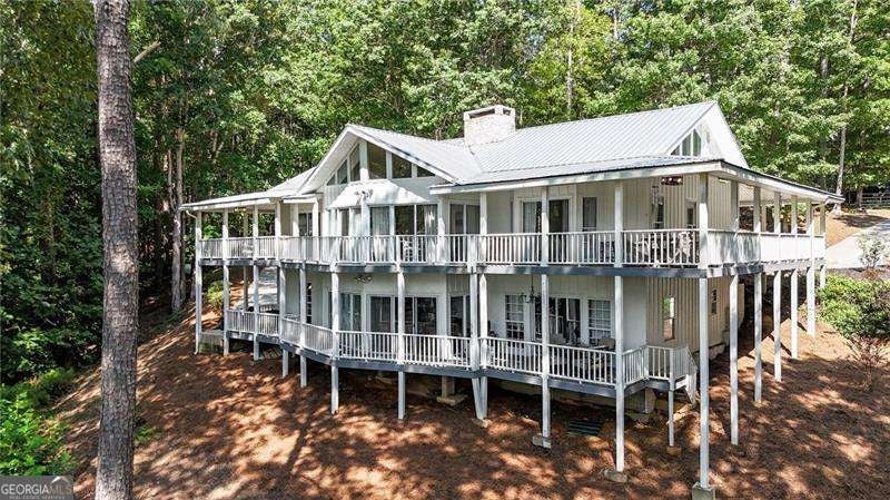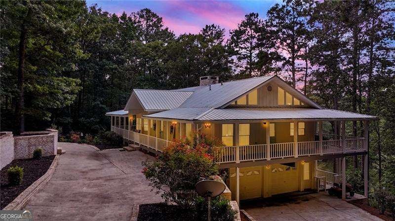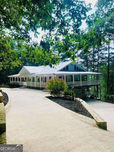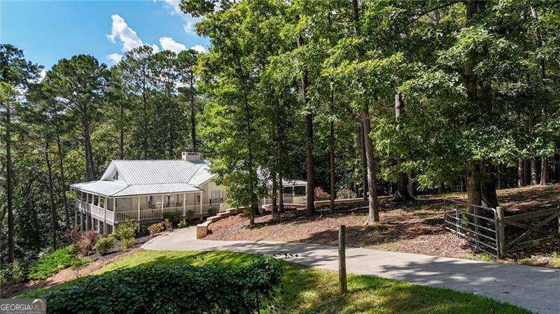 Escape to your own private oasis on 5 acres, complete with stunning water views and tranquility. NO HOA & Zoned AG. Property includes a cleared lot ready for a barn, shop, pasture, or your custom build. This exquisitely renovated home is designed for seamless indoor-outdoor living, featuring double wrap-around rocking chair porches perfect for enjoying your serene surroundings. Inside, a grand open foyer welcomes you with gleaming hardwoods and soaring cathedral ceilings. An impressive double-sided gas fireplace connects the main living spaces, creating a warm and inviting atmosphere. The heart of the home is the gorgeous custom kitchen, boasting a custom-built island, quartz countertops, a farmhouse sink, and elegant gold accents. Floor-to-ceiling sliding glass doors in the spacious family room provide a captivating view of the pond. The oversized primary bedroom includes high ceilings, Big Windows & offers direct access to the wrap-around porch, while the en-suite bathroom provides a luxurious escape with double vanities, a separate shower, and an oversized Jacuzzi tub. The secondary bedroom include en-suite bathroom with shower/tub combo. Laundry/mud room is on the main level. Downstairs, a secondary living room with a masonry fireplace offers a cozy retreat and ample space for a man cave, game room, etc. The lower level also features a third bedroom with its own private porch overlooking the pond, A full bathroom, a dedicated office nook, and a tandem garage with space for up to three vehicles. Outside, the double driveway has plenty of parking. Exterior includes a storage shed, fenced in yard, and a large. Plenty of room for RV, and toys.