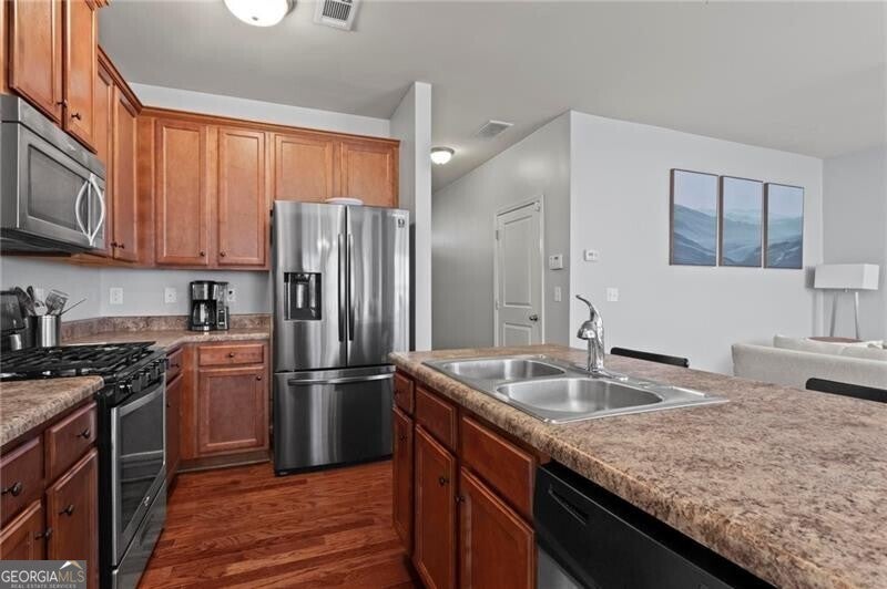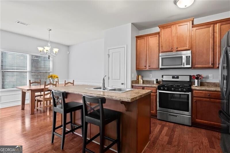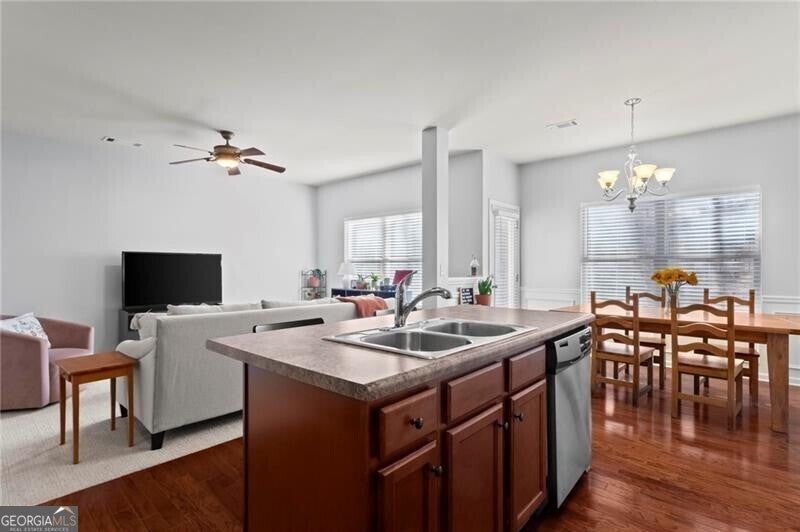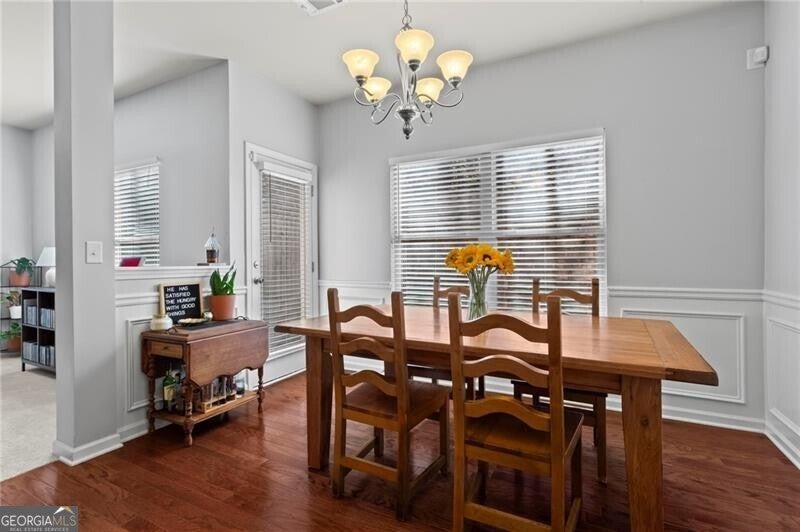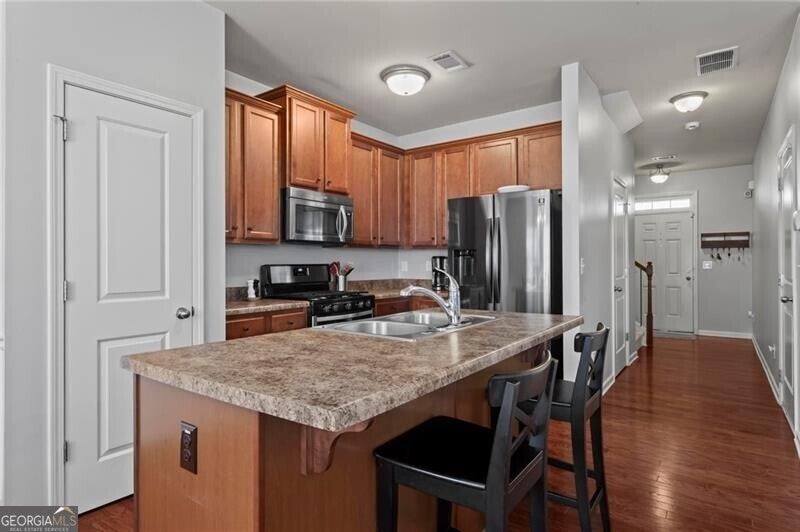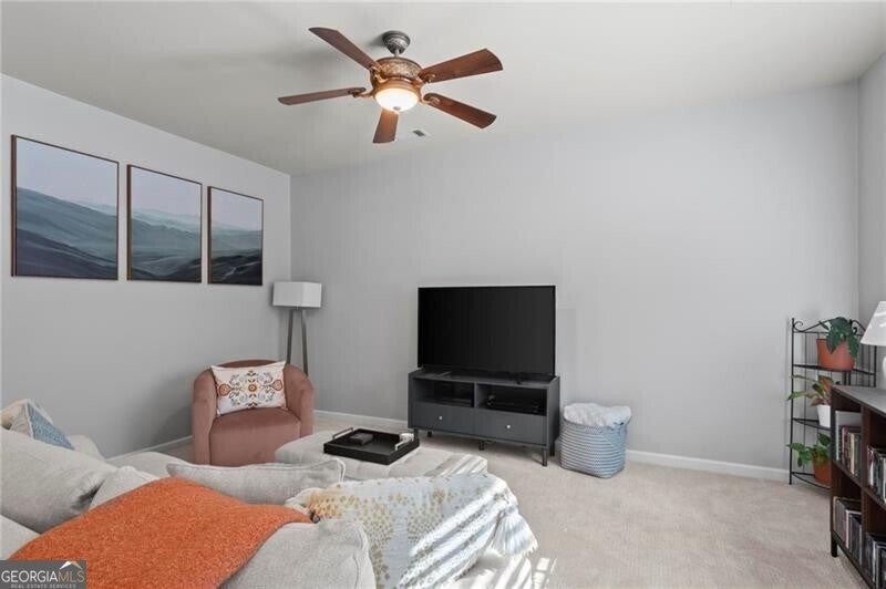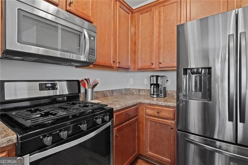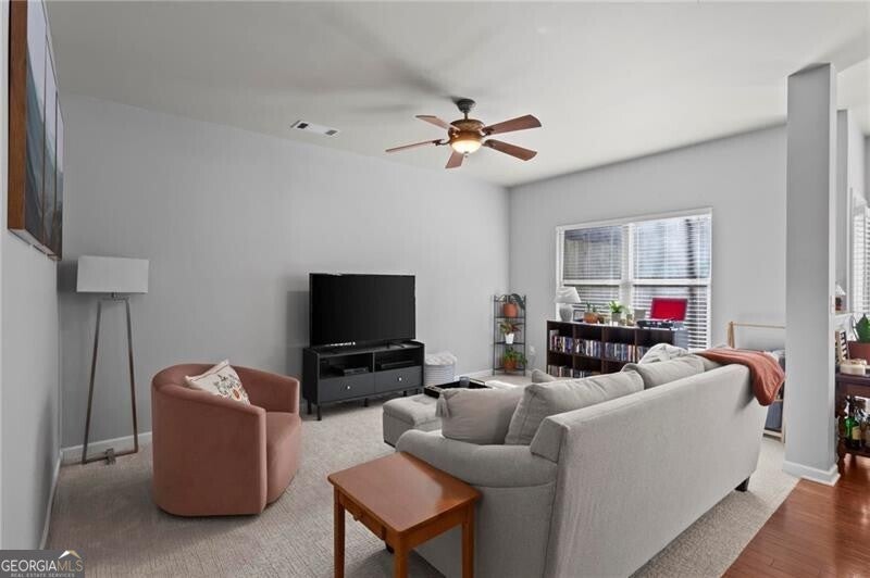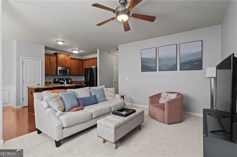 Welcome home to this move-in ready 2014 townhome, tucked inside a quiet, gated Marietta community with swim amenities and easy access to everything you need! Meticulously maintained, the home features brand new carpet upstairs and a bright, open main level designed for modern living, and complete with 9-foot ceilings. The kitchen overlooks both the dining area and living space and offers stainless steel appliances plus generous cabinet storage. The dining area opens to a private back patio, perfect for morning coffee, evening drinks, weekend grilling, and a cozy fire pit. Upstairs the owner's suite is a relaxing retreat with a trey ceiling, double vanity, and an impressively large walk-in closet ready for every season's wardrobe. Two additional bedrooms and a full bath provide flexible space for guests, family, or a home office. Enjoy peaceful wooded views from the patio, along with the convenience of a garage and excellent storage. Low-maintenance living is a breeze with HOA dues covering water, sewer, exterior maintenance, grounds and road care, trash, pool access, termite protection, fire and common-area insurance, and professional management. All of this just about 15 minutes from The Battery-home of the Atlanta Braves, fantastic restaurants, shopping, and year-round entertainment. This one checks all the boxes, don't miss it!