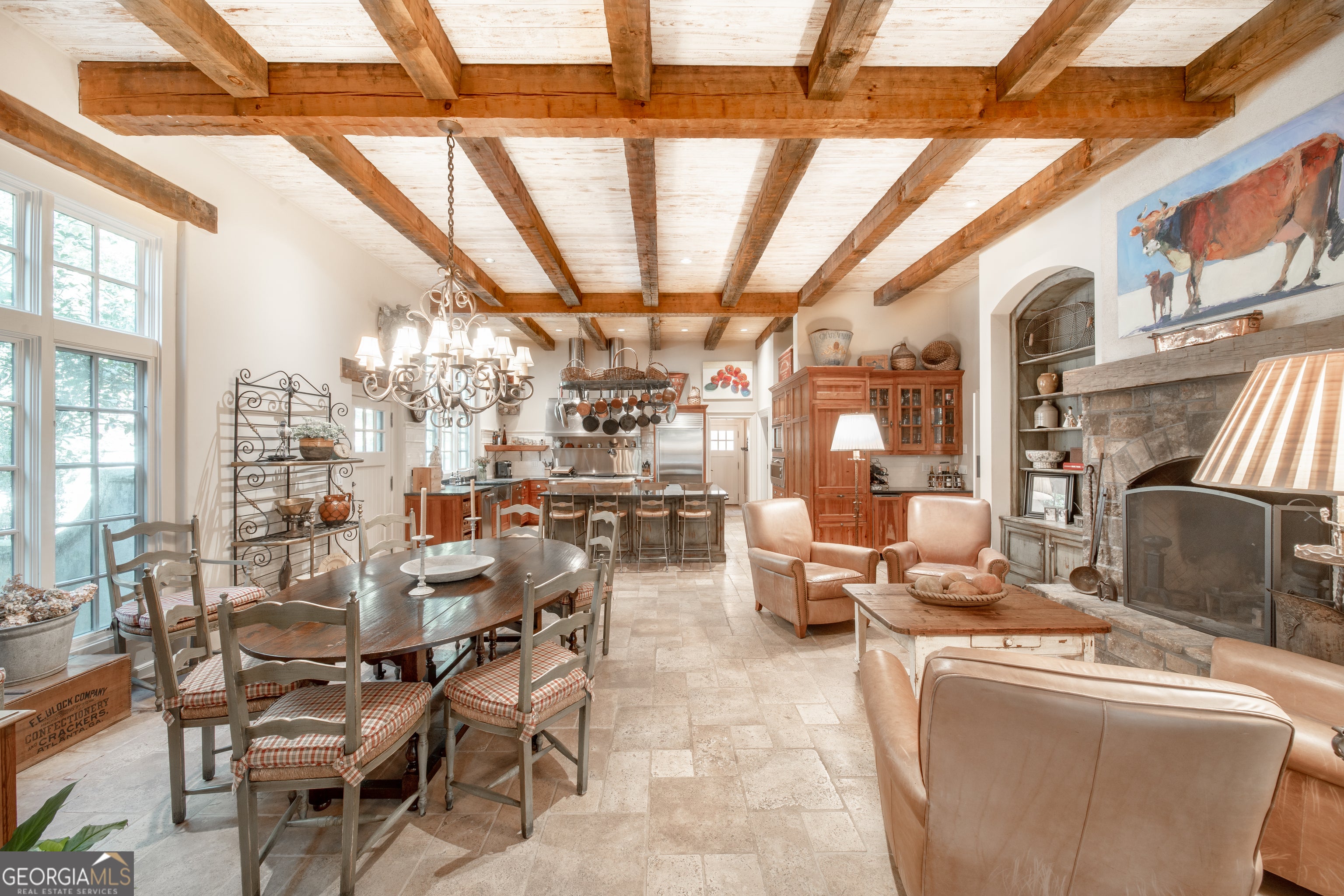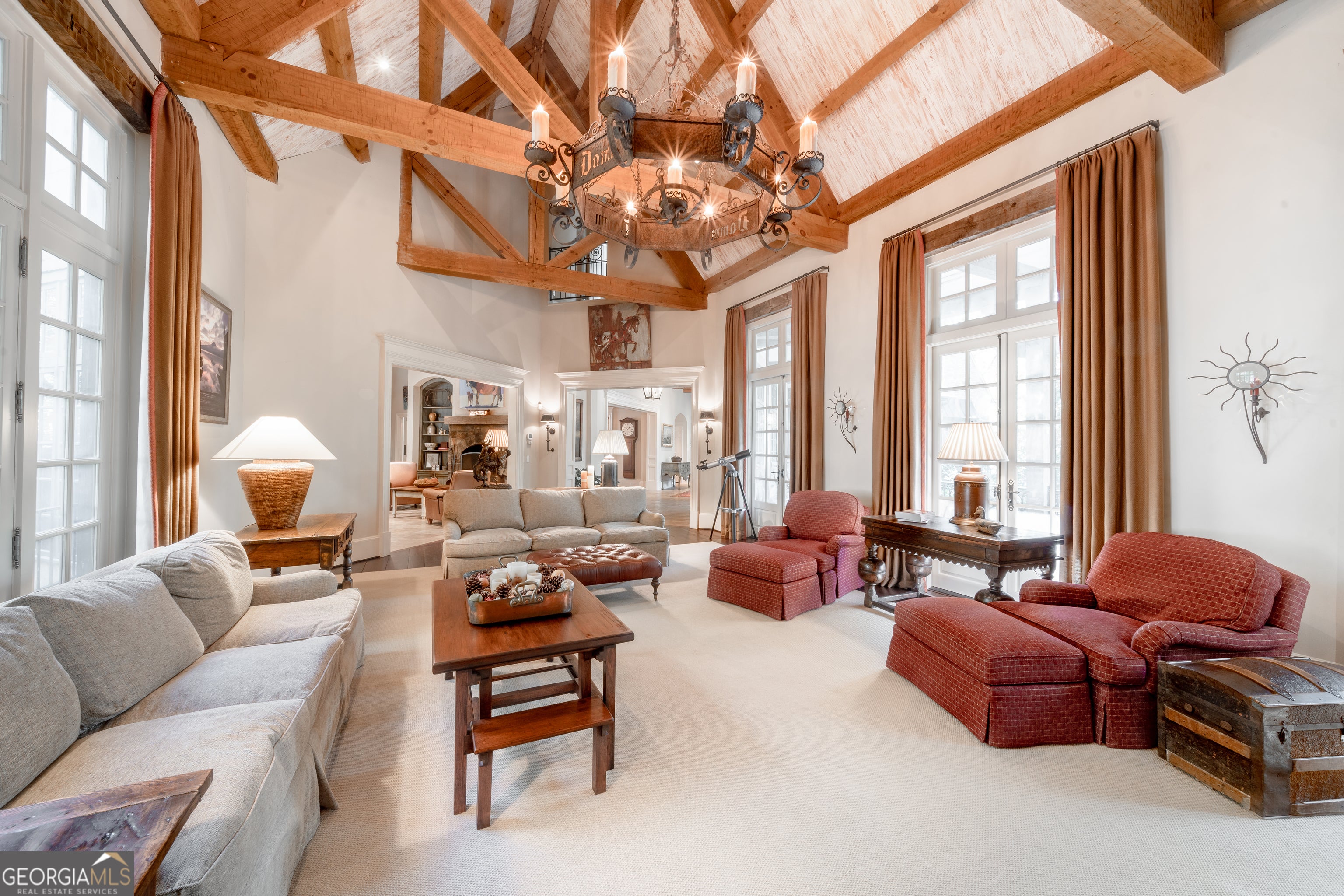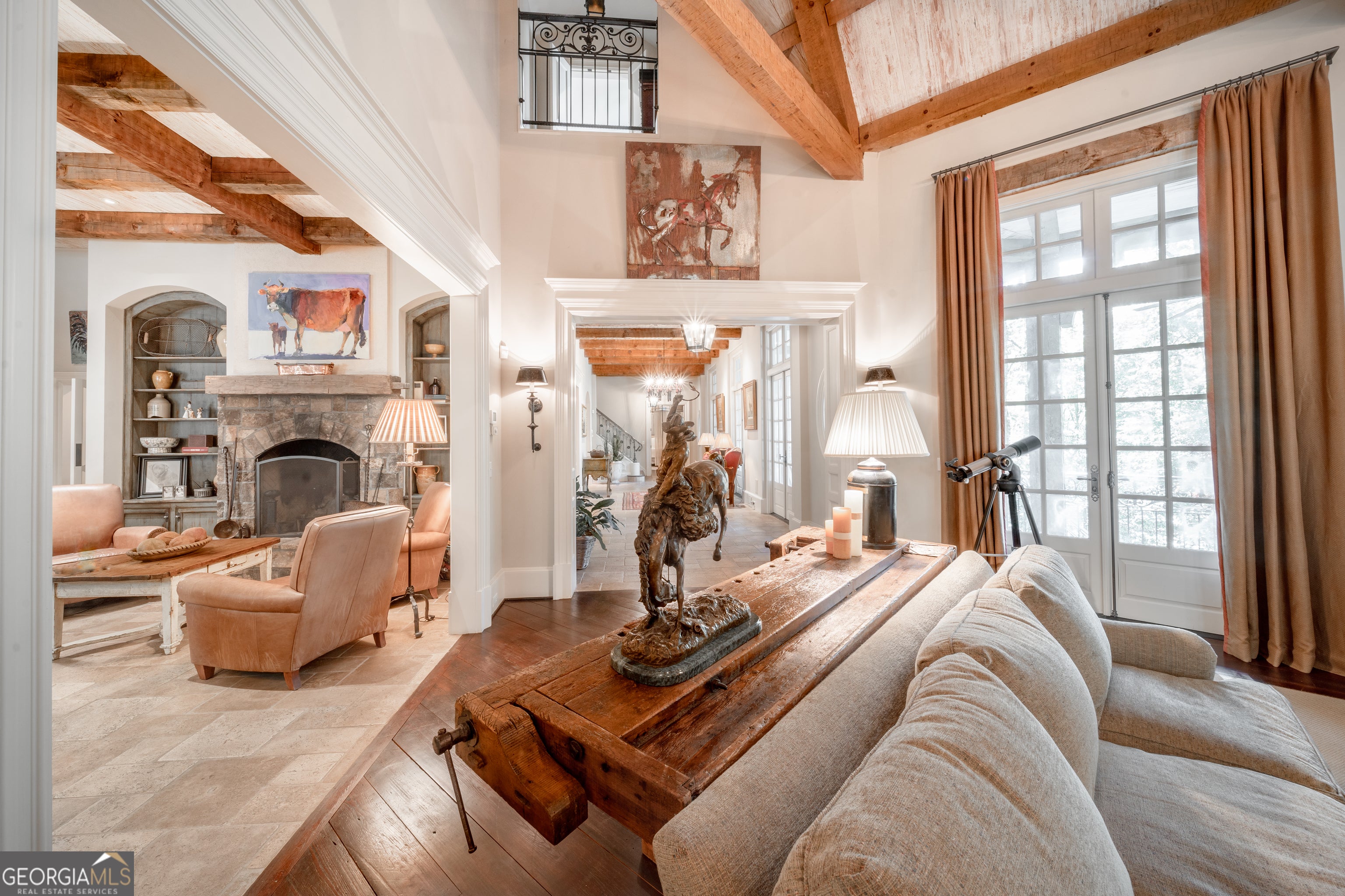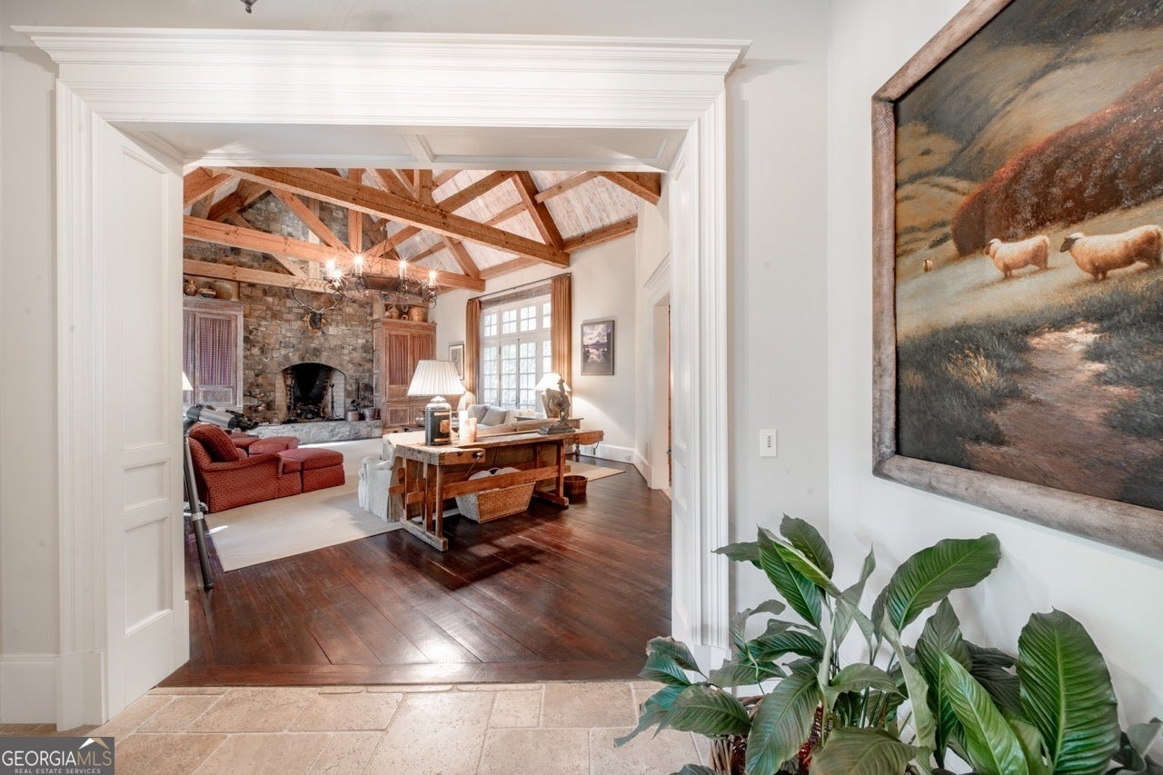 Welcome to Corbett Manor, an extraordinary 112-acre estate where refined luxury and natural beauty exist in perfect harmony. Just five minutes from downtown Clarkesville, this remarkable property offers an elevated lifestyle surrounded by private hardwood forests and impeccably maintained grounds. The stately exterior showcases timeless craftsmanship with a sophisticated blend of stone, brick, and hard-coat stucco, complemented by a slate roof and copper gutters. Through grand mahogany doors, the foyer welcomes you with Italian limestone flooring and soaring 13-foot ceilings. Limestone tile and rich heart pine floors flow throughout the main level, while floor-to-ceiling custom windows flood the home with natural light. A Lutron lighting system enhances both ambiance and ease of living. At the heart of the home, the chef's kitchen is designed for both beauty and performance, featuring commercial-grade appliances including dual Sub-Zero refrigerators and freezers, custom heart pine cabinetry, a DACOR dual-fuel range with double ovens, stainless steel hood, and a Gaggenau pizza oven. Granite and butcher-block countertops, an oversized island with prep sink, two dishwashers, and a limestone farmhouse sink complete the space. Adjacent, a cozy sitting area with heated floors, fireplace, and wet bar invites relaxed gatherings. The kitchen and dining area, seating ten overlook the private "secret garden"-a manicured courtyard with fountain, potting room, and built-in grill ideal for entertaining and alfresco dining. The primary suite is a serene retreat featuring a sitting area with fireplace and imported French marble mantel, a spa-inspired bath with heated floors, Jacuzzi tub, steam shower, custom dual-sided walk-in closet, and a private screened balcony. Just beyond, the library offers wormy chestnut paneling and a cozy fireplace. The second level hosts four spacious bedrooms, each with en-suite baths and walk-in closets. A Juliet balcony overlooks the Great Room with custom wood beams and soaring 26-foot vaulted ceilings. This level also includes a craft room and a private bedroom with bonus space and separate access above the three-car garage ideal for guests or a live-in nanny. Designed for entertaining, the terrace level features a game room with billiards, dry bar, fireplace, home theater, fitness room, and full bath, along with a generously sized laundry room, mudroom, and direct access to the property's dog run. Outdoor living spaces include a screened porch with bluestone flooring, expansive rear balcony, and courtyard cooking area, while imported antique French iron railings add old-world charm throughout. Additional features include a walk-in pantry, custom cabinetry, upgraded security system, abundant storage, and a beautifully gated entry. Corbett Manor is a rare sanctuary of timeless elegance, comfort, and thoughtful design offering an unparalleled luxury lifestyle in a truly remarkable setting.
